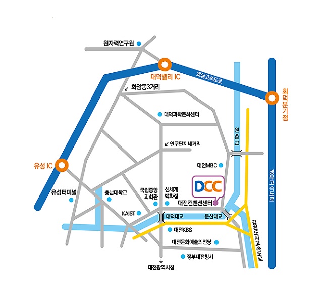 북대전 T.G 빠져나와 좌회전 (한국원자력연구소 사거리) → 대덕컨벤션센터 삼거리에서 우회전 → 엑스포과학공원 4거리에서 좌회전 → DCC |