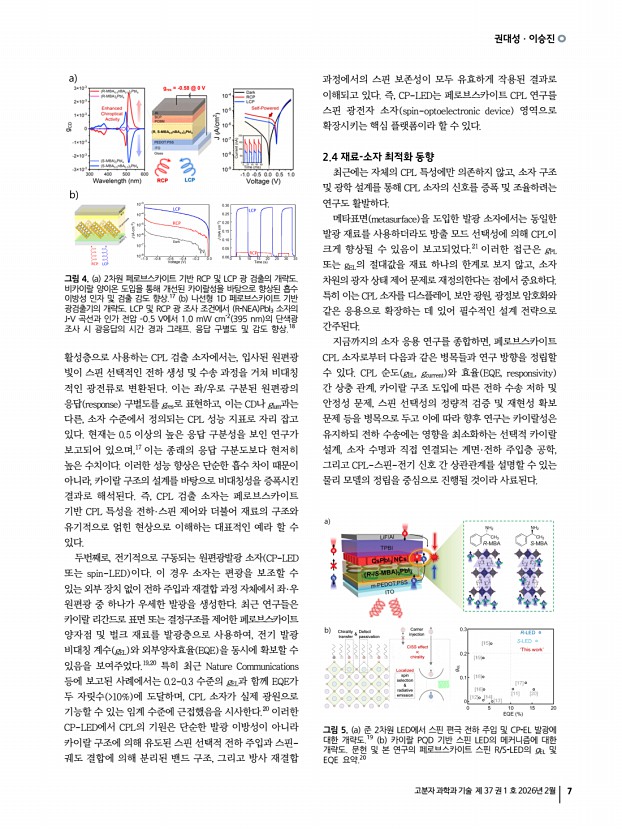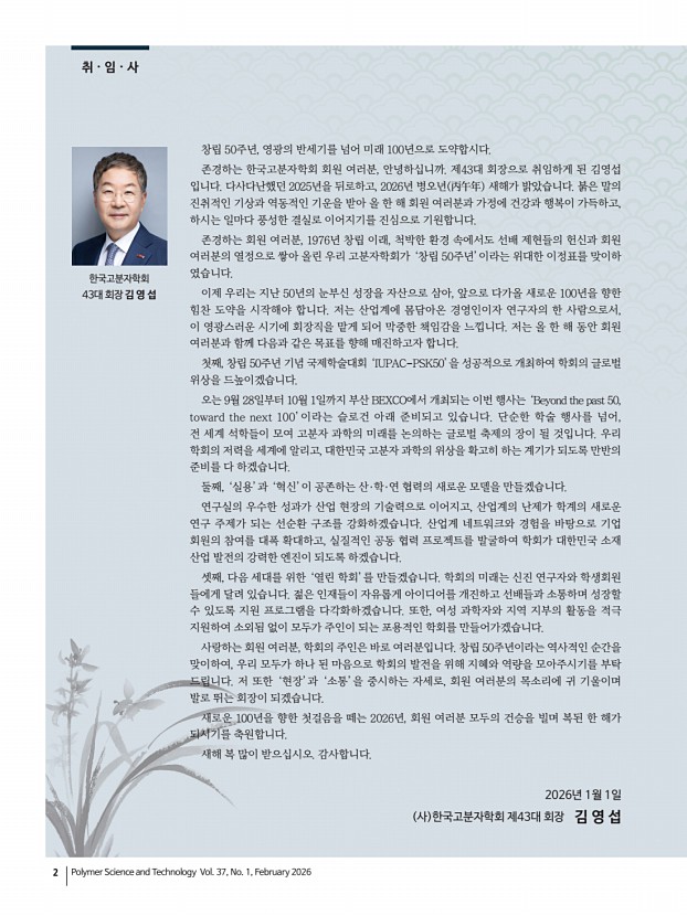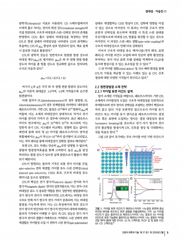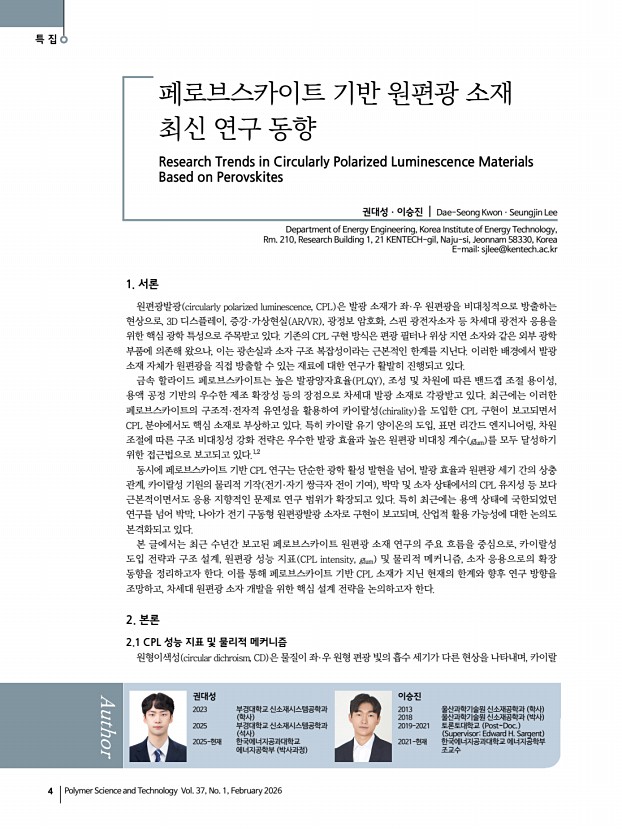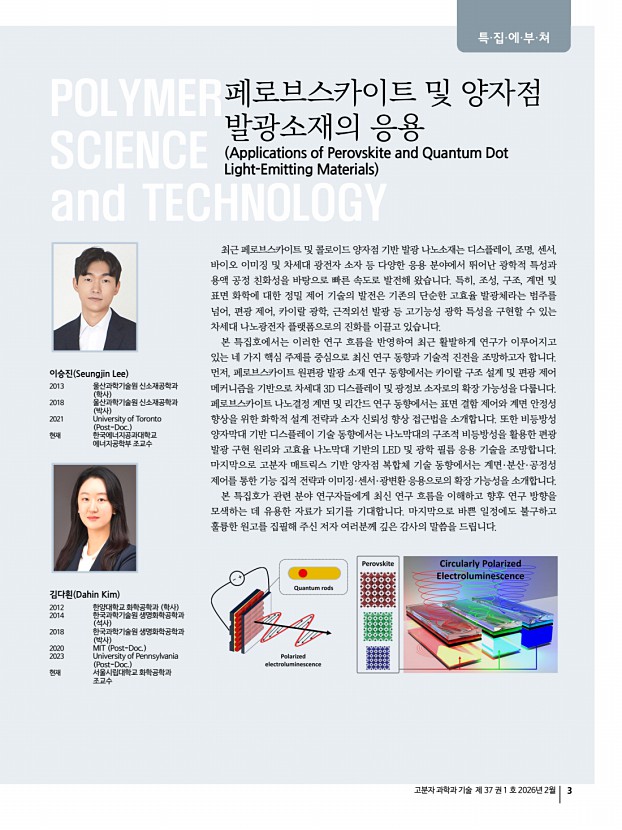 고분자 과학과 기술 제 37 권 1 호 2026년 2월 3 페로브스카이트 및 양자점 발광소재의 응용 Applications of Perovskite and Quantum Dot Light-Emitting Materials 최근 페로브스카이트 및 콜로이드 양자점 기반 발광 나노소재는 디스플레이, 조명, 센서, 바이오 이미징 및 차세대 광전자 소자 등 다양한 응용 분야에서 뛰어난 광학적 특성과 용액 공정 친화성을 바탕으로 빠른 속도로 발전해 왔습니다. 특히, 조성, 구조, 계면 및 표면 화학에 대한 정밀 제어 기술의 발전은 기존의 단순한 고효율 발광체라는 범주를 넘어, 편광 제어, 카이랄 광학, 근적외선 발광 등 고기능성 광학 특성을 구현할 수 있는 차세대 나노광전자 플랫폼으로의 진화를 이끌고 있습니다. 본 특집호에서는 이러한 연구 흐름을 반영하여 최근 활발하게 연구가 이루어지고 있는 네 가지 핵심 주제를 중심으...