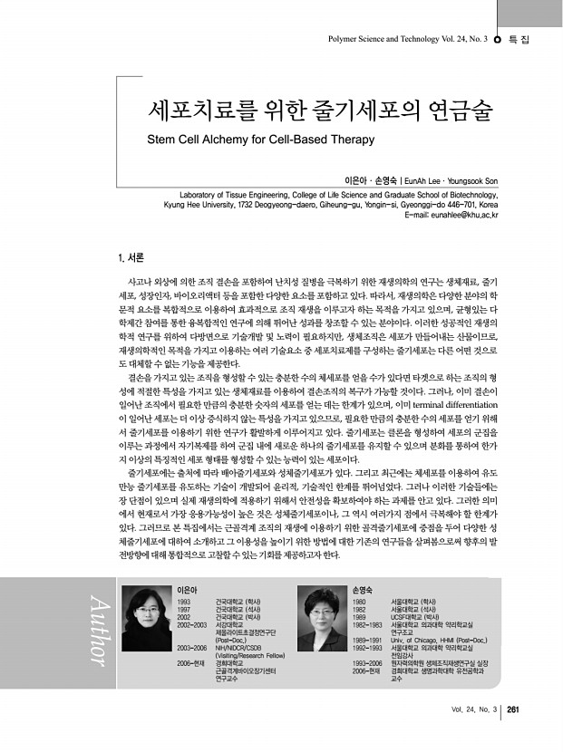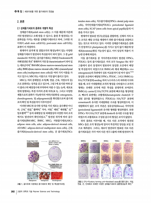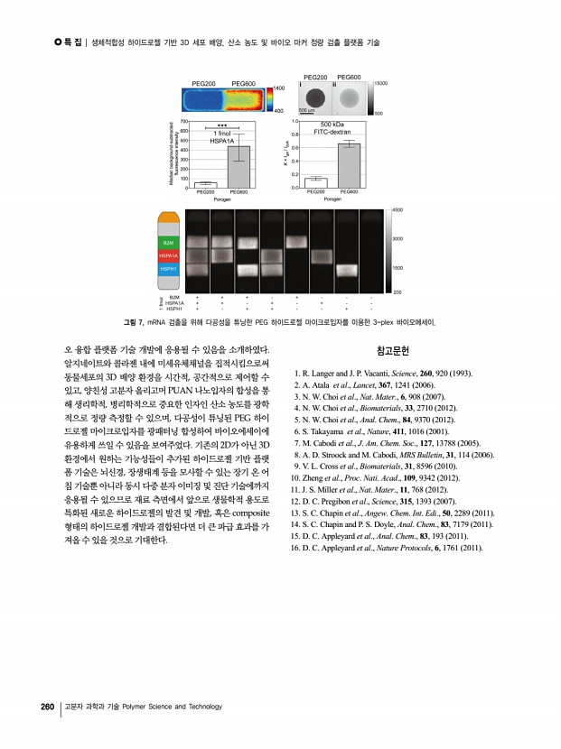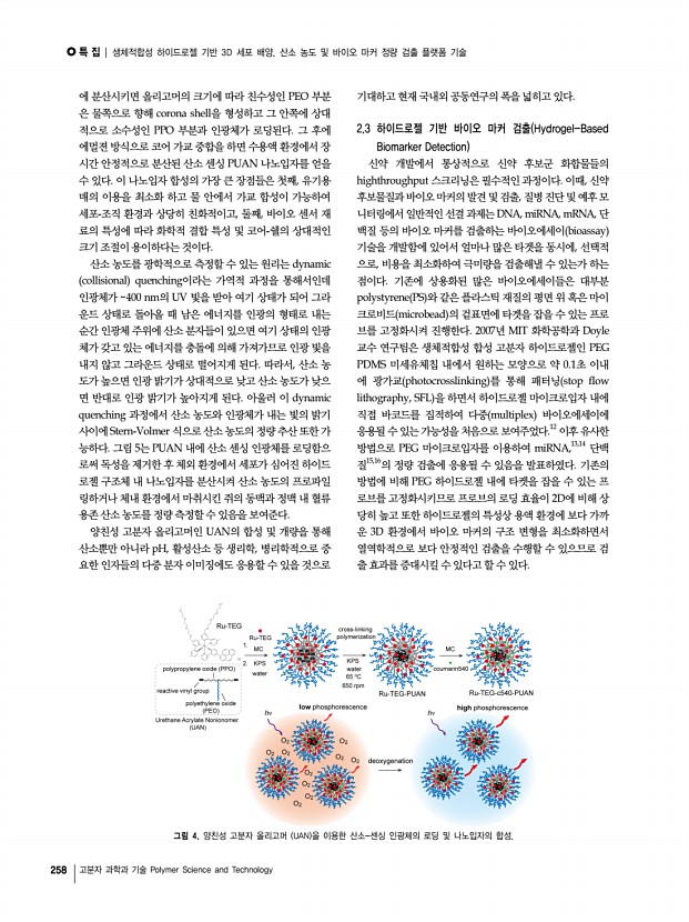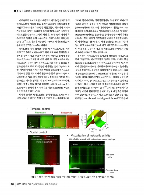 특 집 | 생체적합성 하이드로젤 기반 3D 세포 배양, 산소 농도 및 바이오 마커 정량 검출 플랫폼 기술 256 고분자 과학과 기술 Polymer Science and Technology 그림 2. 미세유체 마이크로채널을 이용한 하이드로젤 스캐폴드 내 시간적, 공간적 제어 및 대사활동의 모니터링. 미세유체적 하이드로젤 스캐폴드의 제작은 1 생체적합성 하이드로젤 내 세포를 심고, 2 마이크로채널 네트워크가 전 사된 PDMS 스탬프가 조립된 형틀 위층 , 외부에서 제어가 가능하도록 튜빙이 조립된 형틀 아래층 에 세포가 심어진 하 이드로젤을 주입하고 고형화 시킨 후, 3 두 층의 기계적 혹 은 화학적 결합을 통해 이루어진다. 그림 1은 2가 이온 예를 들어, Ca2+ 으로 가교가 가능한 알지네이트 하이드로젤을 이 용한 가공 공정을 보여주는 예이다. 하이드로젤 내에 집적된 미세유체 마이크로채...