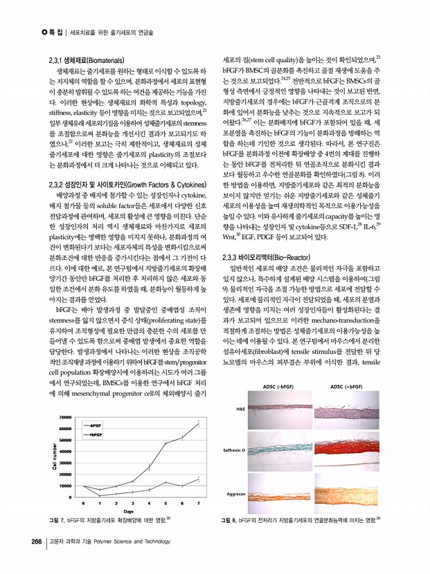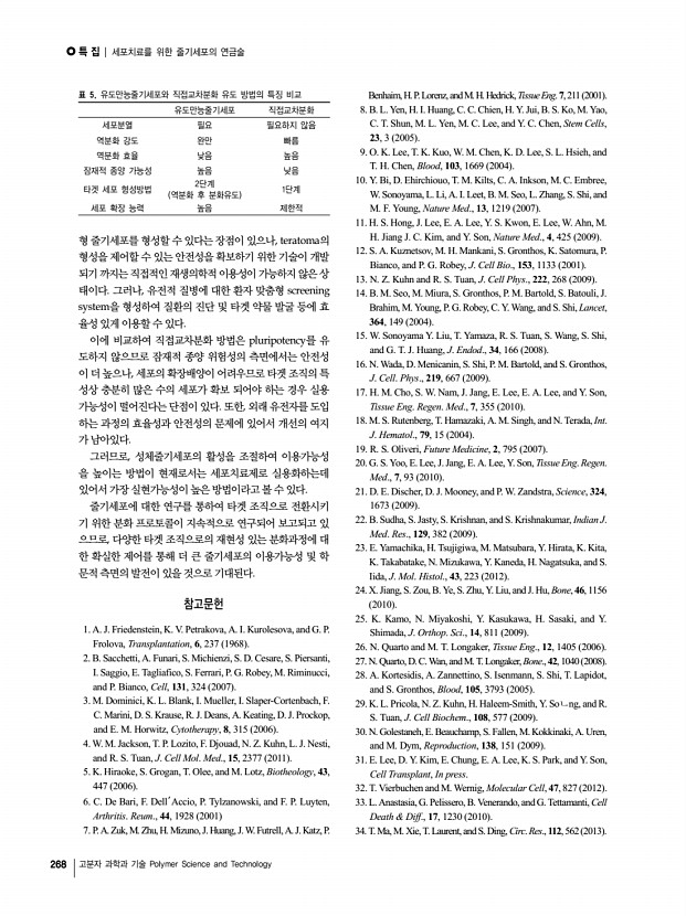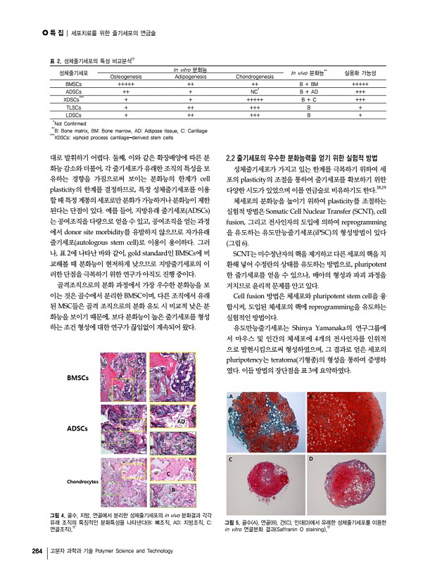 특 집 | 세포치료를 위한 줄기세포의 연금술 264 고분자 과학과 기술 Polymer Science and Technology 성체줄기세포 In vitro 분화능 In vivo 분화능** 실용화 가능성 Osteogenesis Adipogenesis Chondrogenesis BMSCs +++++ ++ ++ B + BM +++++ ADSCs ++ + NC* B + AD +++ XDSCs*** + + +++++ B + C +++ TLSCs + ++ +++ B + LDSCs + ++ +++ B + * Not Confirmed ** BBone matrix, BMBone marrow, ADAdipose tissue, CCartilage *** XDSCsxiphoid process cartilage-derived stem cells 표 2. 성체줄기세포의 특성 비교분석17 그림 4. 골수, 지방, 연골에서 분리한 성체줄기세포의 in vivo 분화결과 각각 유래 조직의 특징적인 분화특성을 나타낸다 B뼈조직, AD지방조직, C연골조직 .17 그림 5. 골수 A , 연골 B , 건 C , 인대 D 에서 유래한 성체줄기세포를 이용한 in vitro 연골분화 결과 Saffranin O staining .17 대로 발휘하기 어렵다. 둘째, 이와 같은 확장배양에 따른 분 화능 감소와 ...