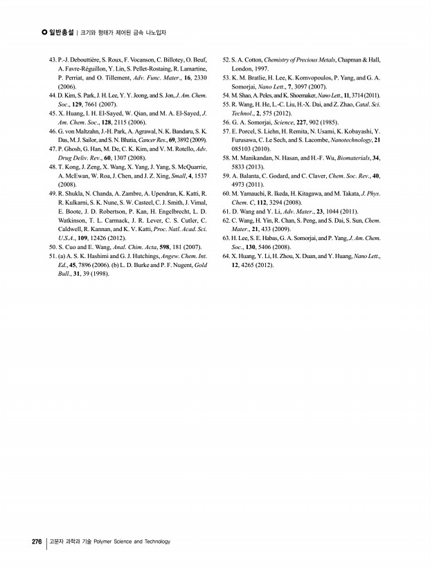 일반총설 | 크기와 형태가 제어된 금속 나노입자 276 고분자 과학과 기술 Polymer Science and Technology 43. P.-J. Debouttière, S. Roux, F. Vocanson, C. Billotey, O. Beuf, A. Favre-Réguillon, Y. Lin, S. Pellet-Rostaing, R. Lamartine, P. Perriat, and O. Tillement, Adv. Func. Mater., 16, 2330 2006 44. D. Kim, S. Park, J. H. Lee, Y. Y. Jeong, and S. Jon, J. Am. Chem. Soc., 129, 7661 2007 45. X. Huang, I. H. El-Sayed, W. Qian, and M. A. El-Sayed, J. Am. Chem. Soc., 128, 2115 2006 46. G. von Maltzahn, J.-H. Park, A. Agrawal, N. K. Bandaru, S. K. Das, M. J. Sailor, and S. N. Bhatia, Cancer Res., 69, 3892 2009 47. P. Ghosh, G. Han, M. De, C. K. Kim, and V. M. Rotello, Adv. Drug Deliv. Rev., 60, 1307 2008 48. T. Kong, J. Zeng, X. Wang, X. Yang, J. Yang, S. McQuarrie, A. McEwan, W. Roa, J. Chen, and J. Z. Xing, Small, 4, 1537 2008 49. R. Shukla, N. Chanda, A. Zambre, A. Upendran, K. Katti, R. R. Kulkarni, S. K. Nune, S. W. Casteel, C. J. Smith, J. Vimal, E. Boote, J. D. ...