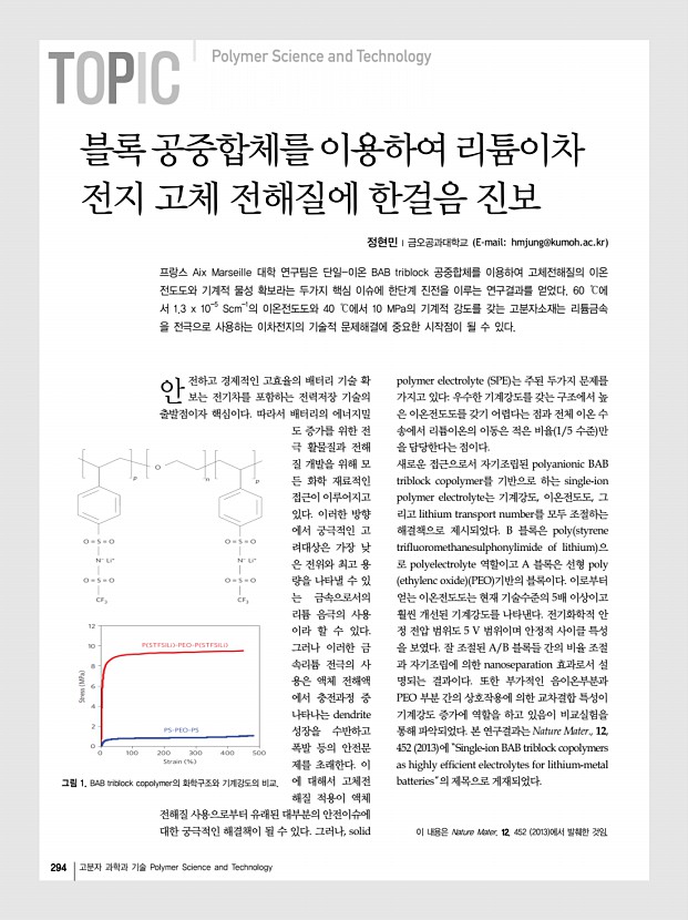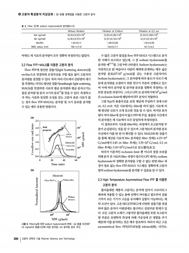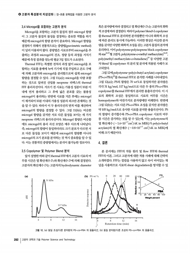 고분자 특성분석 지상강좌 | 장-흐름 분획법을 이용한 고분자 분석 292 고분자 과학과 기술 Polymer Science and Technology a b 그림 12. a 동일 조성/다른 분자량의 PS-co-PBA 의 용출곡선, b 동일 분자량/다른 조성의 PS-co-PBA 의 용출곡선. 3.4 Microgel을 포함하는 고분자 분석 Microgel을 포함하는 고분자 물질의 경우 microgel 함량 이 그 고분자 물질의 물성을 결정하는 중요한 역할을 하기 때문에 microgel의 함량 분석이 중요하다. Microgel 함량을 결정하기 위해서 전통적으로는 중량법 gravimetric method 이 널리 이용되어 왔다. 중량법은 시료로부터 microgel을 추 출하는 과정과 microgel의 건조, 정량 등의 과정을 거치기 때문에 측정 결과를 얻는데 평균 3일 정도가 소요된다. Thermal FFF는 특별한 전처리 과정 없이 microgel을 포 함하는 시료를 용매에 녹여 기기에 직접 주입하고 온도 구배 ...