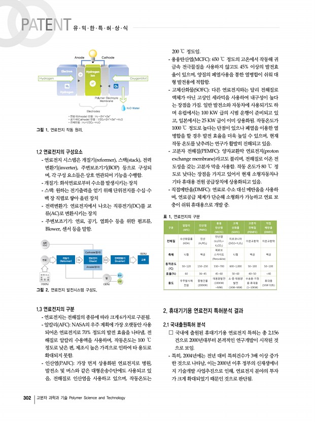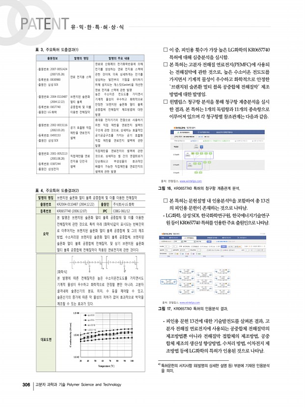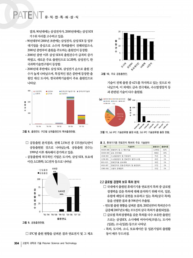 304 고분자 과학과 기술 Polymer Science and Technology 그림 10. 주요 공동출원인. 결과, 90년대에는 삼성전자가, 2000년대에는 삼성 SDI 가 1위 자리를 고수하고 있음. 90년대부터 2000년 초반에는 삼성전자, 삼성 SDI 등일부 대기업을 중심으로 소수의 특허출원이 진해되었으나, 2000년 중반부터 출원을 주도하는 출원인이 등장함. 2000년 중반 이후 삼성 SDI의 출원건수가 급격히 증가 하였고, 새로운 주요 출원인으로 LG화학, 삼성전기, 한 국과학기술연구원이 등장함. 2000년대 후반에도 삼성 SDI, 삼성전기 순으로 출원 건 수가 높게 나타났으며, 특징적인 점은 중반에 등장한 출 원인 대신 도시바, 한국과학기술원이 주요 출원인으로 나타남. 그림 8. 출원연도 구간별 상위출원인의 특허출원현황. □ 공동출원 분석결과, 전체 2,156건 중 133건 6% 만이 공동출원된 것으로 나타났...