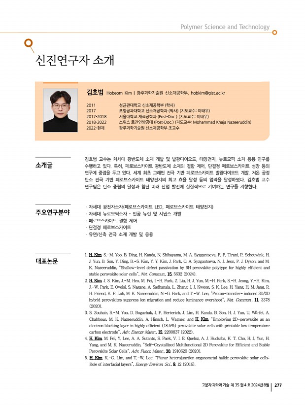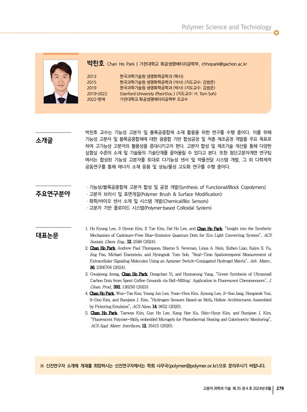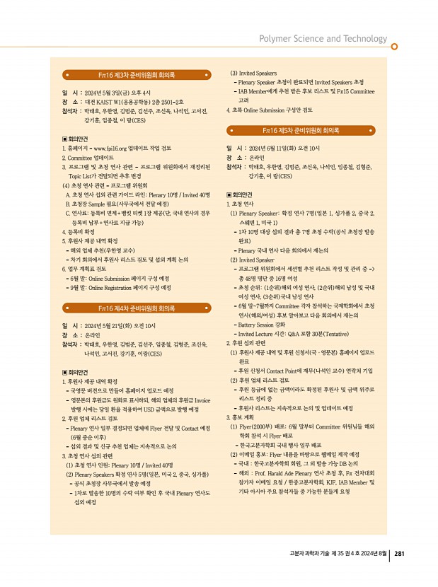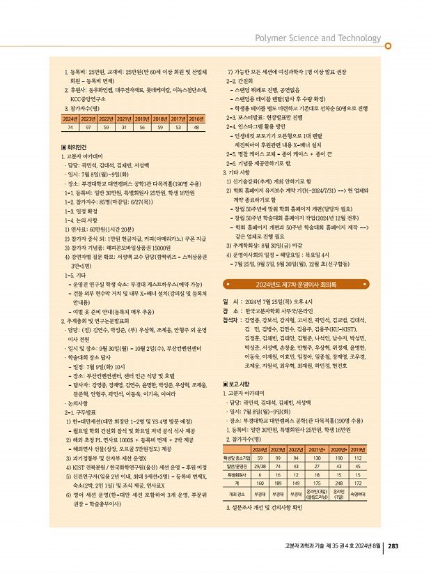 고분자 과학과 기술 제 35 권 4 호 2024년 8월 283 1. 등록비25만원, 교재비25만원 만 60세 이상 회원 및 산업체 회원 등록비 면제 2. 후원사동우화인켐, 대주전자재료, 롯데케미칼, 이녹스첨단소재, KCC중앙연구소 3. 참가자수 명 2024년 2023년 2022년 2021년 2019년 2018년 2017년 2016년 74 97 59 31 56 59 53 48 ▣ 회의안건 1. 고분자 아카데미 · 담당곽민석, 김대석, 김채빈, 서성백 · 일시7월 8일 월 9일 화 · 장소부경대학교 대연캠퍼스 공학1관 다목적홀 190명 수용 1-1. 등록비일반 30만원, 특별회원사 25만원, 학생 16만원 1-2. 참가자수85명 마감일6/27 목 1-3. 일정 확정 1-4. 논의 사항 1 연사료60만원 1시간 20분 2 참가자 중식 외1만원 현금지급, 커피 아메리카노 쿠폰 지급 3 참가자 기념품해피콘모바일상품권 15000원 4 강연자별 질문 확보서성백 교수 담당 깜짝퀴즈 스벅상품권 3만*5명...
