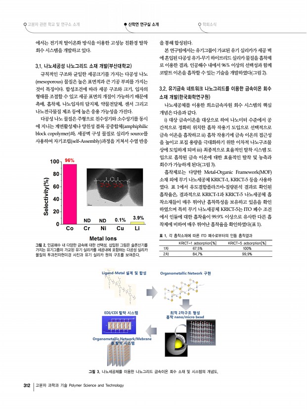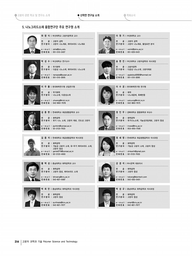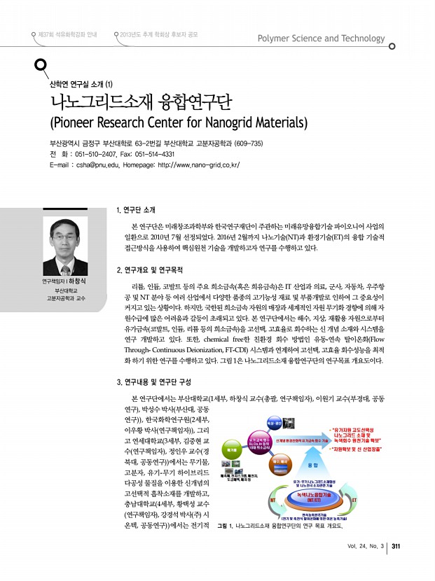 ... 연구책임자l하창식 부산대학교 고분자공학과 교수 그림 1. 나노그리드소재 융합연구단의 연구 목표 개요도. 산학연 연구실 소개 1 나노그리드소재 융합연구단 Pioneer Research Center for Nanogrid Materials 부산광역시 금정구 부산대학로 63-2번길 부산대학교 고분자공학과 609-735 전 화 051-510-2407, Fax051-514-4331 E-mail csha@pnu.edu, Homepagehttp//www.nano-grid.co.kr/ 1. 연구단 소개 본 연구단은 미래창조과학부와 한국연구재단이 주관하는 미래유망융합기술 파이오니어 사업의 일환으로 2010년 7월 선정되었다. 2016년 2월까지 나노기술 NT 과 환경기술 ET 의 융합 기술적 접근방식을 사용하여핵심원천 기술을 개발하고자 연구를 수행하고 있다. 2. 연구개요 및 연구목적 리튬, 인듐, 코발트 등의 주요 희소금속 혹은 희유금속 은 IT 산업과 의료, 군사, 자동차, 우주항 공 및 NT 분야 등 여...