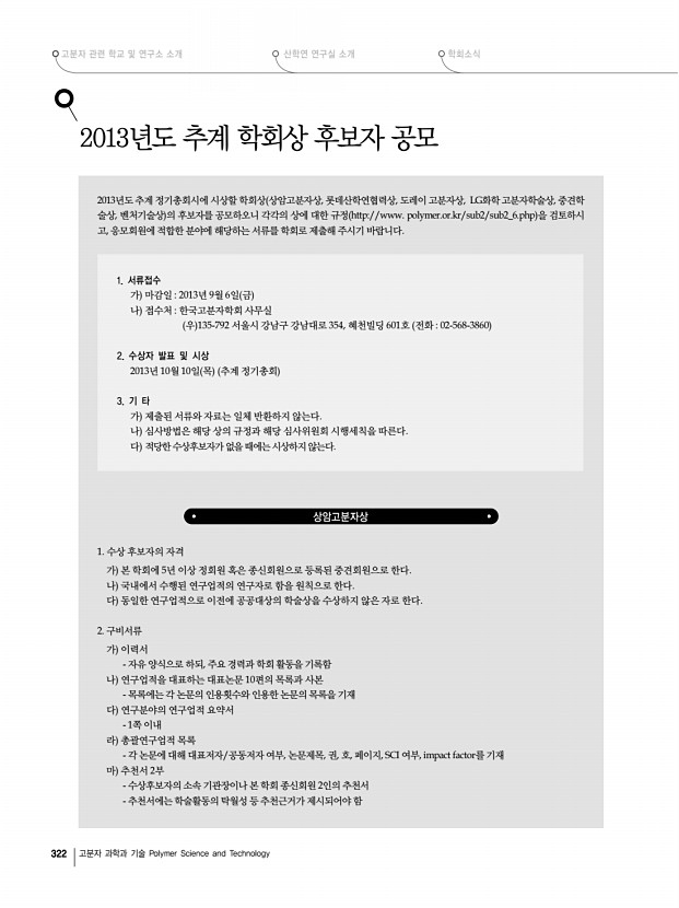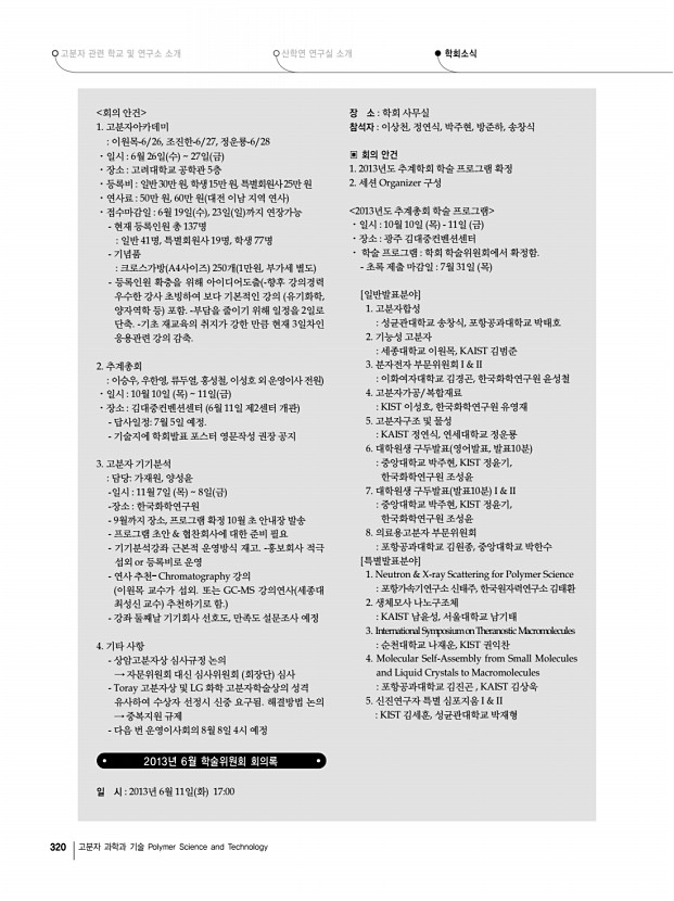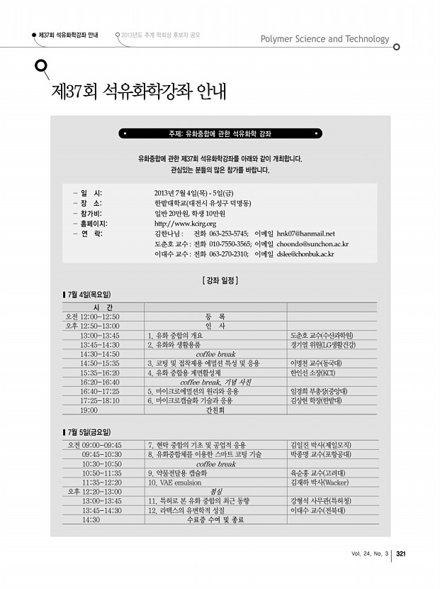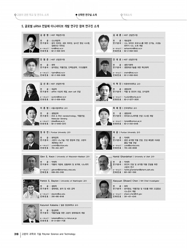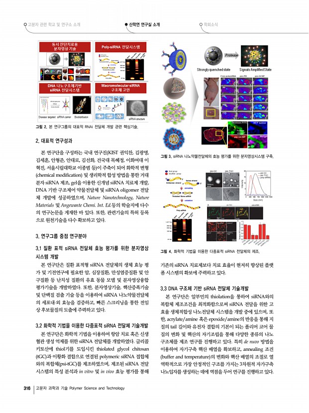 고분자 관련 학교 및 연구소 소개 산학연 연구실 소개 학회소식 316 고분자 과학과 기술 Polymer Science and Technology 그림 2. 본 연구그룹의 대표적 RNAi 전달체 개발 관련 핵심기술. 그림 3. siRNA 나노약물전달체의 효능 평가를 위한 분자영상시스템 구축. 그림 4. 화학적 기법을 이용한 다중표적 siRNA 전달체의 제조. 2. 대표적 연구성과 본 연구단을 구성하는 국내 연구진 KIST 권익찬, 김광명, 김세훈, 안형준, 안대로, 김선화, 건국대 목혜정, 이화여대 이 혁진, 서울시립대학교 이종범 등 이 주축이 되어 화학적 변형 chemical modification 및 생리학적 합성 방법을 통한 거대 분자 siRNA 제조, gel을 이용한 신개념 siRNA 치료제개발, DNA 기반 구조제어 약물전달체 및 siRNA oligomer 전달 체 개발에 성공하였으며, Nature Nanotechnology, Nature Materials 및 Angewante Chemi. Int. Ed.등의 학술지에 ...