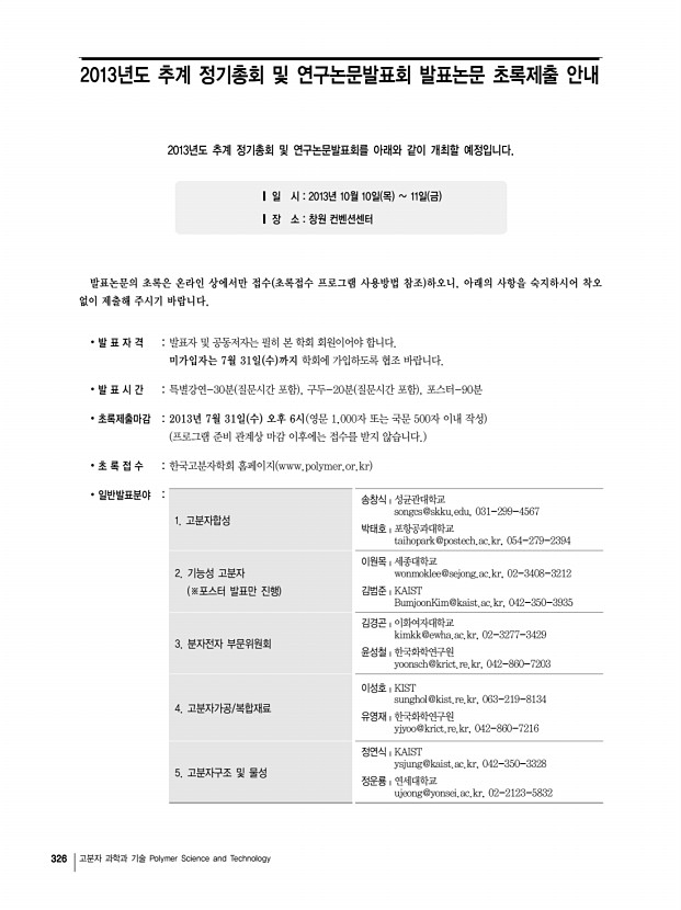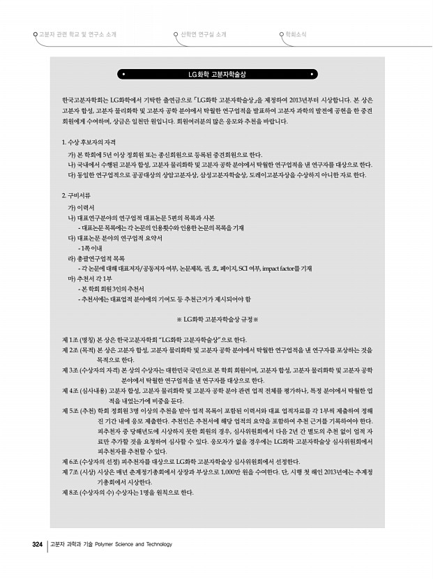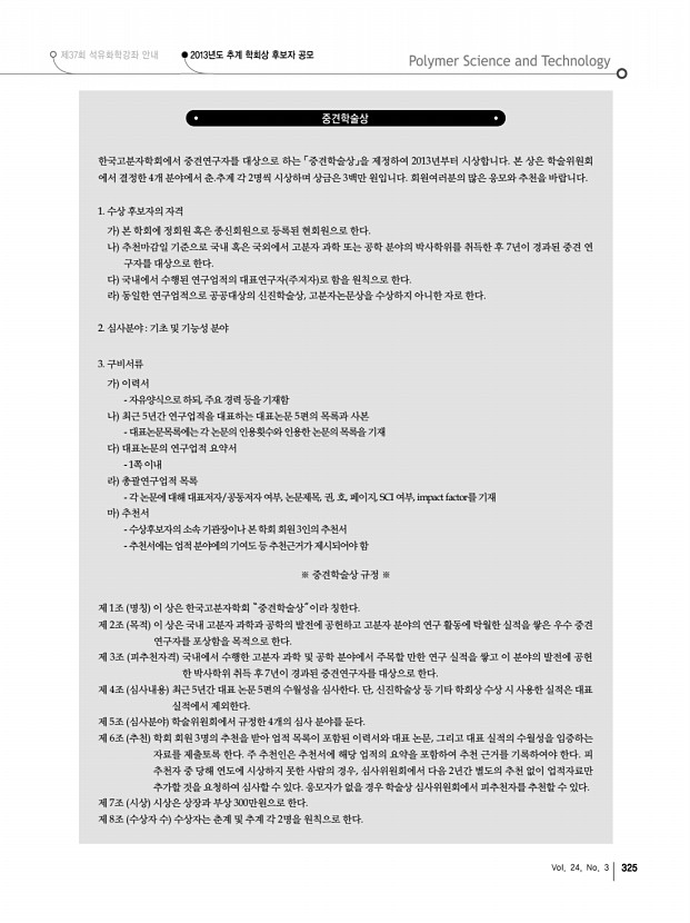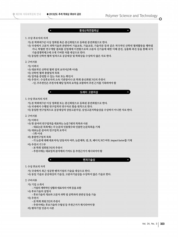 제37회 석유화학강좌 안내 2013년도 추계 학회상 후보자 공모 Vol. 24, No. 3 323 롯데산학연협력상 1. 수상 후보자의 자격 가 본 학회에 5년 이상 정회원 혹은 종신회원으로 등록된 중견회원으로 한다. 나 국내에서 고분자 과학기술과 관련하여 기술교육, 기술교류, 기술자문 등과 같은 적극적인 산학연 협력활동을 행하였 거나, 탁월한 연구개발 결과를 산업계에 이전함으로써 고분자 신기술에 대한 이해 증진, 실용화 촉진 등을 통해 국가 기술경쟁력제고에 크게 기여한 자를 대상으로 한다. 다 동일한 산학연 협력 업적으로 공공대상 및 학회상을 수상하지 않은 자로 한다. 2. 구비서류 가 이력서 나 대표적인 산학연 협력 업적 요약서 3쪽 이내 다 산학연 협력 총괄업적 목록 라 업적을 증빙할 수 있는 자료 또는 확인서 마 추천서 수상후보자의 소속 기관장이나...