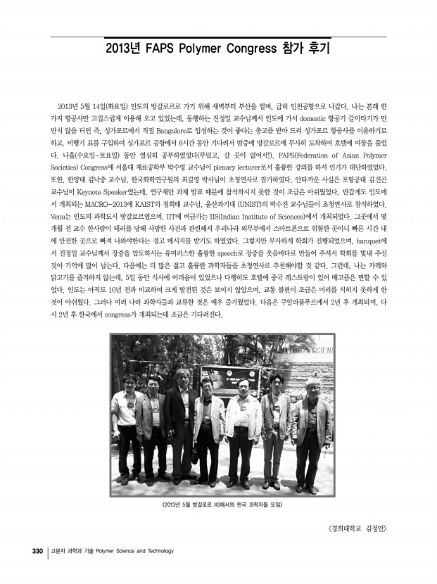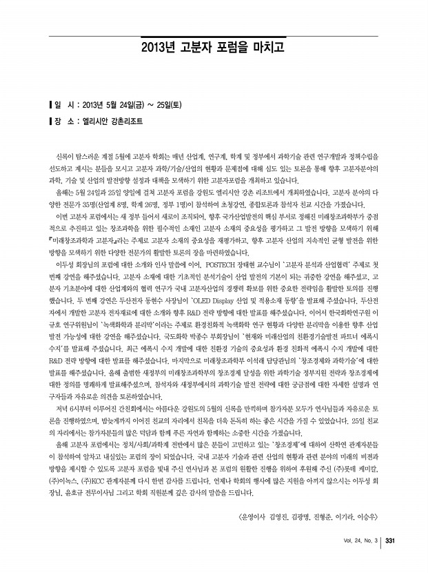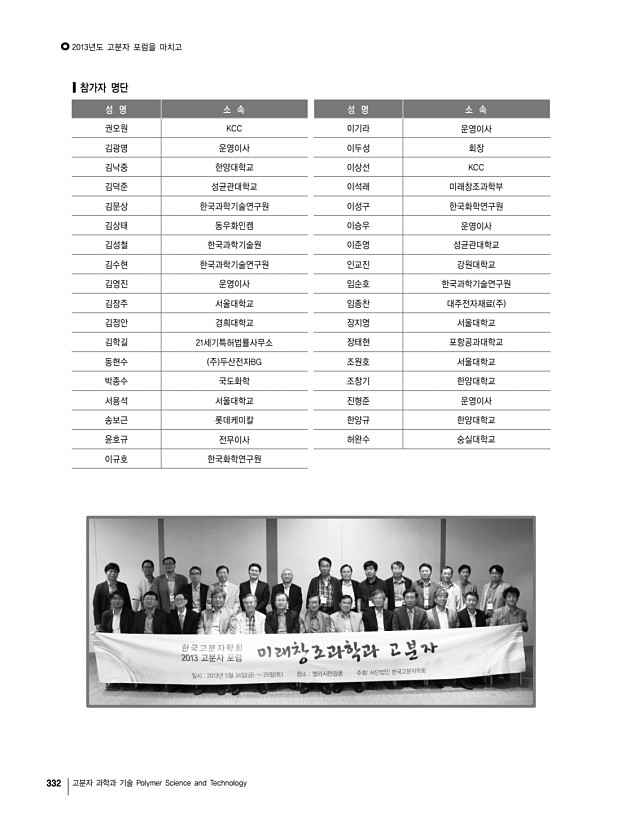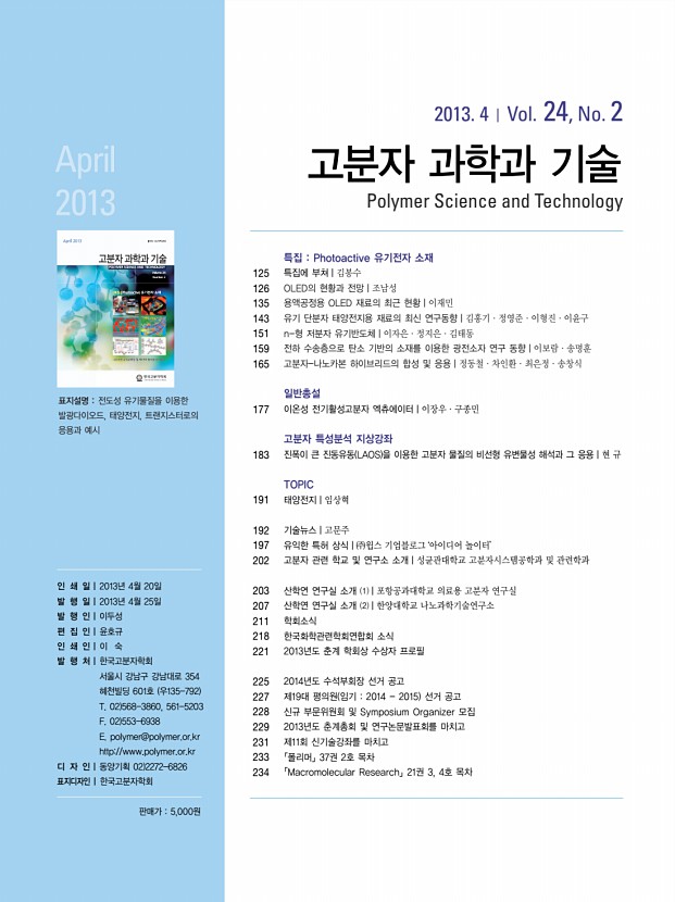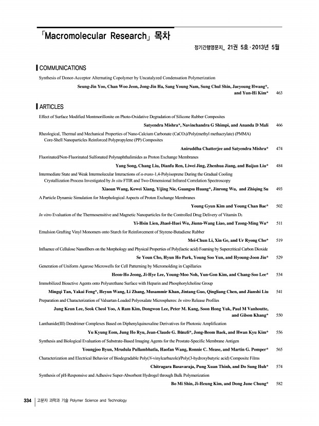 334 고분자 과학과 기술 Polymer Science and Technology 「Macromolecular Research」목차 정기간행영문지_ 21권 5호 ․ 2013년 5월 COMMUNICATIONS Synthesis of Donor-Acceptor Alternating Copolymer by Uncatalyzed Condensation Polymerization Seung-Jin Yoo, Chan Woo Jeon, Jong-Jin Ha, Sang Young Nam, Sung Chul Shin, Jaeyoung Hwang*, and Yun-Hi Kim* 463 ARTICLES Effect of Surface Modified Montmorillonite on Photo-Oxidative Degradation of Silicone Rubber Composites Satyendra Mishra*, Navinchandra G Shimpi, and Ananda D Mali 466 Rheological, Thermal and Mechanical Properties of Nano-Calcium Carbonate CaCO3 /Poly methyl methacrylate PMMA Core-Shell Nanoparticles Reinforced Polypropylene PP Composites Aniruddha Chatterjee and Satyendra Mishra* 474 Fluorinated/Non-Fluorinated Sulfonated Polynaphthalimides as Proton Exchange Membranes Yang Song, Chang Liu, Dianfu Ren, Liwei Jing, Zhenhua Jiang, and Baijun Liu* 484 Intermediate State and Weak Intermolecular Interactions of α-tra...