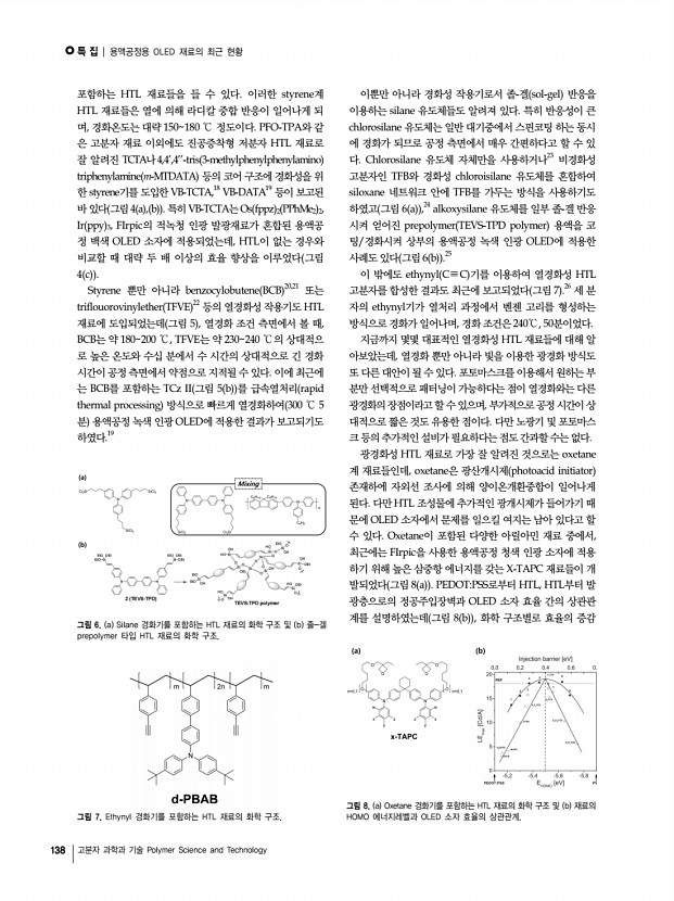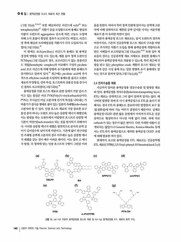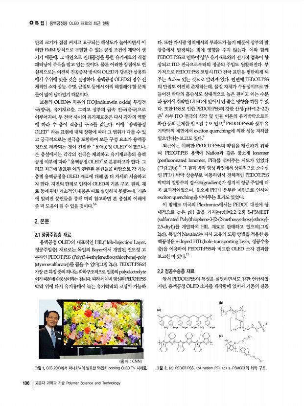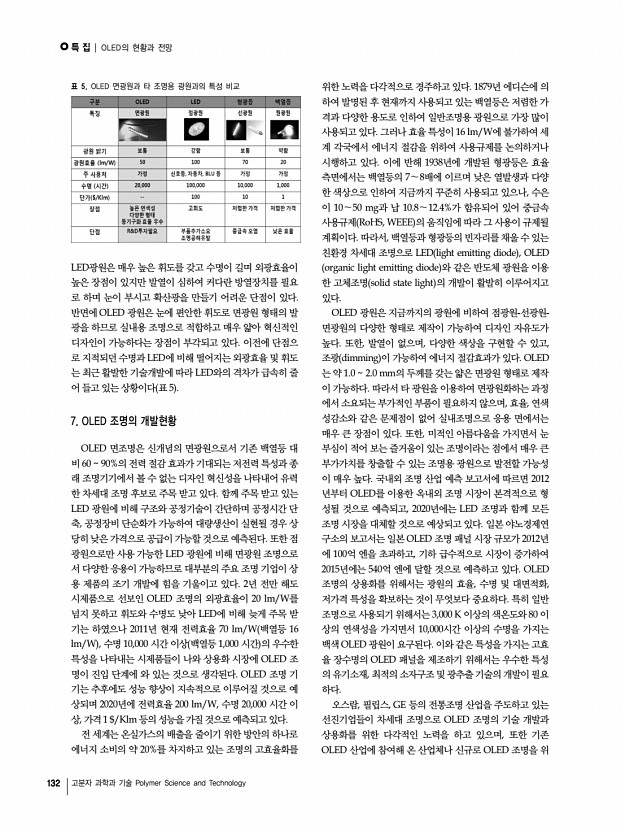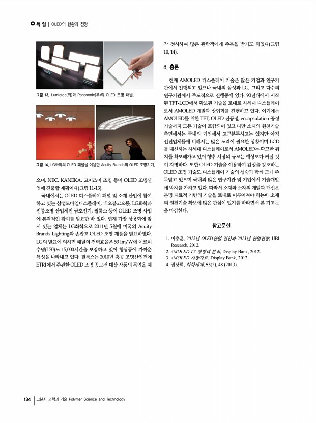 특 집 | OLED의 현황과 전망 134 고분자 과학과 기술 Polymer Science and Technology 그림 13. Lumiotec 좌 과 Panasonic 우 의 OLED 조명 패널. 그림 14. LG화학의 OLED 패널을 이용한 Acuity Brands의 OLED 조명기기. 으며, NEC, KANEKA, 고이즈미 조명 등이 OLED 조명산 업에 진출할 계획이다 그림 11-13 국내에서는 OLED 디스플레이 패널 및 소재 산업에 참여 하고 있는 삼성모바일디스플레이, 네오뷰코오롱, LG화학과 전통조명 산업체인 금호전기, 필룩스 등이 OLED 조명 사업 에 본격적인 참여를 발표한 바 있다. 현재 가장 상용화에 앞 서 있는 업체는 LG화학으로 2011년 5월에 미국의 Acuity Brands Lighting과 손잡고 OLED 조명 제품을 발표하였다. LG의 발표에 의하면 패널의 전력효율은 53 lm/W에 이르며 수명 L70 도 15,000시간을 보장하고 있어 형광등에 가까운 특성을 나타내고 있다. 필룩스는 2010년 홍...