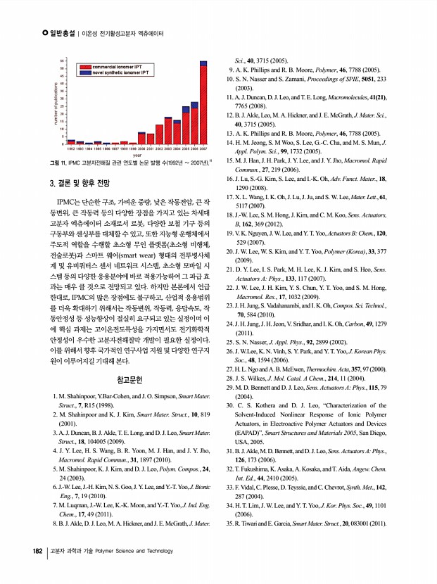 일반총설 | 이온성 전기활성고분자 엑츄에이터 182 고분자 과학과 기술 Polymer Science and Technology 그림 11. IPMC 고분자전해질 관련 연도별 논문 발행 수 1992년 2007년 .11 3. 결론 및 향후 전망 IPMC는 단순한 구조, 가벼운 중량, 낮은 작동전압, 큰 작 동변위, 큰 작동력 등의 다양한 장점을 가지고 있는 차세대 고분자 엑츄에이터 소재로서 로봇, 다양한 보철 기구 등의 구동부와 센싱부를 대체할 수 있고, 또한 지능형 운행체에서 주도적 역할을 수행할 초소형 무인 플랫폼 초소형 비행체, 전술로봇 과 스마트 웨어 smart wear 형태의 전투병사체 계 및 유비쿼터스 센서 네트워크 시스템, 초소형 모바일 시 스템 등의 다양한 응용분야에 바로 적용가능하여 그 파급 효 과는 매우 클 것으로 전망되고 있다. 하지만 본론에서 언급 한대로, IPMC의 많은 장점에도 불구하고, 산...