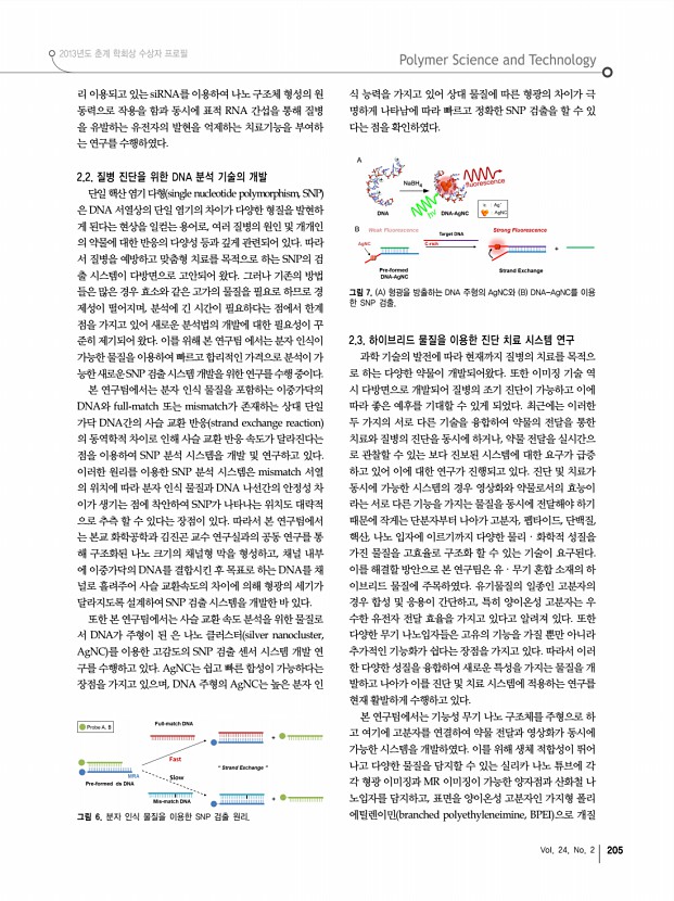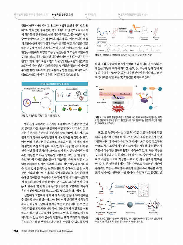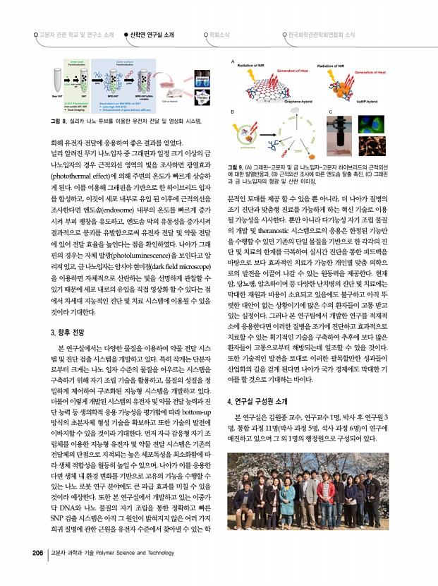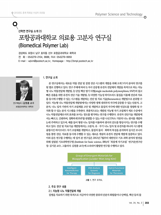 .... 진단 및 치료기술 개발팀에서는 고분자, 유 · 무기 나노 입자 및 유전자를 하나의 시스템에 융합시킨 하이브리드 자기 조립체를 개발하고, 물질의 물리 · 화학적 특성을 분석하여 실시간 모니터 링을 통한 진단, 치료를 동시에 수행할 수 있는 새로운 개념의 유전자 전달체 개발에 집중하고 있다. 이와 같은 연구를 수행하는 데 있어 본 연구실은 2012년 7월부터 대한민국 기초 과학 분야의 발전을 위해 설립된 기초과학연구원 Institute for basic science, IBS 의 ‘복잡계 자기조립’ 연구단 연구단 장김기문 교수, 그룹리더김원종 교수 에 소속되어 활발한 연구를 수행하고 있다. 그림 1. 연구 조직도. 2. 주요 연구 내용 2.1. 지능형 나노 약물전달체 개발 질병을 치료하기 위한 목적으로 지금까지 다양한 종류의 단분자 화합물이나 단백질, 핵산 등의물