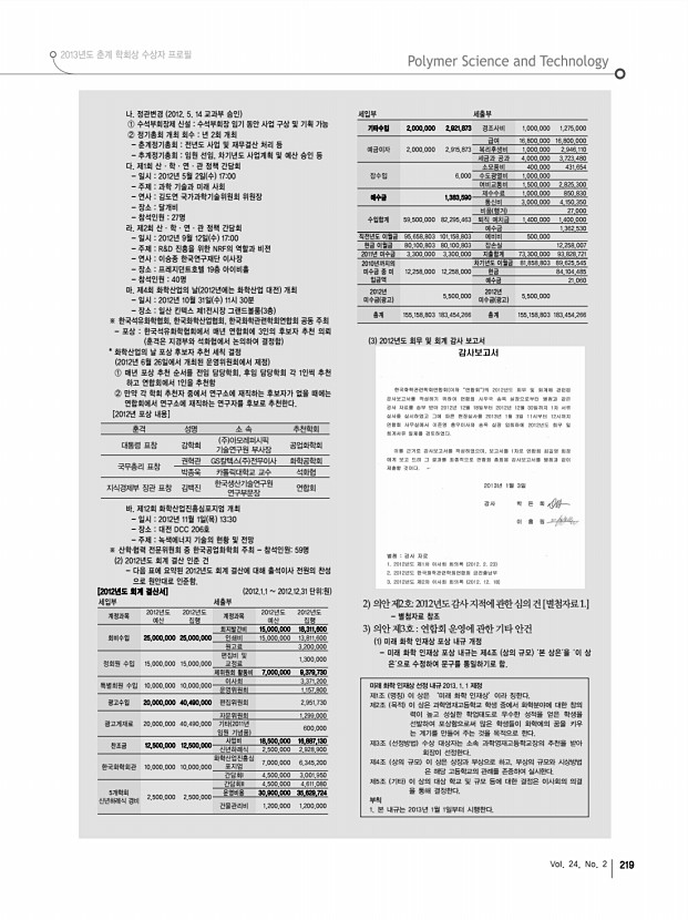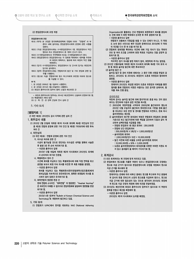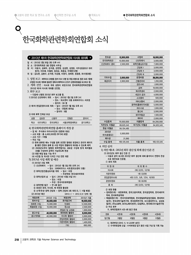 고분자 관련 학교 및 연구소 소개 산학연 연구실 소개 학회소식 한국화학관련학회연합회 소식 218 고분자 과학과 기술 Polymer Science and Technology 한국화학관련학회연합회 소식 2013년 제1차 한국화학관련학회연합회 이사회 회의록 일 시 2013년 2월 26일 화 오후 4시 장 소 한국화학회관 3층 연합회 사무실 참 석 이윤식, 김해두, 강석중, 강한영, 김성현, 김정돈, 이두성 윤호규 대리 참석 , 이미혜, 이철태, 임대순, 최중길, 우제완 12명 위 임 김도현, 김병수, 손석원, 이강봉, 이영식, 장태현, 정광춘, 허수영 8명 1. 성원 보고 재적이사 25명중 참석 이사 12명 및 위임 6명으로 정관 24조 1항에 규정된 이사회 개최에 필요한 정족수 재적이사 2/3 가 성원되었음을 보고하고 함. 2. 개회 선언 이사회 개최 성원이 되었으므로 한국화학관련학회연합회 2013년 제1차 이사회 개회...