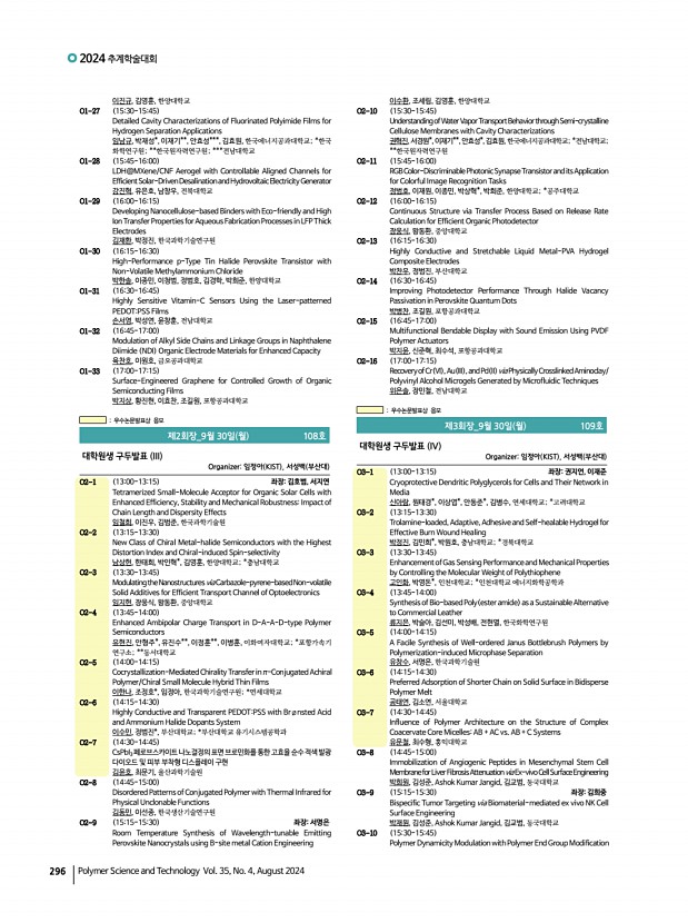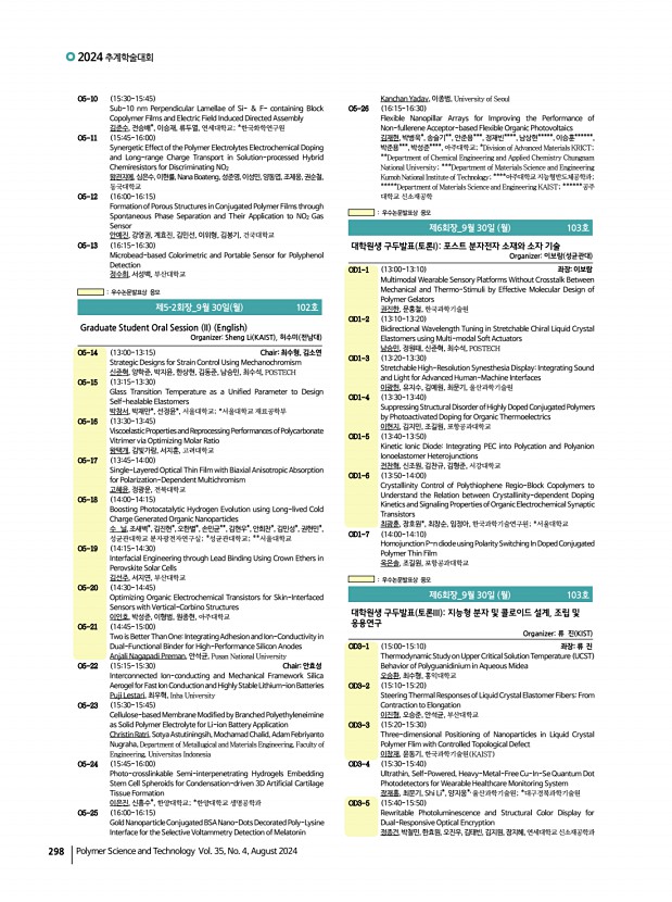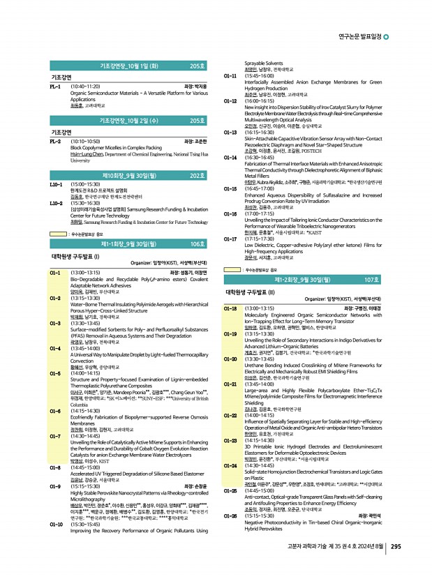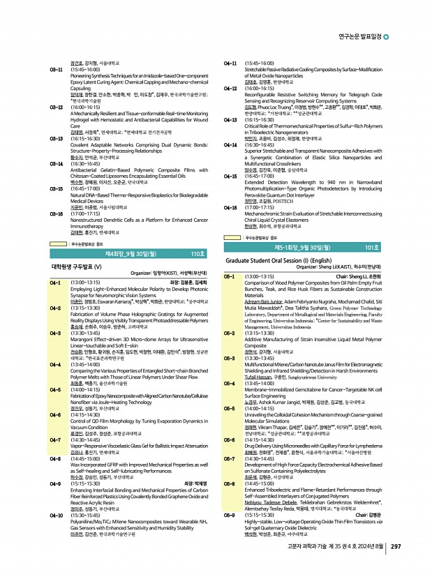 연구논문 발표일정 고분자 과학과 기술 제 35 권 4 호 2024년 8월 297 장건호, 강지형, 서울대학교 O3-11 1545-1600 PioneeringSynthesis Techniquesfor anImidazole-basedOne-component Epoxy Latent Curing AgentChemical Capping and Mechano-chemical Capsuling 임덕재, 장한결, 안소현, 박종혁, 박 민, 이도창*, 김재우, 한국과학기술연구원; *한국과학기술원 O3-12 1600-1615 A Mechanically Resilient and Tissue-conformable Real-time Monitoring Hydrogel with Hemostatic and Antibacterial Capabilities for Wound Care 김태영, 서정목*, 연세대학교; *연세대학교 전기전자공학 O3-13 1615-1630 Covalent Adaptable Networks Comprising Dual Dynamic BondsStructure-Property-Processing Relationships 황수지, 안석균, 부산대학교 O3-14 1630-1645 Antibacterial Gelatin-Based Polymeric Composite Films with Chitosan-Coated Liposomes Encapsulating Essential Oils 백수현, 장혜원, 이지선, 오준균, 단국대학교 O3-15 1645-1700 ...