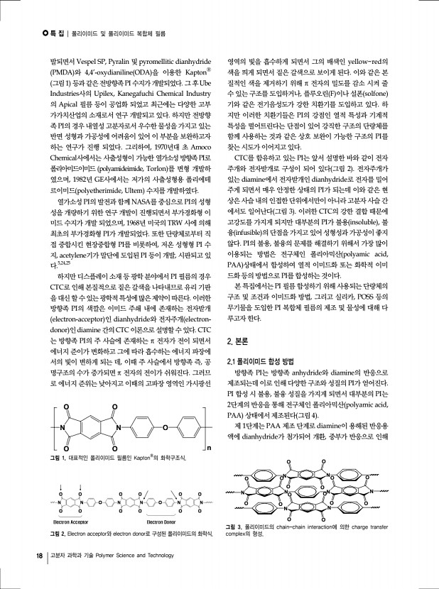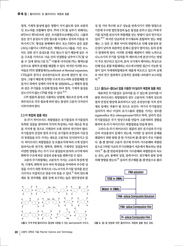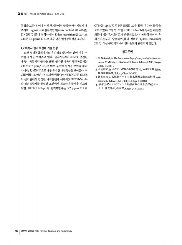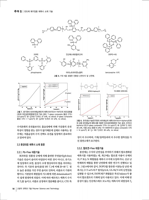 특 집 | 반도체 패키징용 에폭시 소재 기술 16 고분자 과학과 기술 Polymer Science and Technology 특성을 보인다. 이에 비해 생기원에서 합성한 바이페닐계 에 폭시의 E-glass 유리섬유복합체 resin content 40 wt% 는 Tg 250 ℃ 좀더 정확하게는 Tg-less transition 을 보이고, CTE는 4.4 ppm/℃ 으로 매우 낮은 열팽창특성을 보인다. 4.2 에폭시 필러 복합체 기술 현황 또한 필러복합체에서도 유리섬유복합체와 같이 매우 우 수한 물성을 보여주고 있다. 실리카입자가 80wt% 충진된 에폭시 복합체의 물성을 보면, 생기원 에폭시 필러복합체는 CTE= 57 ppm/℃으로 매우 우수한 물성을 보여줄 뿐만 아니라, Tg 250 ℃으로 매우 우수한 내열특성을 보여준다. 저 CTE에폭시로 알려진 나프탈렌 에폭시 일본DIC사, HP-4032D 와 생기원에서 합성한 나프탈렌계 에폭시 KITECH-Naph 와 필러복합체를 동일한 조건...