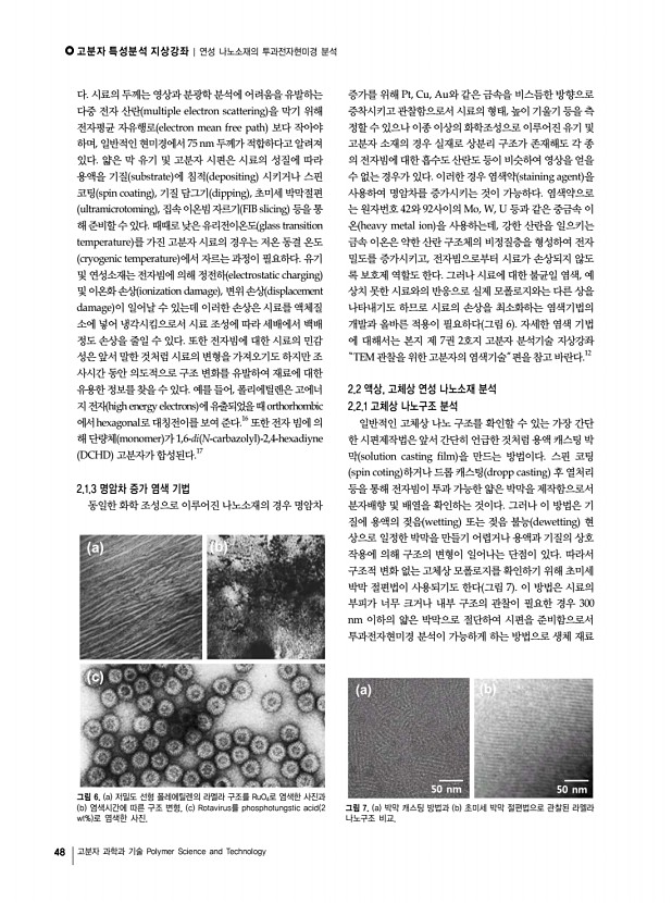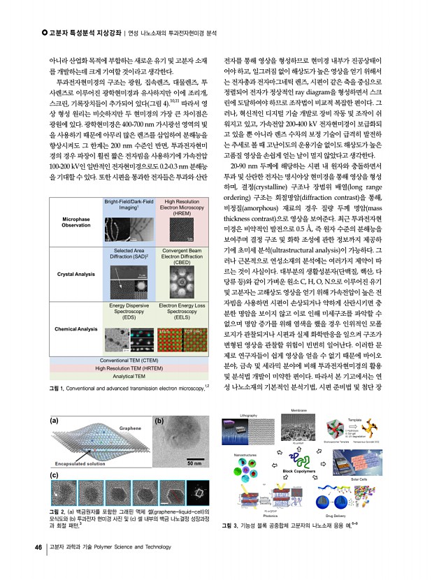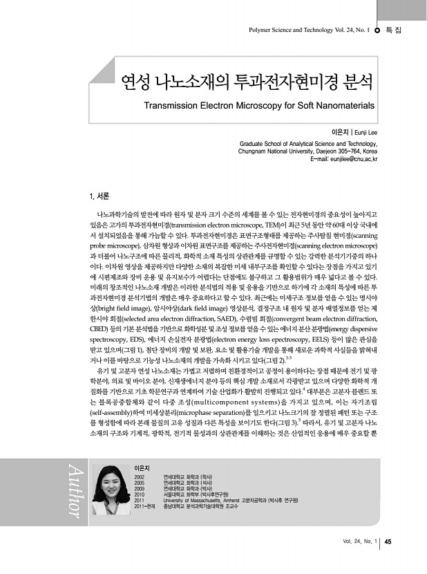 Polymer Science and Technology Vol. 24, No. 1 특 집 Vol. 24, No. 1 45 이은지 2002 연세대학교 화학과 학사 2005 연세대학교 화학과 석사 2009 연세대학교 화학과 박사 2010 서울대학교 화학부 박사후연구원 2011 University of Massachusetts, Amherst 고분자공학과 박사후 연구원 2011-현재 충남대학교 분석과학기술대학원 조교수 연성 나노소재의 투과전자현미경 분석 Transmission Electron Microscopy for Soft Nanomaterials 이은지 | Eunji Lee Graduate School of Analytical Science and Technology, Chungnam National University, Daejeon 305-764, Korea E-maileunjilee@cnu.ac.kr 1. 서론 나노과학기술의 발전에 따라 원자 및 분자 크기 수준의 세계를 볼 수 있는 전자현미경의 중요성이 높아지고 있음은 고가의 투과전자현미경 transmission electron microscope, TEM 이 최근 5년 동안 약 60대 이상 국내에 서 설치되었음을 통해 가늠할 수 있다. 투과전...