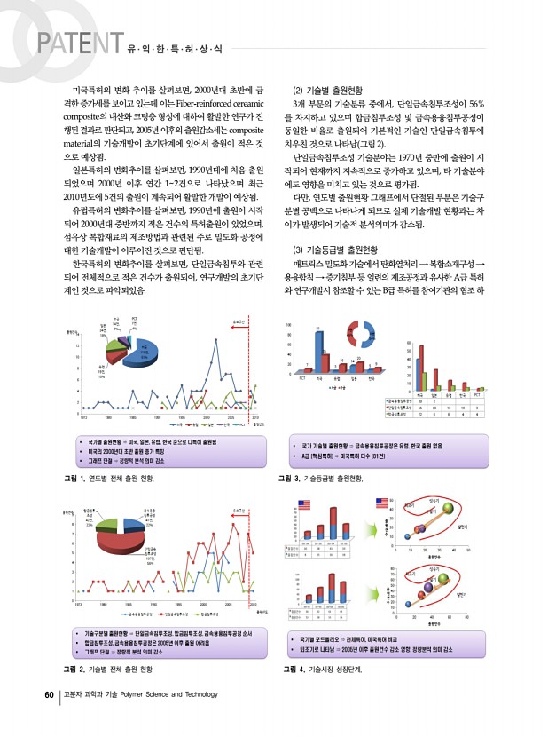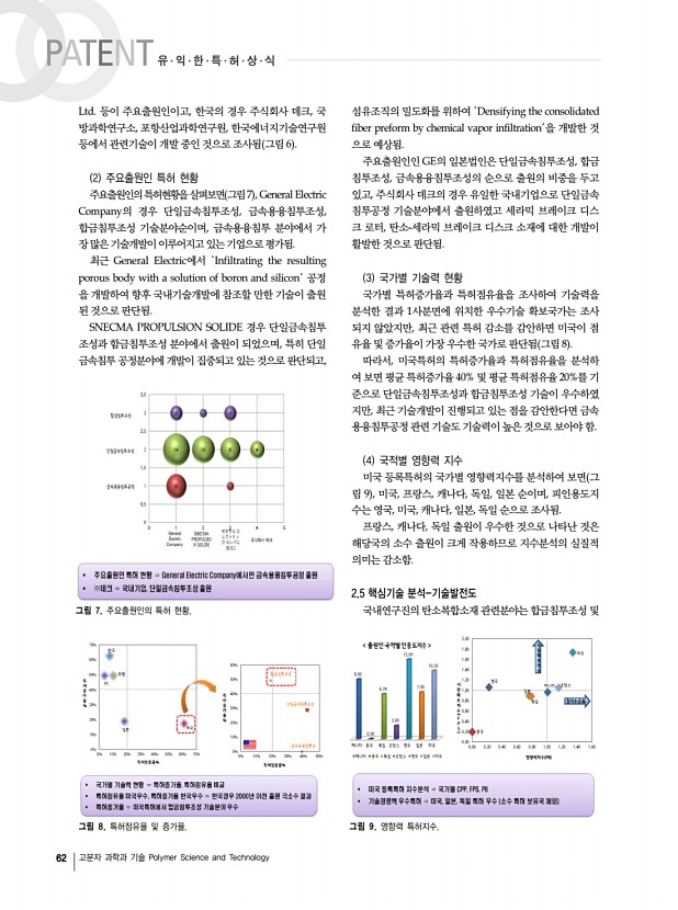 62 고분자 과학과 기술 Polymer Science and Technology 그림 8. 특허점유율 및 증가율. 그림 9. 영향력 특허지수. 그림 7. 주요출원인의 특허 현황. Ltd. 등이 주요출원인이고, 한국의 경우 주식회사 데크, 국 방과학연구소, 포항산업과학연구원, 한국에너지기술연구원 등에서 관련기술이 개발 중인 것으로 조사됨 그림 6 2 주요출원인 특허 현황 주요출원인의 특허현황을 살펴보면 그림7 , General Electric Company의 경우 단일금속침투조성, 금속용융침투조성, 합금침투조성 기술분야순이며, 금속용융침투 분야에서 가 장 많은 기술개발이 이루어지고 있는 기업으로 평가됨. 최근 General Electric에서 ‘Infiltrating the resulting porous body with a solution of boron and silicon공정 을 개발하여 향후 국내기술개발에 참조할 만한 기술이 출원 된 것으로 판단됨. SNECMA PROPULSION SOLIDE 경우 단일금속...