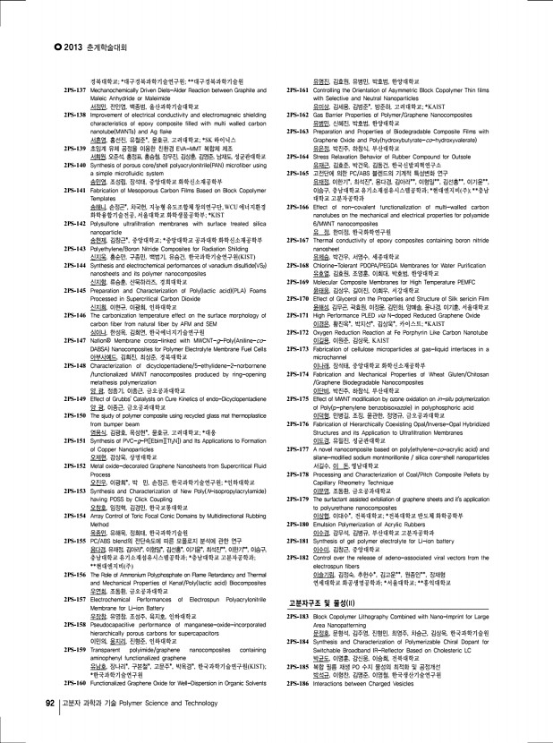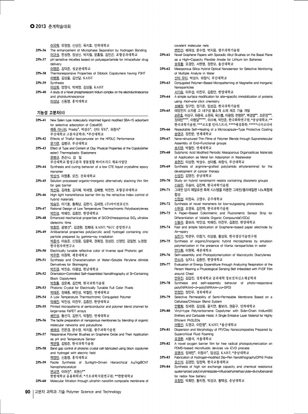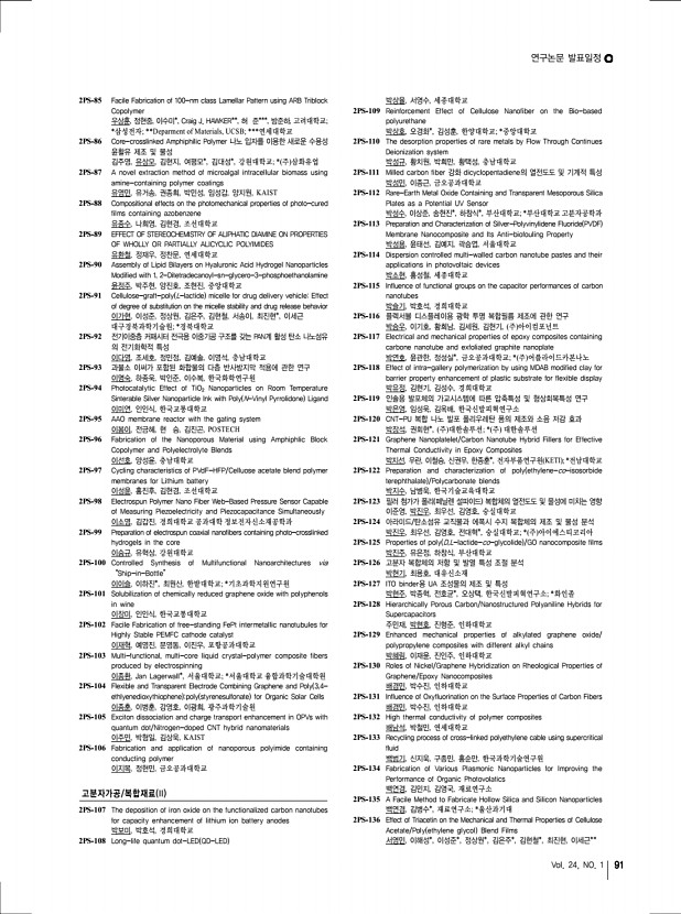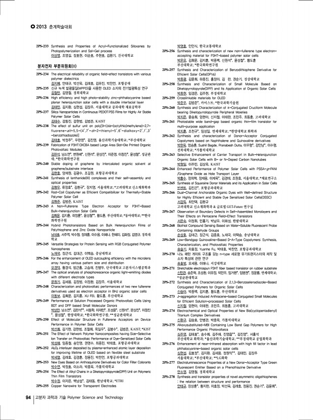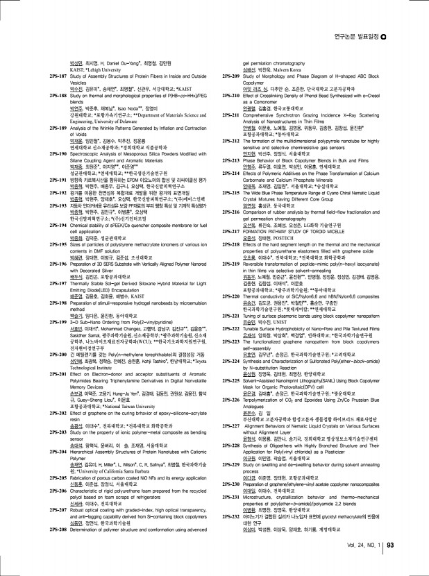 ...식, 김진곤, 포항공과대학교 2PS-197 Thermally Stable Sol-gel Derived Siloxane Hybrid Material for Light Emitting Diode LED Encapsulation 배준영, 김용호, 김회윤, 배병수, KAIST 2PS-198 Preparation of stimuli-responsive hydrogel nanobeads by microemulsion method 백슬기, 임다은, 윤진환, 동아대학교 2PS-199 3-D Sub-Nano Ordering from Poly 2-vinylpyridine 서호빈, 이재석*, Mohammad Changez, 고행덕, 강남구, 김진규**, 김윤중**, Sasidher Samal, 광주과학기술원, 신소재공학부; *광주과학기술원, 신소재 공학부, 나노바이오재료전자공학과 WCU ; **한국기초과학지원연구원, 전자현미경연구부 2PS-200 긴 메틸렌기를 갖는 Poly n-methylene terephthalate 의 결정성장 거동 성인혜, 최광복, 정학승, 전혜진, 송현훈, Kohji Tashiro*, 한남대학교; *Toyota Technological Institute 2PS-201 Effect on Electron-donor and acceptor substituents of Aromatic Polyimides Bearing Triphenylamine...