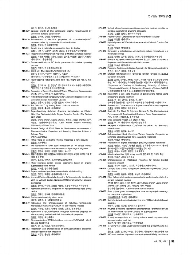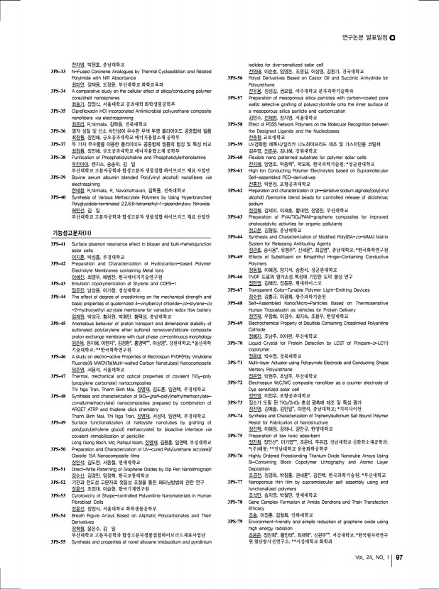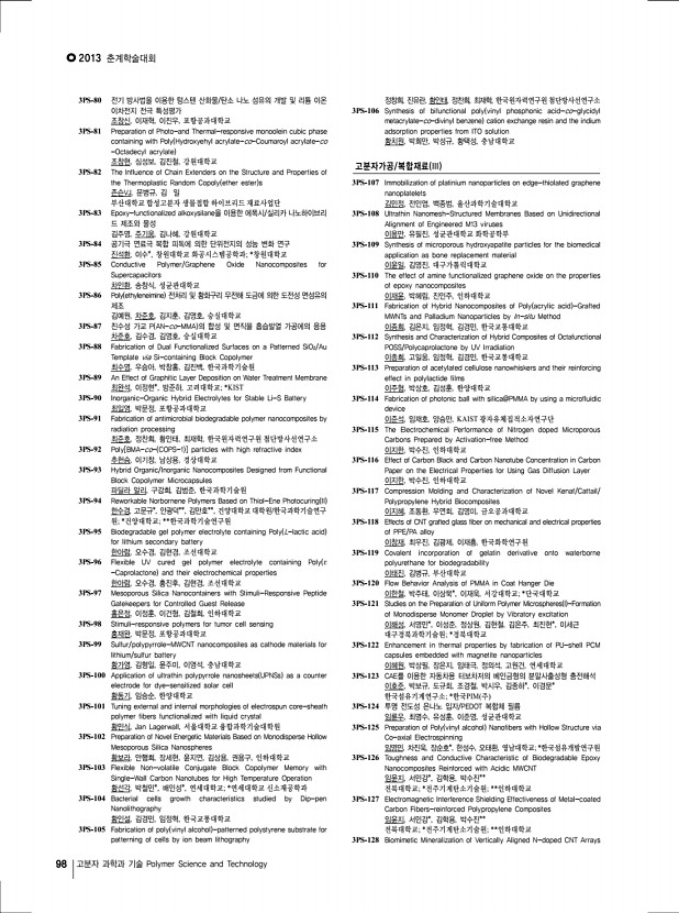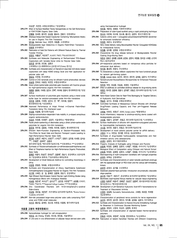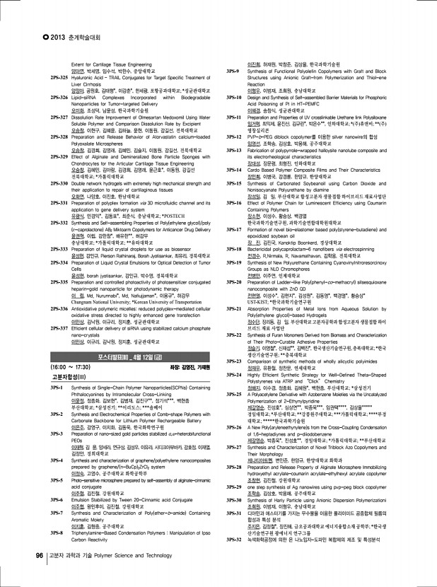 2013 춘계학술대회 96 고분자 과학과 기술 Polymer Science and Technology Extent for Cartilage Tissue Engineering 양아연, 박세영, 임수석, 박한수, 중앙대학교 2PS-325 Hyaluronic Acid – TRAIL Conjugates for Target Specific Treatment of Liver Cirrhosis 양정아, 공원호, 김태형*, 이강춘*, 한세광, 포항공과대학교; *성균관대학교 2PS-326 Lipid-siRNA Complexes Incorporated within Biodegradable Nanoparticles for Tumor-targeted Delivery 오미화, 조성덕, 남윤성, 한국과학기술원 2PS-327 Dissolution Rate Improvement of Olmesartan Medoxomil Using Water Soluble Polymer and Comparison Dissolution Rate by Excipient 오승창, 이현구, 김혜윤, 김하늘, 윤현, 이동원, 강길선, 전북대학교 2PS-328 Preparation and Release Behavior of Atorvastatin calcium-loaded Polyoxalate Microspheres 오승창, 김경희, 김영래, 김혜민, 김슬지, 이동원, 강길선, 전북대학교 2PS-329 Effect of Alginate and Demineralized B...