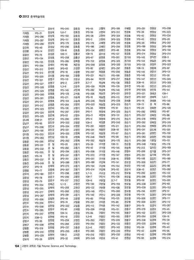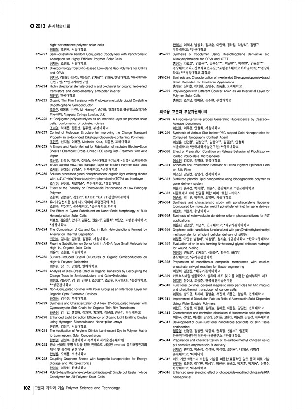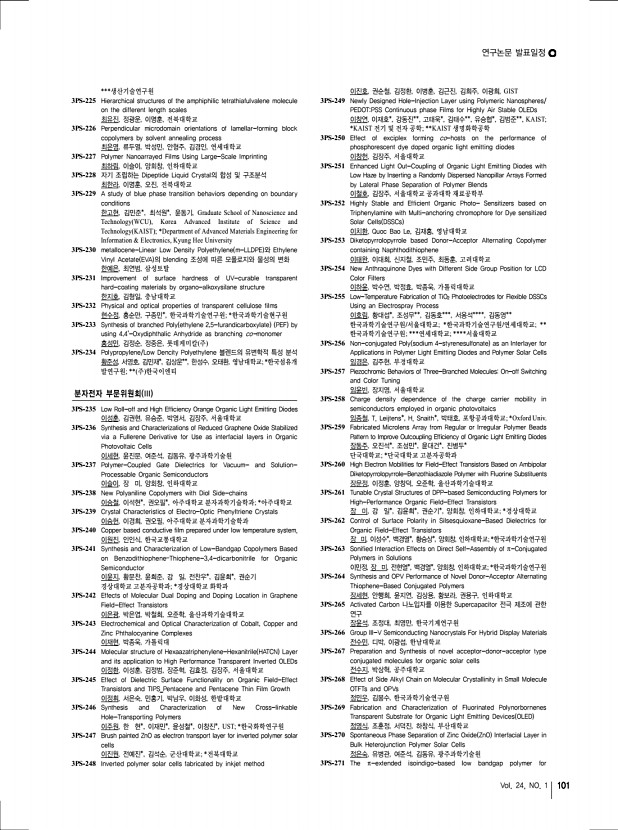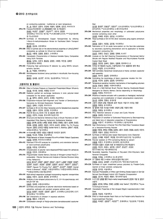 2013 춘계학술대회 100 고분자 과학과 기술 Polymer Science and Technology on conducting substrate multiferroic at room temperature 현 승, 양일규, 김영석, 전금혜, 이봄이, 정윤희, 김진곤, POSTECH 3PS-178 Pullulan/이산화티탄 나노복합필름의 제조 및 특성분석 현재민, 박성민*, 김영훈**, 한상익***, 최우석, 염정현 경북대학교; *DYETEC 연구원; ** 주 메디웨이코리아; ***국립식량과학 원 기능성작물부 3PS-179 Synthesis of Monodisperse Copper Nanoparticles by Utilizing 1-Butyl-3-methylimidazolium Nitrate for Facilitated Olefin Transport Membrane 홍길환, 강상욱, 상명대학교 3PS-180 Effect of particle size on the electrochemical properties of LiMn2O4/MWNT composites as cathode for lithium-ion batteries 홍선진, 서흔영, 김광호, 윤호규, 고려대학교 3PS-181 Viscoelastic Characteristics of Modulus-Variable Epoxy Composites Using Sn/In Particles 홍정표, 남재도, 오준석, 홍승철,...