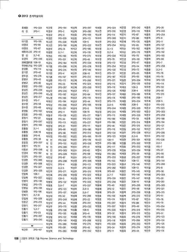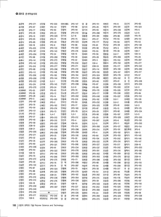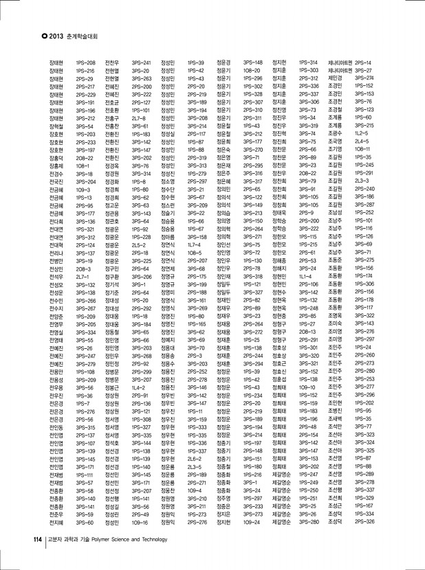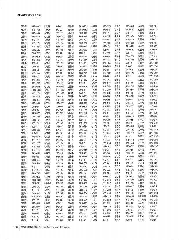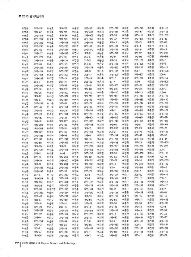 2013 춘계학술대회 106 고분자 과학과 기술 Polymer Science and Technology 김수진 1PS-167 김수현 1PS-168 김슬기 1PS-169 김슬기 1PS-170 김슬기 1PS-171 김슬기 1PS-281 김슬옹 1PS-282 김슬옹 3PS-283 김슬옹 3PS-295 김슬지 2PS-328 김승언 1PS-283 김승주 1O9-9 김승주 2O8-17 김승주 2O8-20 김승현 1PS-136 김승현 1PS-172 김승현 1PS-214 김승현 1PS-222 김승현 3PS-205 김승현 3PS-206 김승호 1PS-284 김승호 2PS-274 김신현 3PS-183 김아라 1PS-160 김아라 2O8-14 김아라 2O8-15 김아라 2PS-155 김아라 2PS-165 김아람 2PS-329 김아련 1PS-21 김안나 1O9-11 김안나 2PS-227 김연상 1L3-5 김연상 1PS-210 김연수 1PS-282 김연욱 1PS-256 김연욱 1PS-285 김연희 1PS-173 김영국 2PS-134 김영규 1PS-25 김영규 2PS-244 김영규 3PS-294 김영도 1PS-111 김영락 1PS-286 김영래 2PS-328 김영래 2PS-329 김영래 3PS-300 김영래 3PS-301 김영래 3PS-312 김영미 1PS-174 김영미 3PS-117 김영...