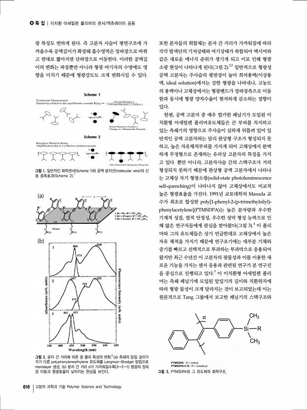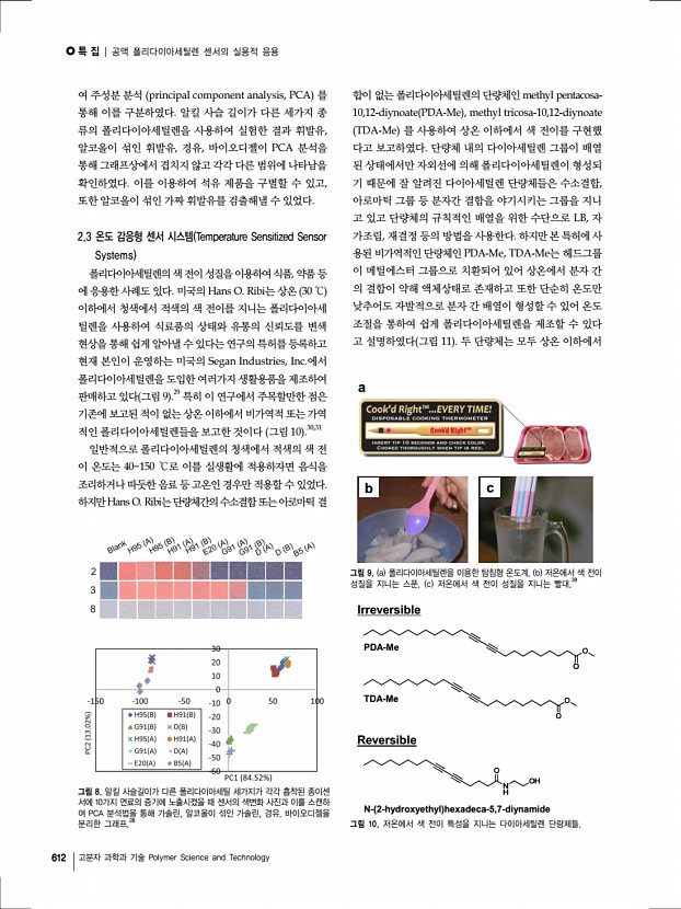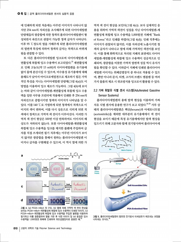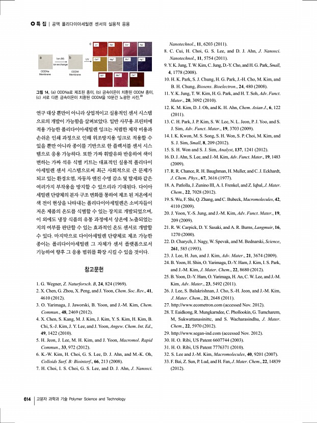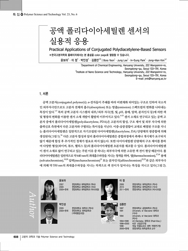 특 집 Polymer Science and Technology Vol. 23, No. 6 608 고분자 과학과 기술 Polymer Science and Technology 공액 폴리다이아세틸렌 센서의 실용적 응용 Practical Applications of Conjugated Polydiacetylene-Based Sensors ※한국고분자학회 홈페이지에서는 본 총설을 color page로 열람할 수 있습니다. 윤보라1ㆍ이 정1ㆍ박인성1ㆍ김종만1,2 | Bora Yoon1ㆍJung Lee1ㆍIn-Sung Park1ㆍJong-Man Kim1,2 1 Department of Chemical Engineering, Hanyang University, 222 Wangsimni-ro, Seongdong-gu, Seoul 133-791, Korea 2 Institute of Nano Science and Technology, Hanyang University, 222 Wangsimni-ro, Seongdong-gu, Seoul 133-791, Korea E-mailjmk@hanyang.ac.kr 윤보라 2007 한양대학교 화학공학과 학사 2009 한양대학교 화학공학과 석사 2009-현재 한양대학교 화학공학과 박사과정 이 정 2008 한양대학교 화학공학과 학사 2010 한양대학교 화학공학과 석사 2011-현재 한양대학교 화학공학과...