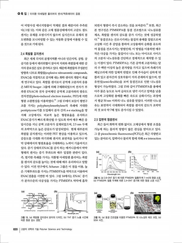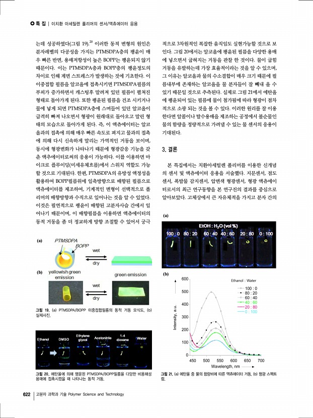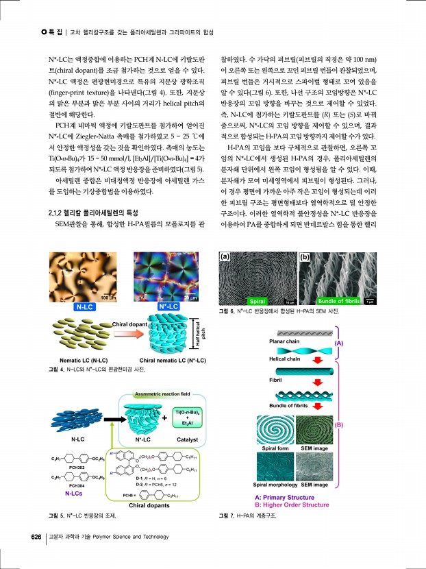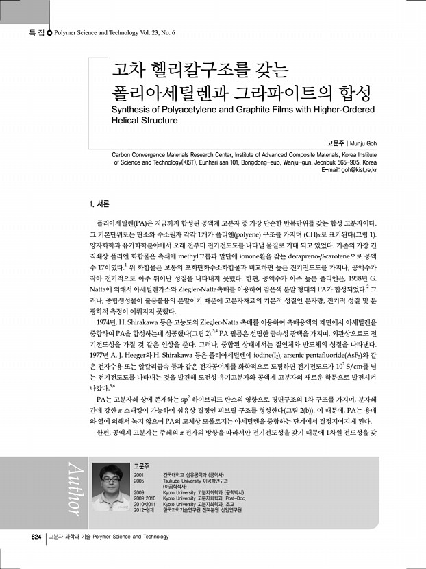 특 집 Polymer Science and Technology Vol. 23, No. 6 624 고분자 과학과 기술 Polymer Science and Technology 고차 헬리칼구조를 갖는 폴리아세틸렌과 그라파이트의 합성 Synthesis of Polyacetylene and Graphite Films with Higher-Ordered Helical Structure 고문주 | Munju Goh Carbon Convergence Materials Research Center, Institute of Advanced Composite Materials, Korea Institute of Science and Technology KIST , Eunhari san 101, Bongdong-eup, Wanju-gun, Jeonbuk 565-905, Korea E-mailgoh@kist.re.kr 고문주 2001 건국대학교 섬유공학과 공학사 2005 Tsukuba University 이공학연구과 이공학석사 2009 Kyoto University 고분자화학과 공학박사 2009–2010 Kyoto University 고분자화학과, Post-Doc. 2010–2011 Kyoto University 고분자화학과, 조교 2012–현재 한국과학기술연구원 전북분원 선임연구원 1. 서론 폴리아세틸렌 PA 은 지금까지 합성된 공액계 고분자 중 가장 단순한 반복단위를 ...