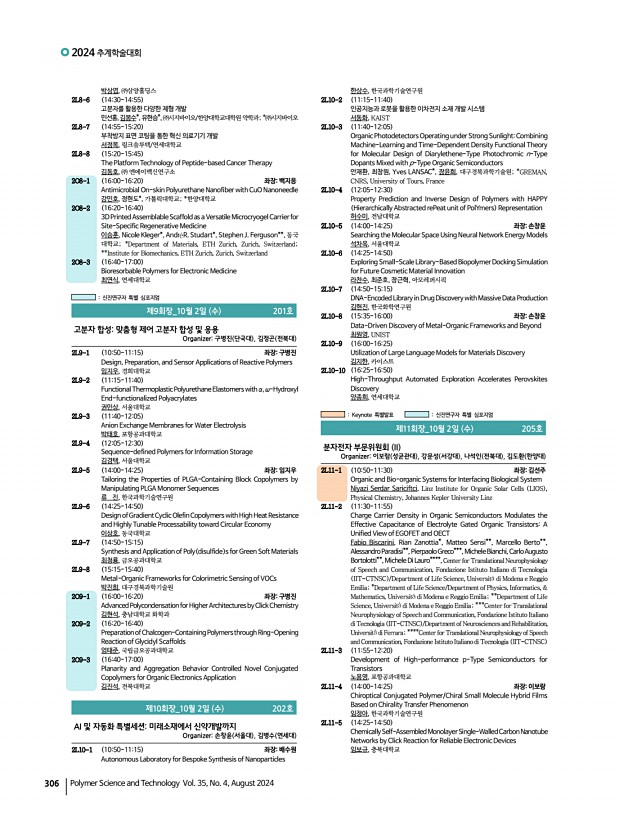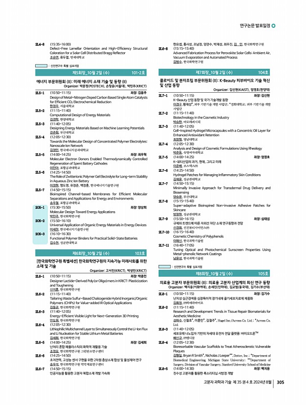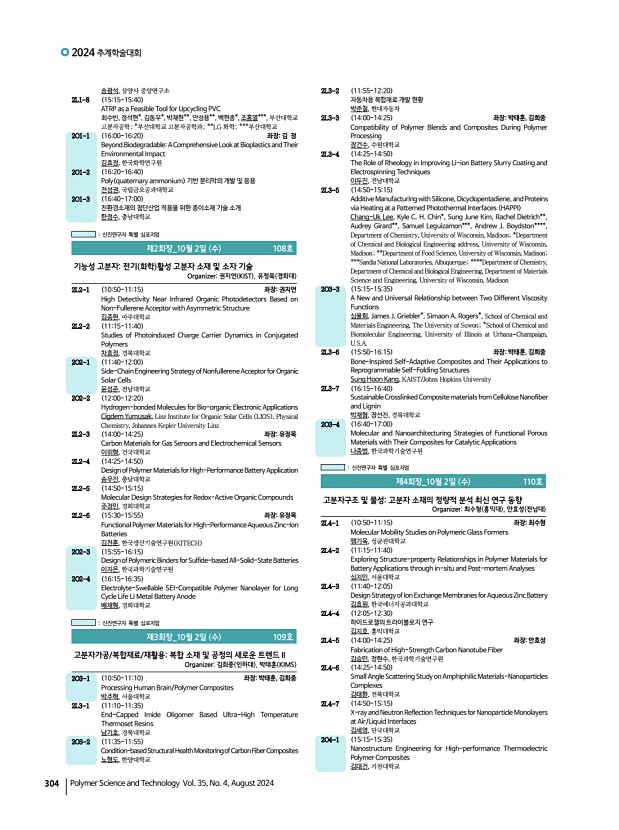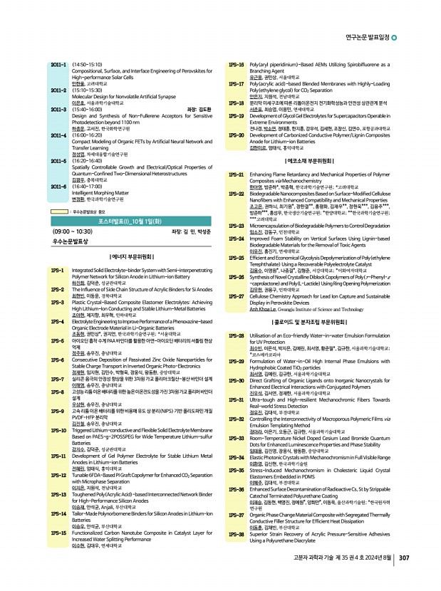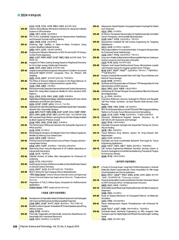 2024 추계학술대회 308 Polymer Science and Technology Vol. 35, No. 4, August 2024 이건우, 이진훈, 이건호, 서치현, 백명진, 이동욱, 울산과학기술원 1PS-39 Cationic Nanocellulose Membrane Interfaces for Advanced Colloidal Systems in Oil Purification 신재원, 서복기, 김진웅, 성균관대학교 1PS-40 POx-b-PCL Amphiphilic Copolymers for Nanoemulsion Stabilization and Enhanced Transdermal Drug Delivery 서용인, 양종렬, 김진웅, 성균관대학교 1PS-41 Achieving High Stability in Water-in-Water Emulsions Using Surface-Modified Colloidal Particles 김예린, 이은석, 김규한, 서울과학기술대학교 1PS-42 Studying the Adhesion Mechanism of XDI-PU and H6XDI-PU Using a Surface Forces Apparatus 권하은, 신상빈*, 박현옥, 유영창*, 안도원*, 백명진, 이동욱,울산과학기술원; *한국 화학연구원 1PS-43 Inorganic UV Filters Coating Strategy Based on Polyphenol Chemistry for UV to High-energy Visible Light Protection 최...
