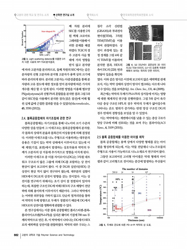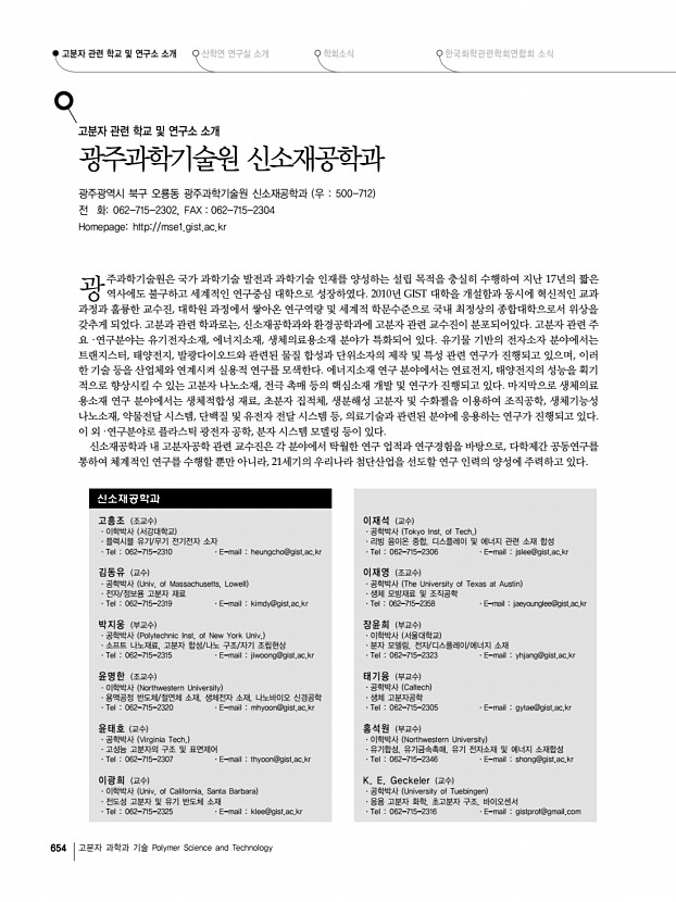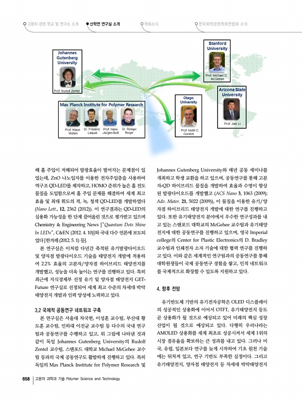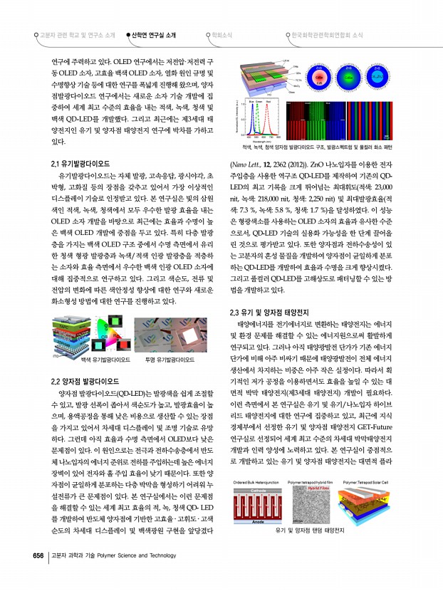 고분자 관련 학교 및 연구소 소개 산학연 연구실 소개 학회소식 한국화학관련학회연합회 소식 656 고분자 과학과 기술 Polymer Science and Technology 백색 유기발광다이오드 투명 유기발광다이오드 적색, 녹색, 청색 양자점 발광다이오드 구조, 발광스펙트럼 및 풀컬러 화소 패턴 유기 및 양자점 탠덤 태양전지 연구에 주력하고 있다. OLED 연구에서는 저전압·저전력 구 동 OLED 소자, 고효율 백색 OLED 소자, 열화 원인 규명 및 수명향상 기술 등에 대한 연구를 폭넓게 진행해 왔으며, 양자 점발광다이오드 연구에서는 새로운 소자 기술 개발에 집 중하여 세계 최고 수준의 효율을 내는 적색, 녹색, 청색 및 백색 QD-LED를 개발했다. 그리고 최근에는 제3세대 태 양전지인 유기 및 양자점 태양전지 연구에 박차를 가하고 있다. 2.1 유기발광다이오드 유기발광다이오드는 자...