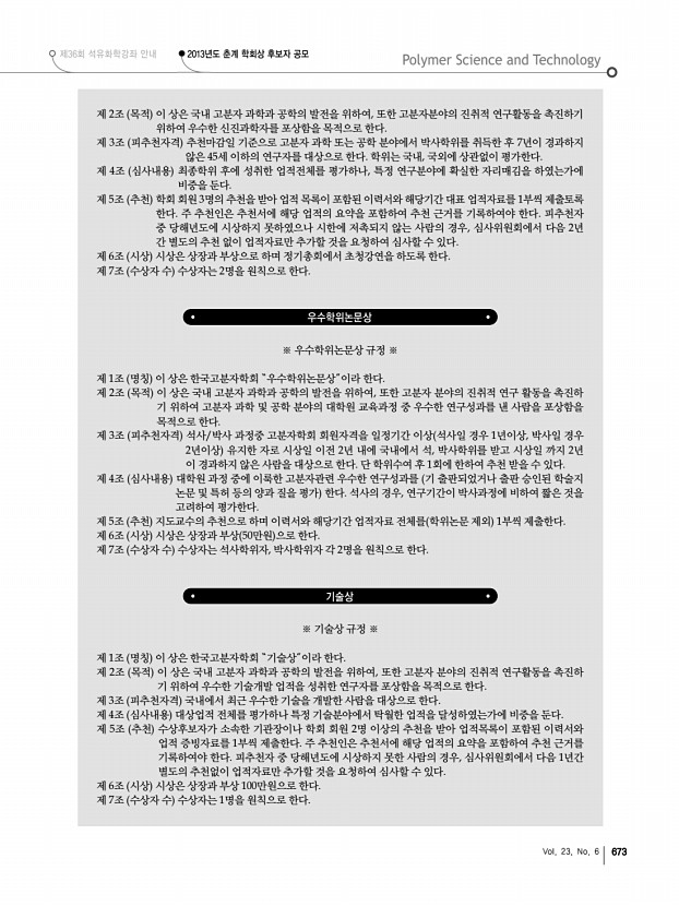제36회 석유화학강좌 안내 2013년도 춘계 학회상 후보자 공모 Vol. 23, No. 6 673 제 2조 목적 이 상은 국내 고분자 과학과 공학의 발전을 위하여, 또한 고분자분야의 진취적 연구활동을 촉진하기 위하여 우수한 신진과학자를 포상함을 목적으로 한다. 제 3조 피추천자격 추천마감일 기준으로 고분자 과학 또는 공학 분야에서 박사학위를 취득한 후 7년이 경과하지 않은 45세 이하의 연구자를 대상으로 한다. 학위는 국내, 국외에 상관없이 평가한다. 제 4조 심사내용 최종학위 후에 성취한 업적전체를 평가하나, 특정 연구분야에 확실한 자리매김을 하였는가에 비중을 둔다. 제 5조 추천 학회 회원 3명의 추천을 받아 업적 목록이 포함된 이력서와 해당기간 대표 업적자료를 1부씩 제출토록 한다. 주 추천인은 추천서에 해당 업적의 요약을 포함하여 추천 근거를 기...