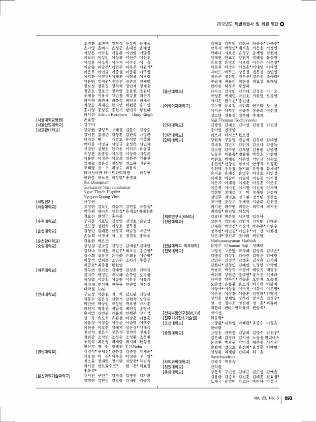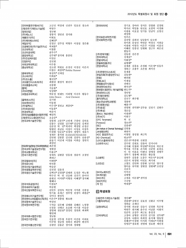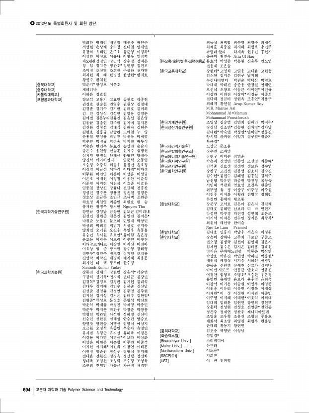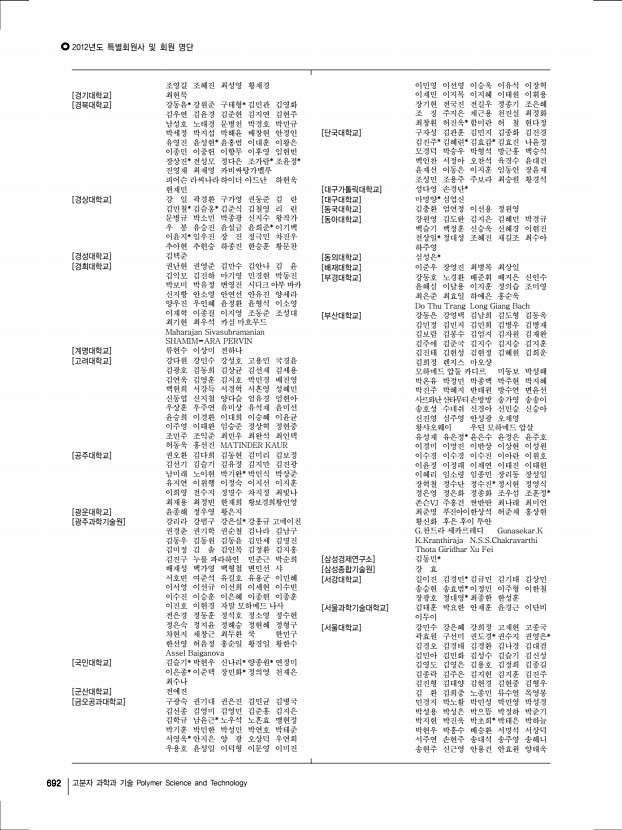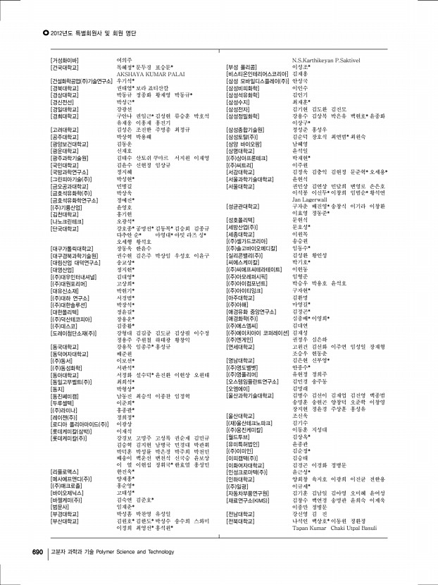 2012년도 특별회원사 및 회원 명단 690 고분자 과학과 기술 Polymer Science and Technology [거성화이바] 여의주 [건국대학교] 목혜정* 문두경 표승문* AKSHAYA KUMAR PALAI [건설화학공업 주 기술연구소] 우기석* [경북대학교] 권태엽* 보라 죠티산칼 [경상대학교] 박동규 정종화 황재영 박동규* [경신전선] 박성근* [경일대학교] 강광선 [경희대학교] 구안나 권일근* 김성현 류승훈 박호석 유재웅 이홍재 홍진기 [고려대학교] 김성은 조진한 주명종 최정규 [공주대학교] 박상혁 박용해 [광양보건대학교] 김동운 [광운대학교] 신재호 [광주과학기술원] 김태수 산토쉬 쿠마르 서지원 이재영 [국민대학교] 김윤수 신현정 임상규 [국방과학연구소] 정지혜 [그린피아기술 주 ] 박성현* [금오공과대학교] 민병길 [금호석유화학 주 ] 박상욱 [금호석유화학연구소] 정예진* [ 주 기륭산업] ...