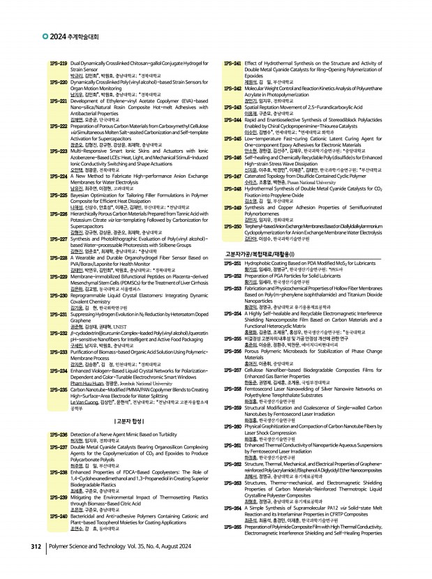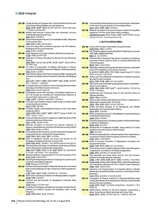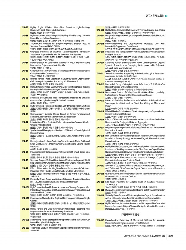 연구논문 발표일정 고분자 과학과 기술 제 35 권 4 호 2024년 8월 309 1PS-83 Highly Bright, Efficient Deep-Blue Perovskite Light-Emitting Diodeswith Solid-State Halide Exchange 이준서, 조힘찬, 한국과학기술원 1PS-84 High-Performance Insulating EMI Shielding Film Blending 2D Oxide Perovskite and MXene Nanosheets 이은정, 박종혁, 조경준, 한국과학기술연구원 전자파솔루션융합연구단 1PS-85 Two-in-One Molecule for Single-Component Exciplex Host in Solution-Processed TADF-OLEDs 이예서, 곽하은, 박채영, 권수빈, 김신영, 조민주, 최동훈, 고려대학교 1PS-86 One-step Synthesis of Ultrathin, Solvent-resistant, Intrinsically Stretchable Polymer Dielectrics for Electronic Skin Systems 강주연, 윤지용*, 이보현, 김주찬, 최준환**, 손동희*, 임성갑, 한국과학기술원; *성균관대학교; **단국대학교 1PS-87 Implementation of Long-term plasticity in OECT Memory Using Ferroelectric Polymers and Ionic...