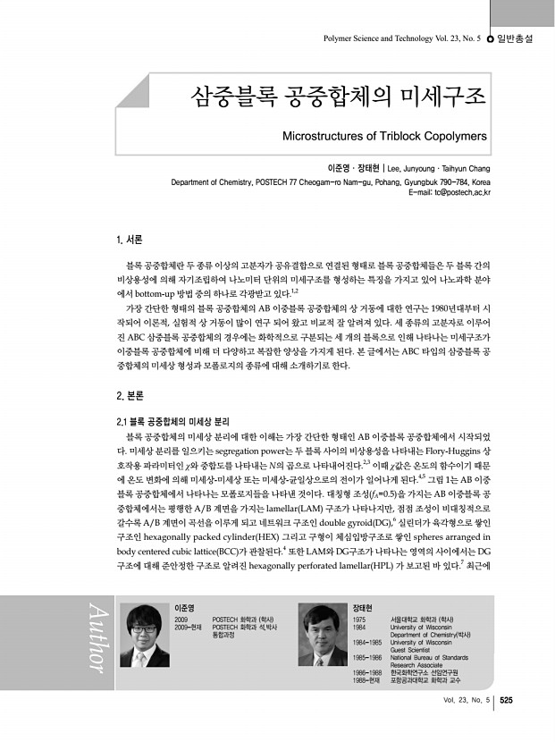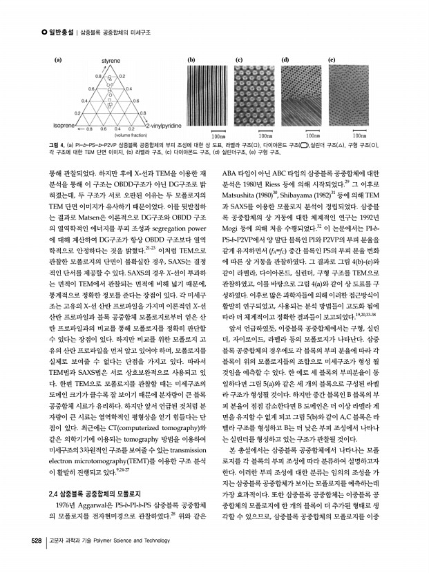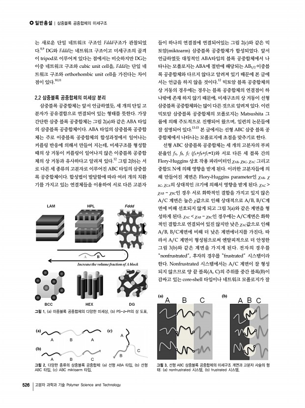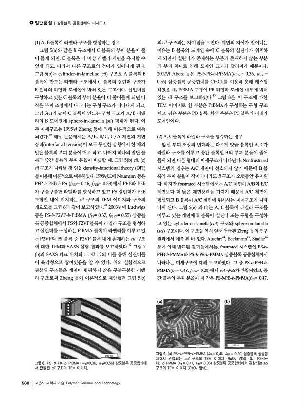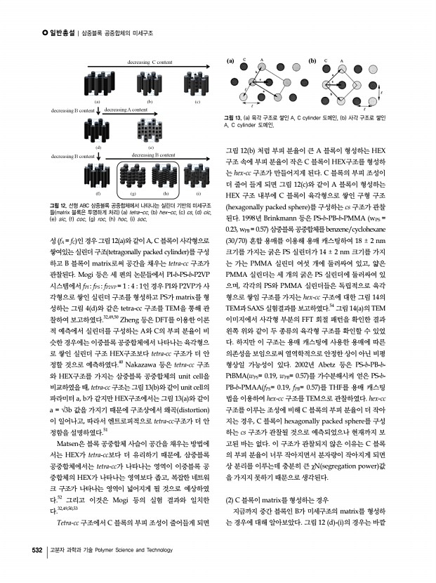 일반총설 | 삼중블록 공중합체의 미세구조 532 고분자 과학과 기술 Polymer Science and Technology 그림 12. 선형 ABC 삼중블록 공중합체에서 나타나는 실린더 기반의 미세구조 들 matrix 블록은 투명하게 처리 a tetra-cc, b hex-cc, c cs, d cic, e sic, f coc, g roc, h hoc, i soc. a b 그림 13. a 육각 구조로 쌓인 A, C cylinder 도메인, b 사각 구조로 쌓인 A, C cylinder 도메인. 성 fA = fC 인 경우 그림 12 a 와 같이 A, C 블록이 사각형으로 쌓여있는 실린더 구조 tetragonally packed cylinder 를 구성 하고 B 블록이 matrix로써 공간을 채우는 tetra-cc 구조가 관찰된다. Mogi 등은 세 편의 논문들에서 PI-b-PS-b-P2VP 시스템에서 fPI fPS fP2VP = 1 4 1인 경우 PI와 P2VP가 사 각형으로 쌓인 실린더 구조를 형성하고 PS가 matrix를 형 성하는 그림 4 d 와 같은 tetra-cc 구조를 TEM을 통해 관 찰하여 보고하였다.32,49,50 Zheng 등은 DFT를 이...