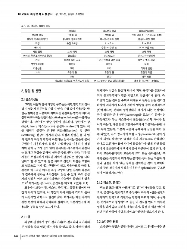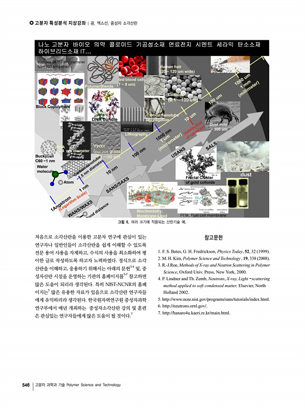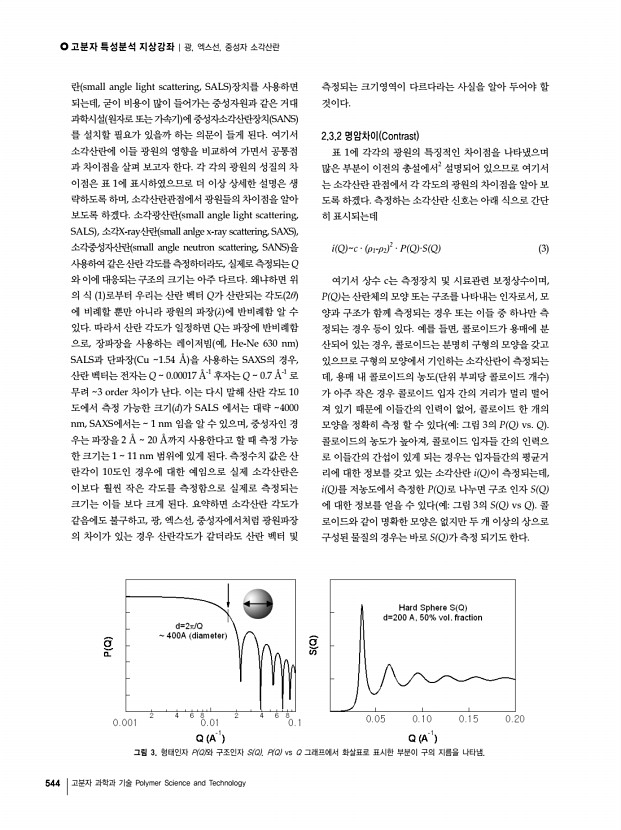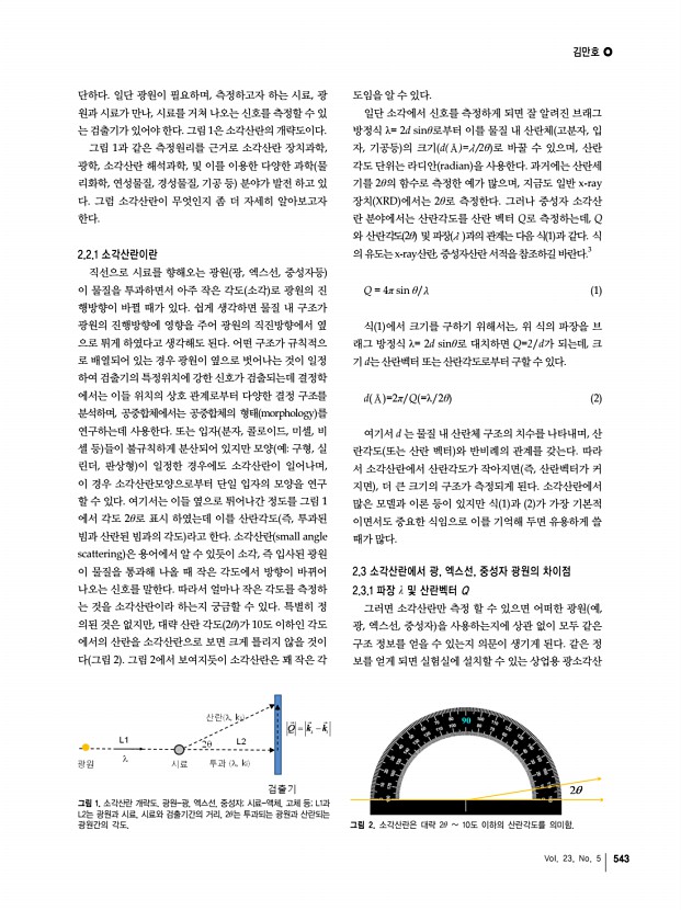 ... 광원과 시료, 시료와 검출기간의 거리, 2θ는 투과되는 광원과 산란되는 광원간의 각도. 그림 2. 소각산란은 대략 2θ 10도 이하의 산란각도를 의미함. 단하다. 일단 광원이 필요하며, 측정하고자 하는 시료, 광 원과 시료가 만나, 시료를 거쳐 나오는 신호를 측정할 수 있 는 검출기가 있어야 한다. 그림 1은 소각산란의 개략도이다. 그림 1과 같은 측정원리를 근거로 소각산란 장치과학, 광학, 소각산란 해석과학, 및 이를 이용한 다양한 과학 물 리화학, 연성물질, 경성물질, 기공 등 분야가 발전 하고 있 다. 그럼 소각산란이 무엇인지 좀 더 자세히 알아보고자 한다. 2.2.1 소각산란이란 직선으로 시료를 향해오는 광원 광, 엑스선, 중성자등 이 물질을 투과하면서 아주 작은 각도 소각 로 광원의 진 행방향이 바뀔 때가 있다. 쉽게 생각하면 물질 내 구조가 광원...