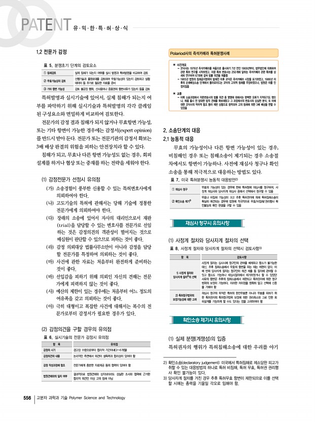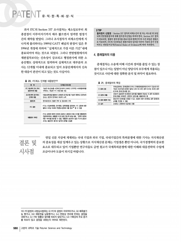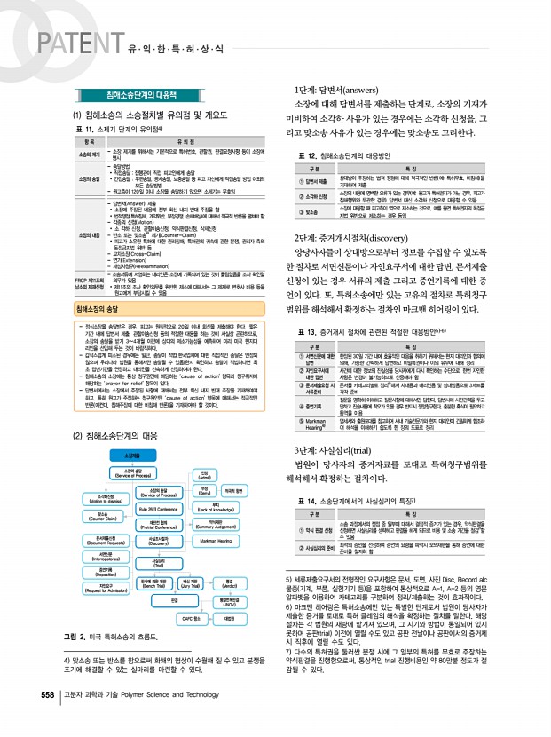 558 고분자 과학과 기술 Polymer Science and Technology 1 침해소송의 소송절차별 유의점 및 개요도 표 11. 소제기 단계의 유의점4 항 목 유 의 점 소송의 제기 소장 제기를 위해서는 기본적으로 특허번호, 관할권, 판결요청사항 등이 소장에 명시 소장의 송달 송달방법 ∙ 직접송달 집행관이 직접 피고인에게 송달 ∙ 간접송달 우편송달, 공시송달, 보충송달 등 피고 자신에게 직접송달 방법 이외의 모든 송달방법 원고측이 120일 이내 소장을 송달하기 않으면 소제기는 무효임 소장의 대응 답변서 Answer 제출 ∙ 소장에 주장된 내용에 전부 회신 내지 반대 주장을 함 ∙ 법적쟁점 특허침해, 계약위반, 부정경쟁, 손해배상 에 대해서 적극적 반론을 펼쳐야 함 각종의 신청 Motion ∙ 소 각하 신청, 관할이송신청, 약식판결신청, 삭제신청 반소 또는 맞소송4 제기 Counter-Claim ...