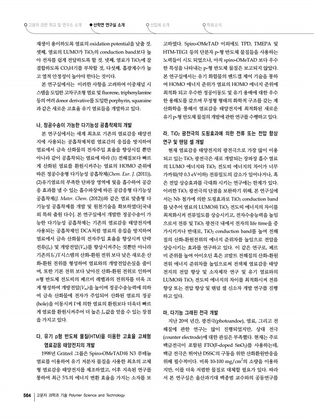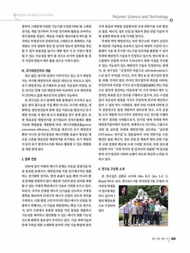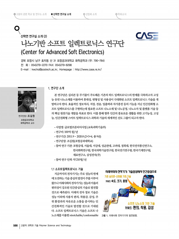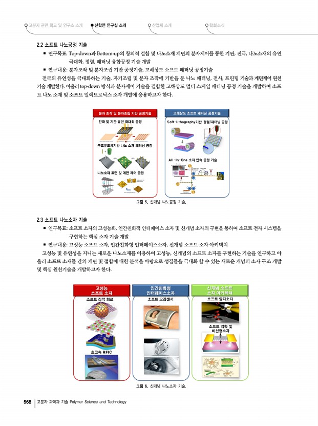 고분자 관련 학교 및 연구소 소개 산학연 연구실 소개 산업체 소개 학회소식 568 고분자 과학과 기술 Polymer Science and Technology 2.2 소프트 나노공정 기술 ▪ 연구목표Top-down과 Bottom-up의 창의적 결합 및 나노소재 계면의 분자제어를 통한 기판, 전극, 나노소재의 유연 극대화, 정렬, 패터닝 융합공정 기술 개발 ▪ 연구내용분자조작 및 분자조립 기반 공정기술, 고해상도 소프트 패터닝 공정기술 전극의 유연성을 극대화하는 기술, 자기조립 및 분자 조작에 기반을 둔 나노 패터닝, 전사, 프린팅 기술과 계면제어 원천 기술 개발한다. 아울러 top-down 방식과 분자제어 기술을 결합한 고해상도 멀티 스케일 패터닝 공정 기술을 개발하여 소프 트 나노 소재 및 소프트 일렉트로닉스 소자 개발에 응용하고자 한다. 그림 5. 신개념 나노공정 기술. 2.3 소프트 나노소자 기...