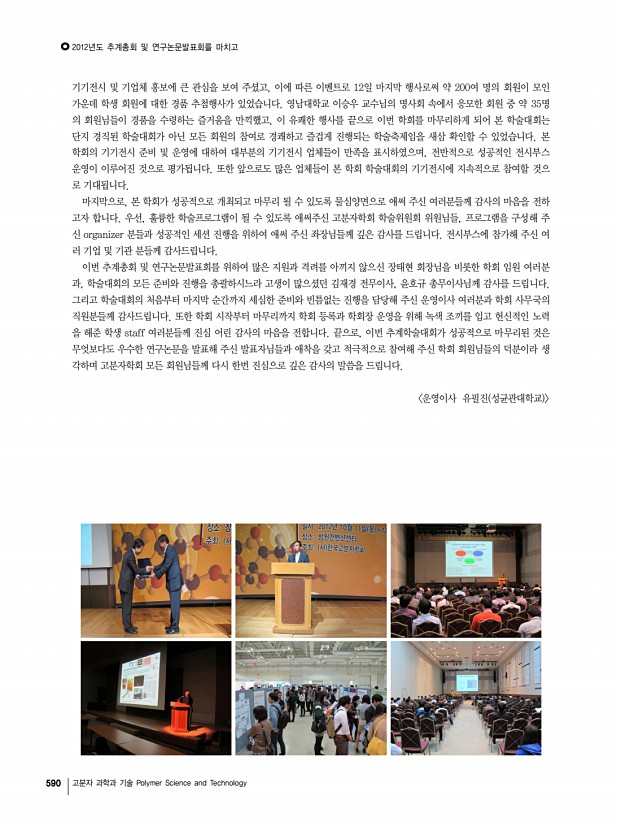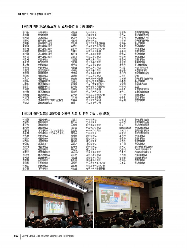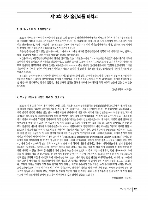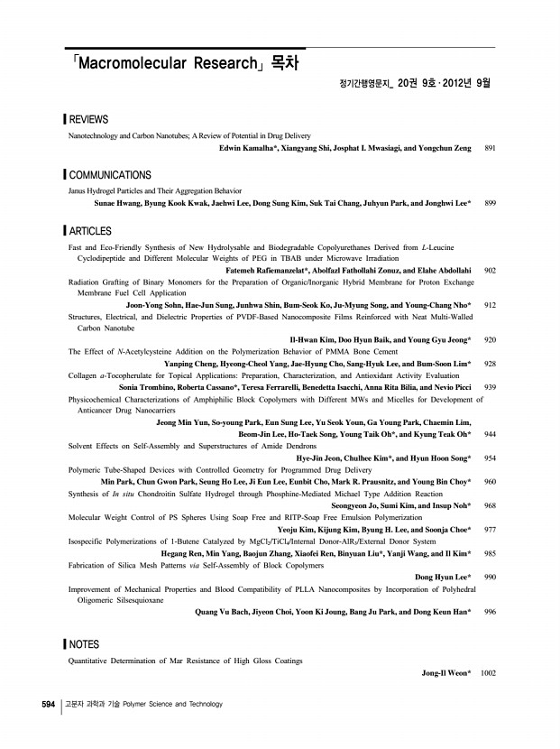 594 고분자 과학과 기술 Polymer Science and Technology 「Macromolecular Research」목차 정기간행영문지_ 20권 9호 ․ 2012년 9월 REVIEWS Nanotechnology and Carbon Nanotubes; A Review of Potential in Drug Delivery Edwin Kamalha*, Xiangyang Shi, Josphat I. Mwasiagi, and Yongchun Zeng 891 COMMUNICATIONS Janus Hydrogel Particles and Their Aggregation Behavior Sunae Hwang, Byung Kook Kwak, Jaehwi Lee, Dong Sung Kim, Suk Tai Chang, Juhyun Park, and Jonghwi Lee* 899 ARTICLES Fast and Eco-Friendly Synthesis of New Hydrolysable and Biodegradable Copolyurethanes Derived from L-Leucine Cyclodipeptide and Different Molecular Weights of PEG in TBAB under Microwave Irradiation Fatemeh Rafiemanzelat*, Abolfazl Fathollahi Zonuz, and Elahe Abdollahi 902 Radiation Grafting of Binary Monomers for the Preparation of Organic/Inorganic Hybrid Membrane for Proton Exchange Membrane Fuel Cell Application Joon-Yong Sohn, Hae-Jun Sung, Junhwa Shin, Bum-Seok Ko, Ju-Myung Song, and Young-Chang ...