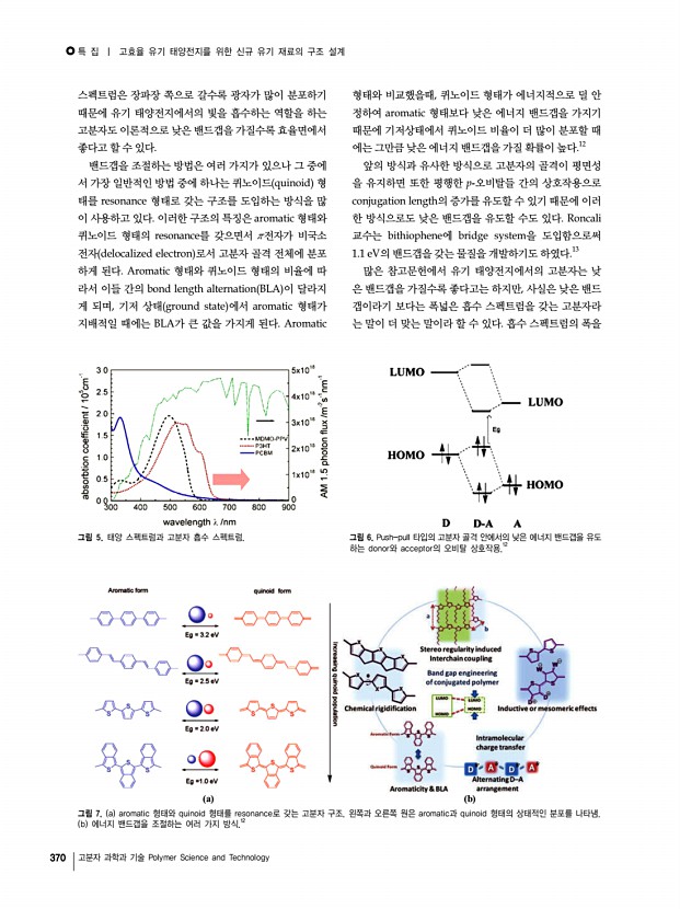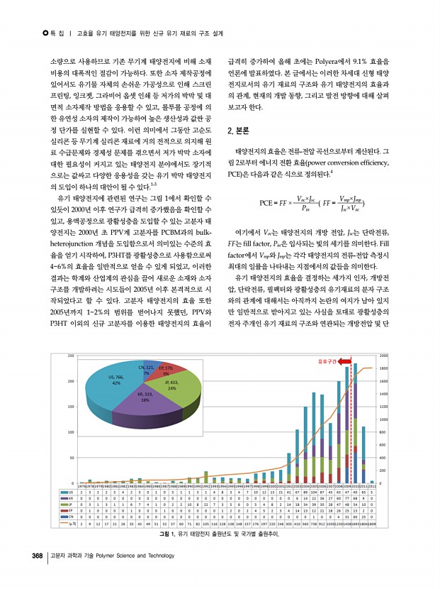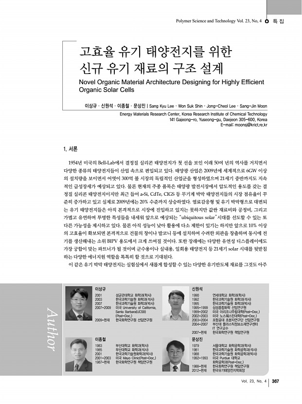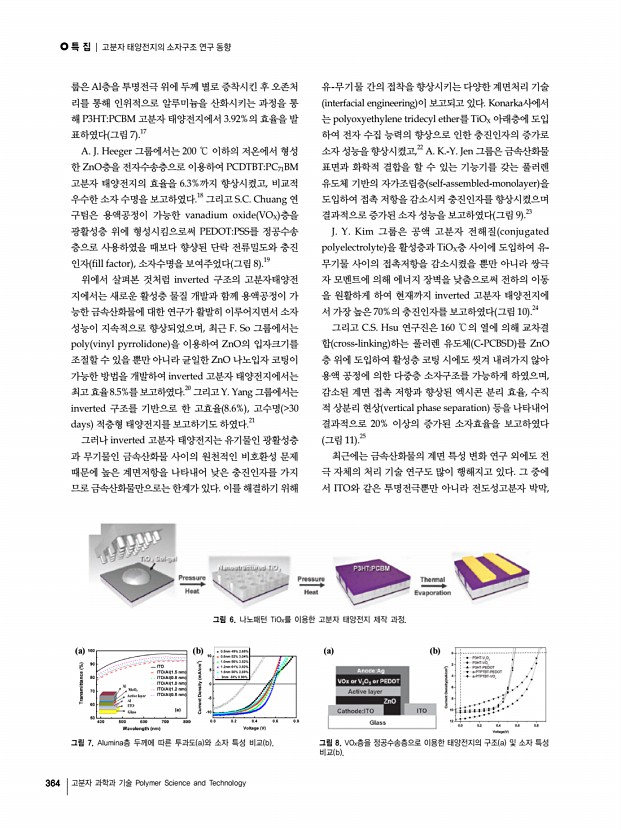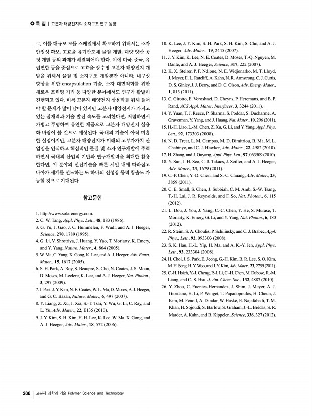 특 집 | 고분자 태양전지의 소자구조 연구 동향 366 고분자 과학과 기술 Polymer Science and Technology 로, 이를 대규모 모듈 스케일에서 확보하기 위해서는 소자 안정성 확보, 고효율 유기반도체 물질 개발, 대량 양산 공 정 개발 등의 과제가 해결되어야 한다. 이에 미국, 중국, 유 럽연합 등을 중심으로 고효율·장수명 고분자 태양전지 개 발을 위해서 물질 및 소자구조 개발뿐만 아니라, 내구성 향상을 위한 encapsulation 기술, 소자 대면적화를 위한 새로운 프린팅 기법 등 다양한 분야에서도 연구가 활발히 진행되고 있다. 비록 고분자 태양전지 상용화를 위해 풀어 야 할 문제가 많이 남아 있지만 고분자 태양전지가 가지고 있는 잠재력과 기술 발전 속도를 고려한다면, 저렴하면서 가볍고 투명하며 유연한 제품으로 고분자 태양전지 실용 화 바람이 불 것으로 예...
