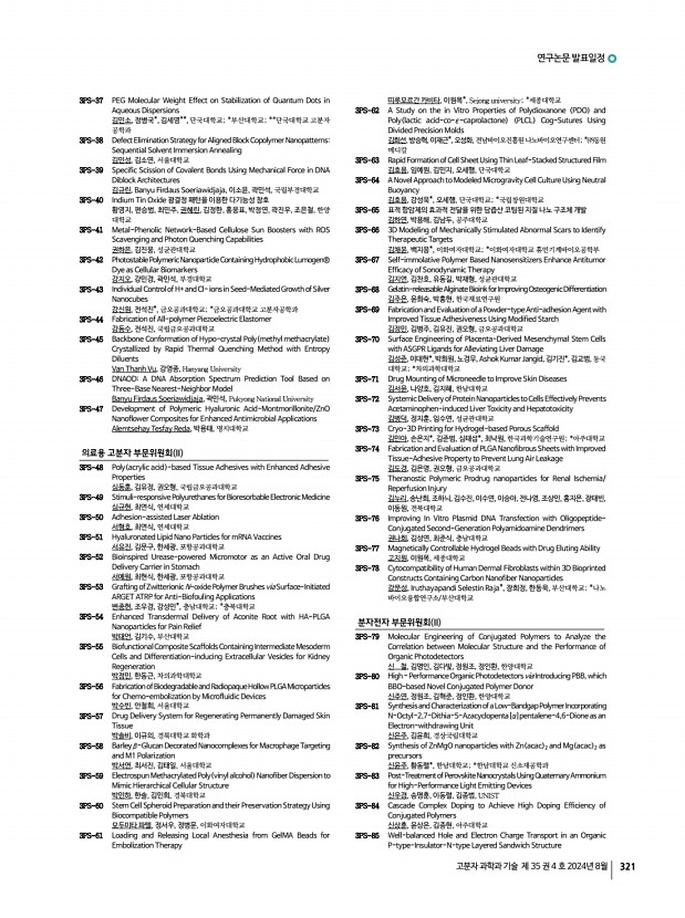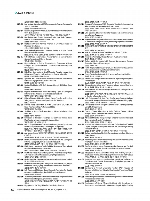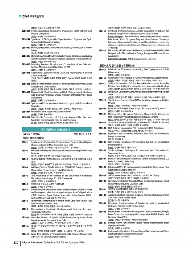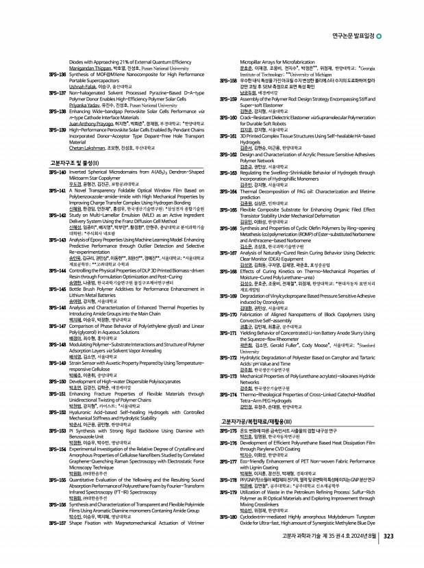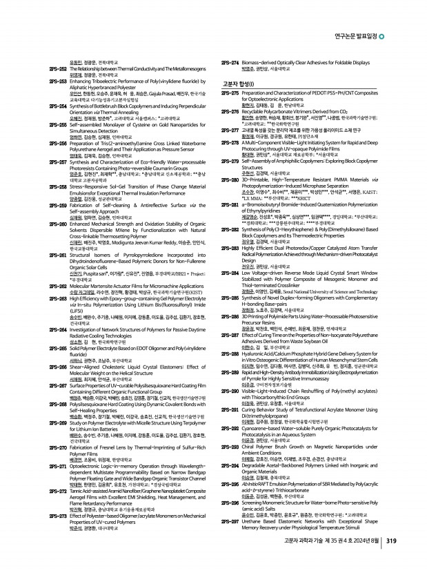 연구논문 발표일정 고분자 과학과 기술 제 35 권 4 호 2024년 8월 319 유동민, 정광운, 전북대학교 2PS-252 TheRelationshipbetweenThermal ConductivityandTheMetallomesogens 위영재, 정광운, 전북대학교 2PS-253 Enhancing Triboelectric Performance of Poly vinylidene fluoride by Aliphatic Hyperbranced Polyester 우인선, 한동헌, 오승주, 윤재욱, 허 웅, 최승은, Gajula Prasad, 배진우,한국기술 교육대학교 다기능성유기고분자실험실 2PS-254 Synthesis of Bottlebrush Block Copolymers and Inducing Perpendicular Orientation via Thermal Annealing 오혜진, 정재원, 방준하*, 고려대학교 서울캠퍼스; *고려대학교 2PS-255 Self-assembled Monolayer of Cysteine on Gold Nanoparticles for Simultaneous Detection 엄하연, 김승현, 심재원, 인하대학교 2PS-256 Preparation of Tris 2-aminoethyl amine Cross Linked Waterborne Polyurethane Aerogel and Their Application as Pressure Sensor 엄태욱, 김재욱, 김승현...