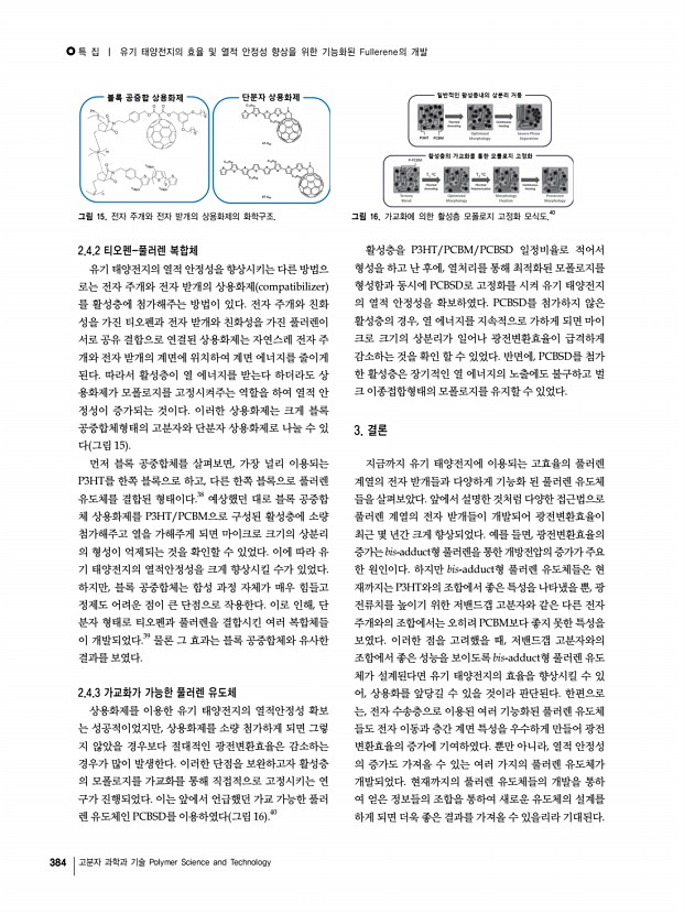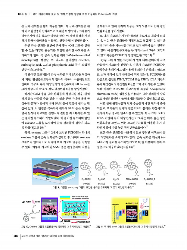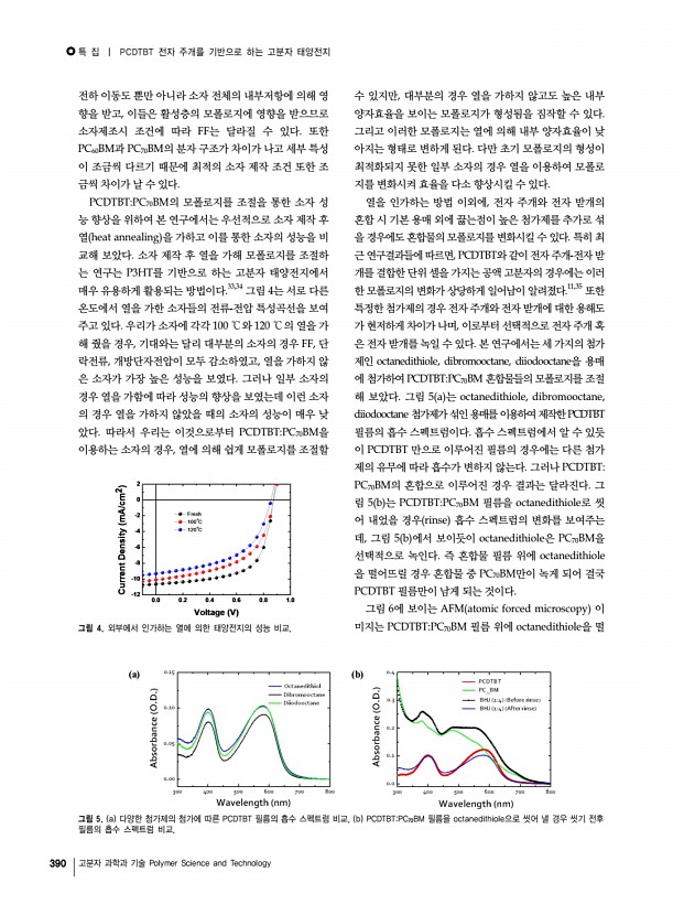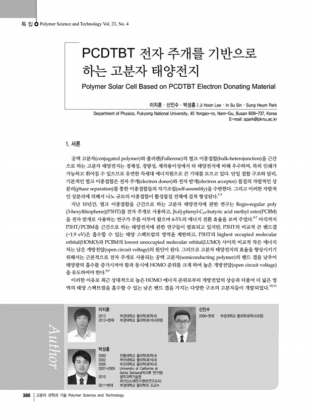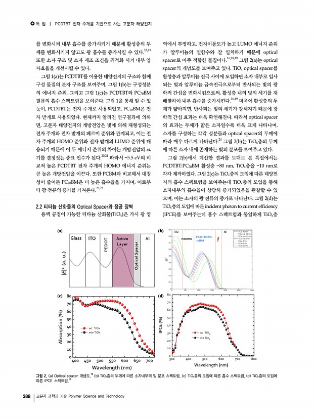 특 집 | PCDTBT 전자 주개를 기반으로 하는 고분자 태양전지 388 고분자 과학과 기술 Polymer Science and Technology a b c d 그림 2. a Optical spacer 개념도,19 b TiOx층의 두께에 따른 소자내부의 빛 분포 스펙트럼, c TiOx층의 도입에 따른 흡수 스펙트럼, d TiOx층의 도입에 따른 IPCE 스펙트럼.16 를 변화시켜 내부 흡수를 증가시키기 때문에 활성층의 두 께를 변화시키지 않고도 광 흡수를 증가시킬 수 있다.18,19 또한 소자 구조 및 소자 제조 조건을 최적화 시켜 내부 양 자효율을 개선시킬 수 있다. 그림 1 a 는 PCDTBT를 이용한 태양전지의 구조와 함께 구성 물질의 분자 구조를 보여주며, 그림 1 b 는 구성성분 의 에너지 준위, 그리고 그림 1 c 는 PCDTBT와 PC70BM 필름의 흡수 스펙트럼을 보여준다. 그림 1을 통해 알 수 있 듯이, PCDTBT는 전자 주개로 사용되었고, PC70BM은 전 자 받개로 사...