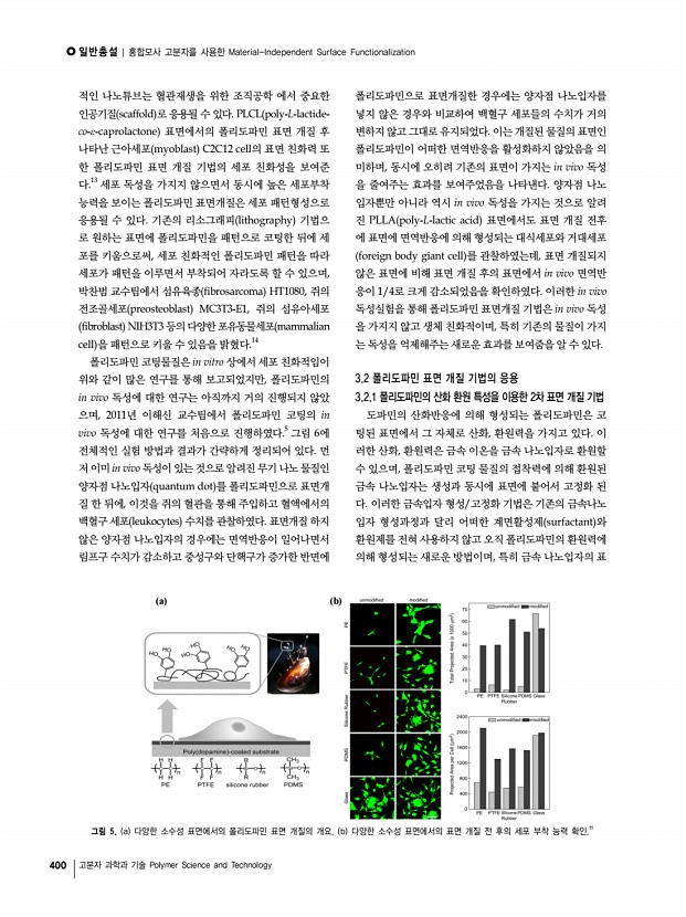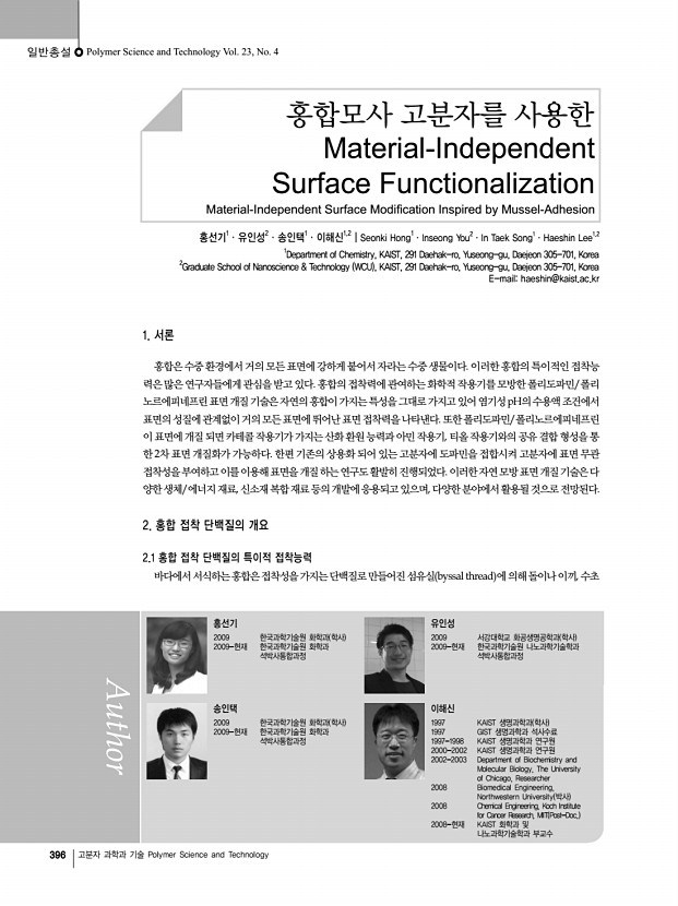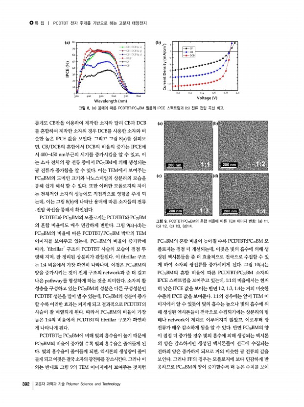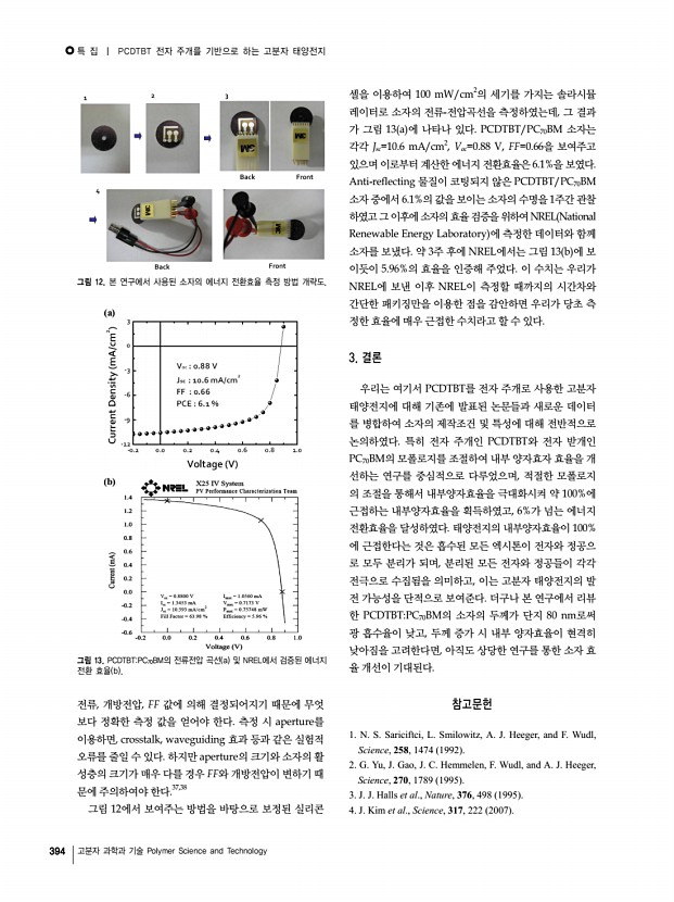 특 집 | PCDTBT 전자 주개를 기반으로 하는 고분자 태양전지 394 고분자 과학과 기술 Polymer Science and Technology a b 그림 13. PCDTBTPC70BM의 전류전압 곡선 a 및 NREL에서 검증된 에너지 전환 효율 b 그림 12. 본 연구에서 사용된 소자의 에너지 전환효율 측정 방법 개략도. 전류, 개방전압, FF 값에 의해 결정되어지기 때문에 무엇 보다 정확한 측정 값을 얻어야 한다. 측정 시 aperture를 이용하면, crosstalk, waveguiding 효과 등과 같은 실험적 오류를 줄일 수 있다. 하지만 aperture의 크기와 소자의 활 성층의 크기가 매우 다를 경우 FF와 개방전압이 변하기 때 문에 주의하여야 한다.37,38 그림 12에서 보여주는 방법을 바탕으로 보정된 실리콘 셀을 이용하여 100 mW/cm2의 세기를 가지는 솔라시뮬 레이터로 소자의 전류-전압곡선을 측정하였는데, 그 결과 가 그림 13 a 에 나타나 있다. PCDT...