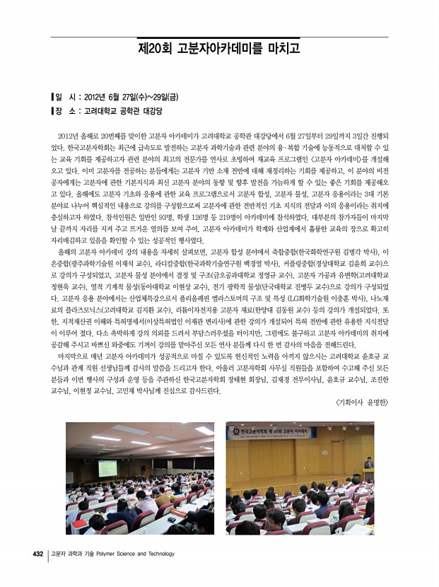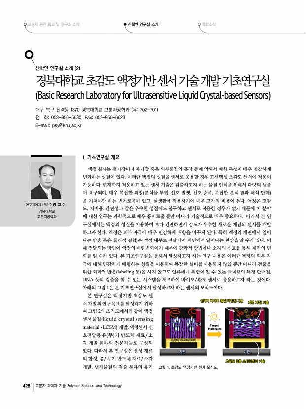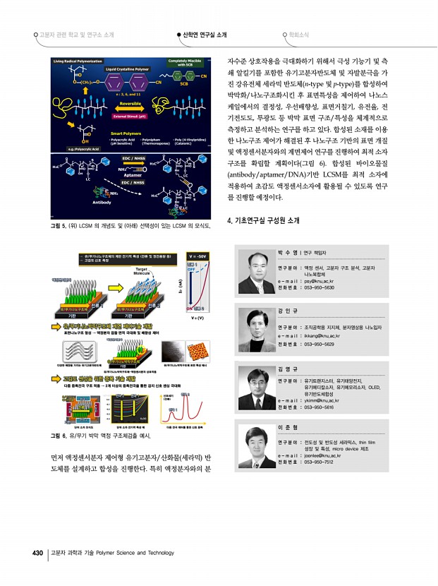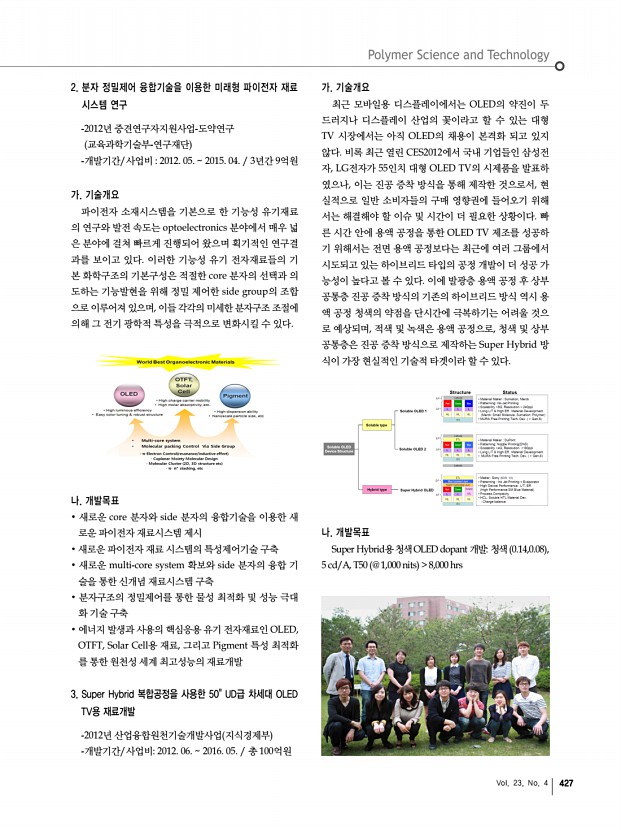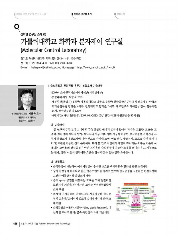 고분자 관련 학교 및 연구소 소개 산학연 연구실 소개 학회소식 426 고분자 과학과 기술 Polymer Science and Technology 연구단장/연구소장l박종욱 교수 가톨릭대학교 화학과/ 융합과학기술연구소 산학연 연구실 소개 1 가톨릭대학교 화학과 분자제어 연구실 Molecular Control Laboratory 경기도 부천시 원미구 역곡 2동 산43-1 우420-743 전 화 02 2164-4331 FAX02 2164-4764 E-mail hahapark@catholic.ac.kr, Homepage http//www.catholic.ac.kr/mcl/ 1. 습식공정용 전하전달 유무기 복합소재 기술개발 -2009년 소재원천기술개발사업단 지식경제부 -총괄과제 책임박종욱 교수 -세부주관 책임자 1세부가톨릭대학교 박종욱, 2세부한국화학연구원 문상진, 3세부한국과 학기술연구원 김형준, 4세부한양대학교 안희준, 5세부재료연구소 이혜문 참여 연구기관 24개, 참여연구원 약 120명 -개발기간/사업비 1단계 2009. ...