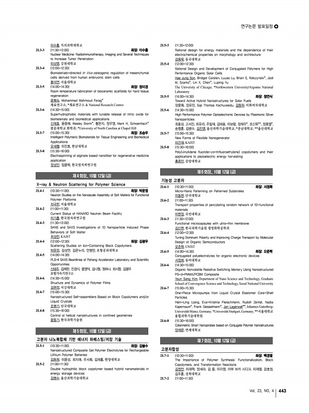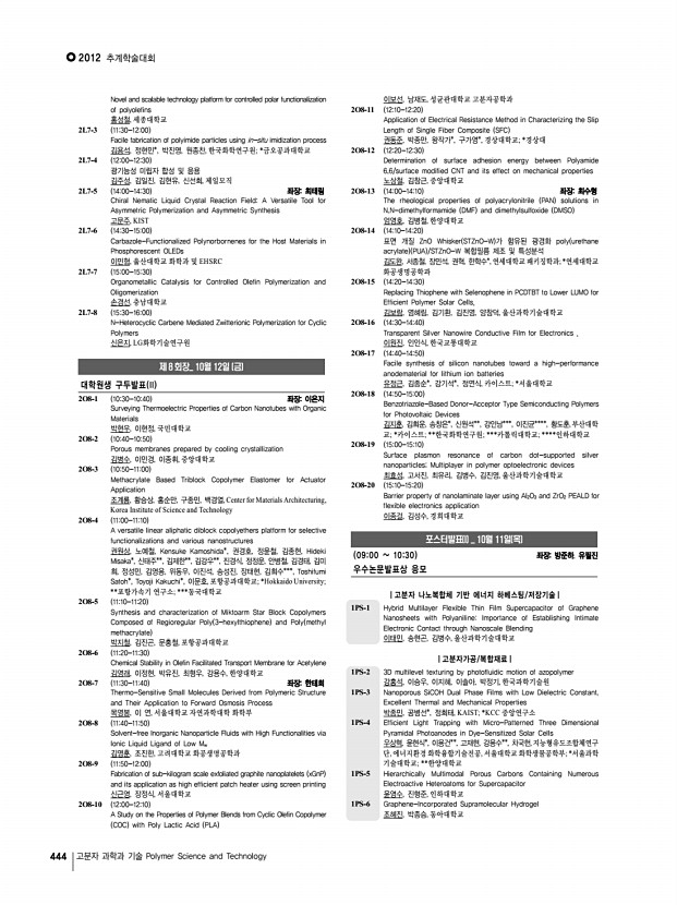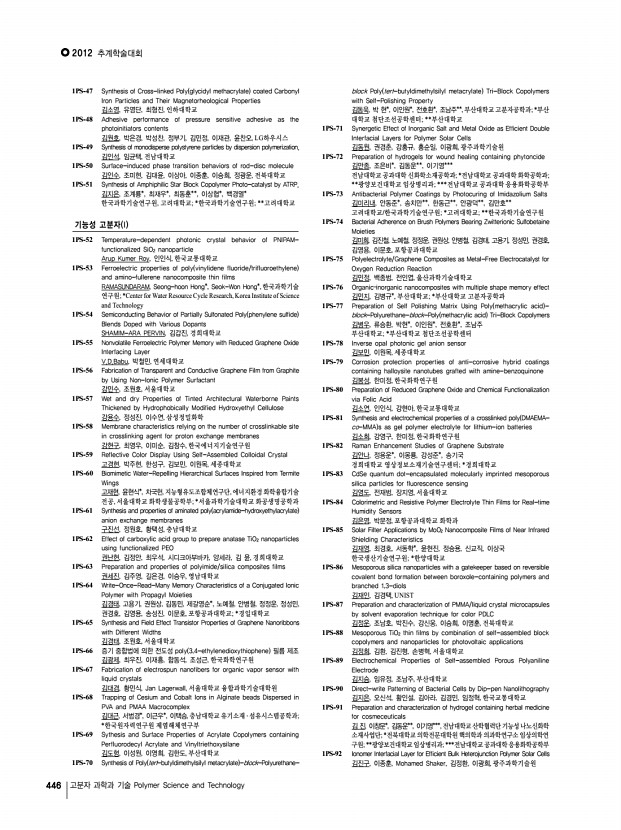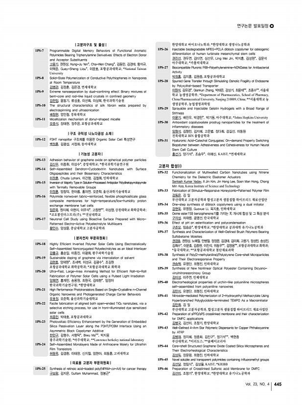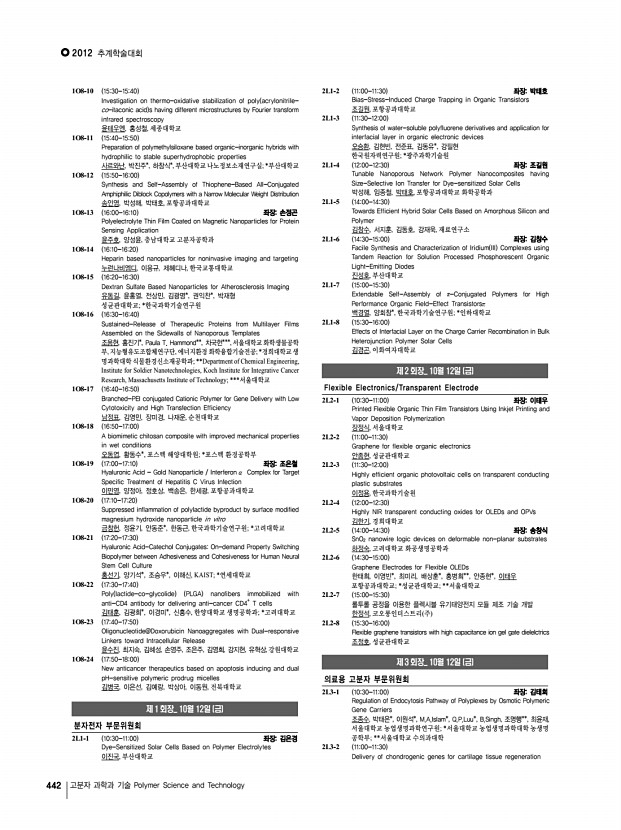 ...원상, Hung-Ju Yen*, Cha-Wen Chang*, 김동민, 김경태, 함석규, 이택준, Guey-Sheng Liou*, 이문호, 포항공과대학교; *National Taiwan University 1PS-8 Solid-State Polymerization of Conductive Polythiophenes in Nanopores at Room Temperature 김병관, 김정훈, 김은경, 연세대학교 1PS-9 Extreme nanoseparation by dual-confining effectBinary mixtures of bent-core and rod-like liquid crystals in confined geometry 김한임, 윤동기, 류성호, 이선희, 이상복, 한국과학기술원 1PS-10 The structural characteristics of silk fibroin webs prepared by electrospinning and ultrasonication 배창현, 엄인철, 경북대학교 1PS-11 Micellization mechanism of donut-shaped micelle 오중석, 장태현, 정주은, 포항공과대학교 | 구조 규칙성 나노다공성 소재 | 1PS-12 P3HT nanopillar 구조체를 이용한 Organic Solar Cell 특성연구 백정훈, 김광섭, 서정화, 동아대학교 | 기능성 고분자 | 1PS-13 Adhesion behavior of graphen...