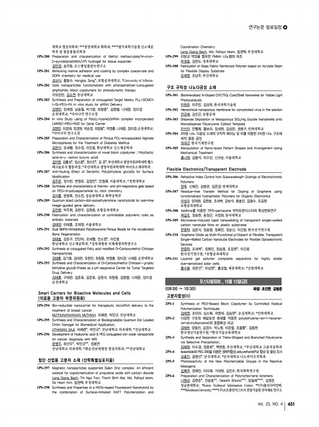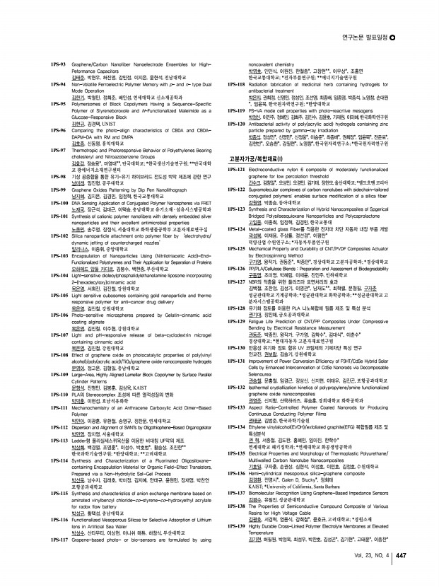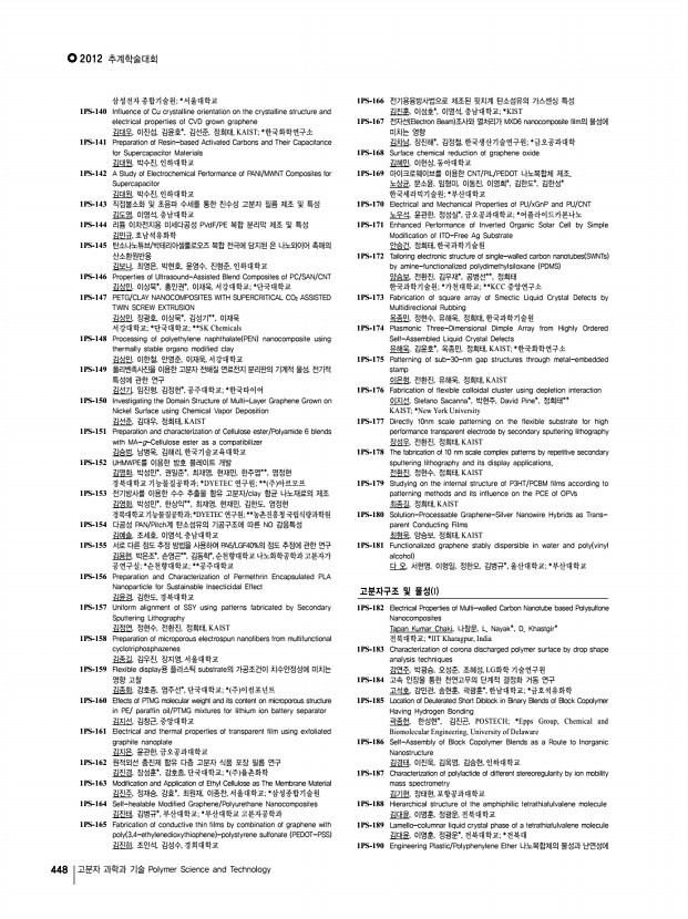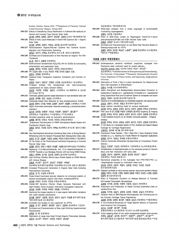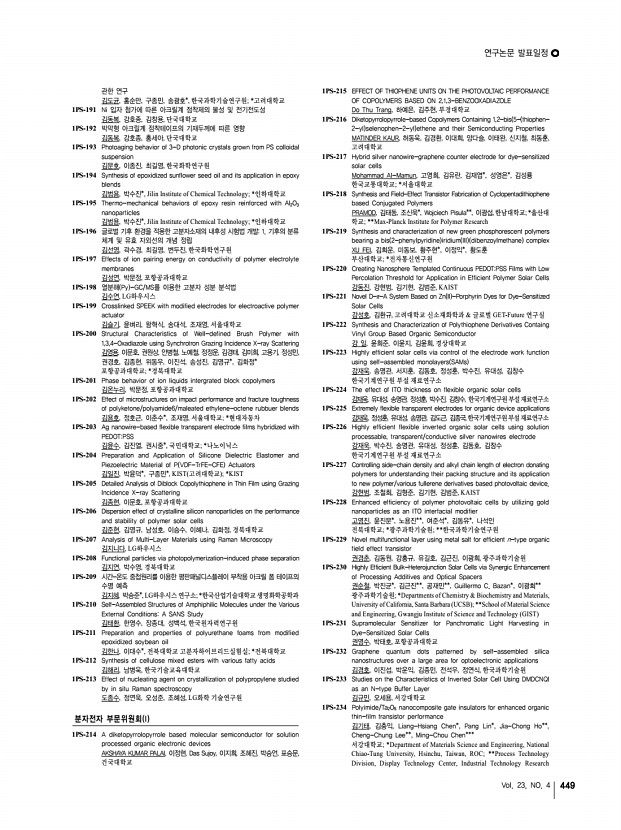 ... 열적성질의 변화 박덕훈, 이현섭, 호남석유화학 1PS-111 Mechanochemistry of an Anthracene Carboxylic Acid Dimer-Based Polymer 박민아, 이광훈, 유환철, 송영규, 정찬문, 연세대학교 1PS-112 Dispersion and Alignment of SWNTs by Oligothiophene-Based Organogelator 박민영, 장지영, 서울대학교 1PS-113 Ladder형 폴리실세스퀴옥산을 이용한 비대칭 UF막의 제조 박상희, 백경열, 조영훈*, 이성수, 박호범*, 황승상, 조진한** 한국과학기술연구원; *한양대학교; **고려대학교 1PS-114 Synthesis and Characterization of a Fluorinated Oligosiloxanecontaining Encapsulation Material for Organic Field-Effect Transistors, Prepared via a Non-Hydrolytic Sol-Gel Process 박선욱, 남수지, 김래호, 박미정, 김지예, 안태규, 윤원민, 장재영, 박찬언 포항공과대학교 1PS-115 Synthesis and characteristics of anion exchange membrane based on aminated vinylbenzyl chloride-co-styrene-co-hydroxyethyl acry...
