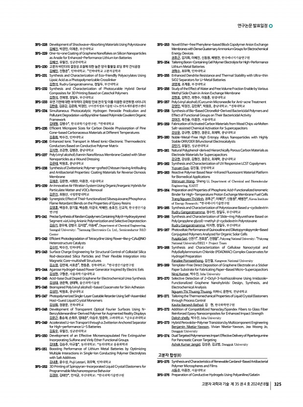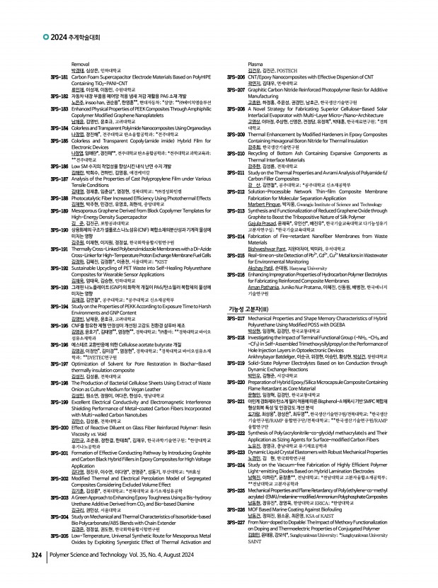 ...3PS-183 Enhanced Physical Properties of PEEK Composites Through Amphiphilic Copolymer Modified Graphene Nanoplatelets 남채윤, 김영빈, 윤호규, 고려대학교 3PS-184 Colorless and Transparent PolyimideNanocomposites UsingOrganoclays 나창엽, 장진해*, 전주대학교 탄소융합공학과; *전주대학교 3PS-185 Colorless and Transparent Copoly amide imide Hybrid Film for Electronic Devices 나창엽, 임애란*, 장진해**,전주대학교 탄소융합공학과; *전주대학교 과학교육과; **전주대학교 3PS-186 Low SM 수지의 작업성을 향상시킨 내식 난연 수지 개발 김해란, 박희수, 전하빈, 김영용, 애경케미칼 3PS-187 Analysis of the Properties of Cast Polypropylene Film under Various Tensile Conditions 김태영, 정재훈, 임춘삼*, 염정현, 경북대학교; *㈜경성화인켐 3PS-188 Photocatalytic Fiber Increased Efficiency Using Photothermal Effects 김채현, 박주현, 민경선, 유영호, 최현석, 중앙대학교 3P...