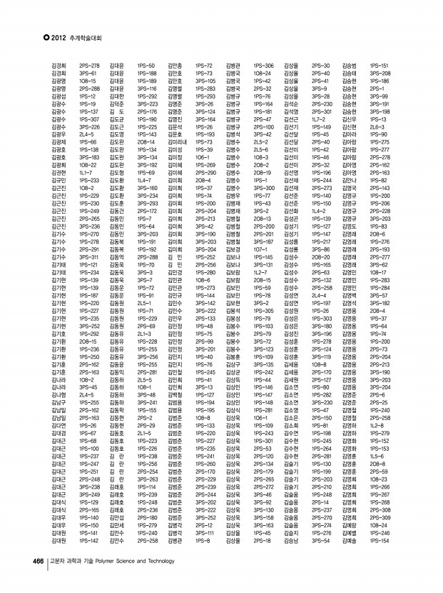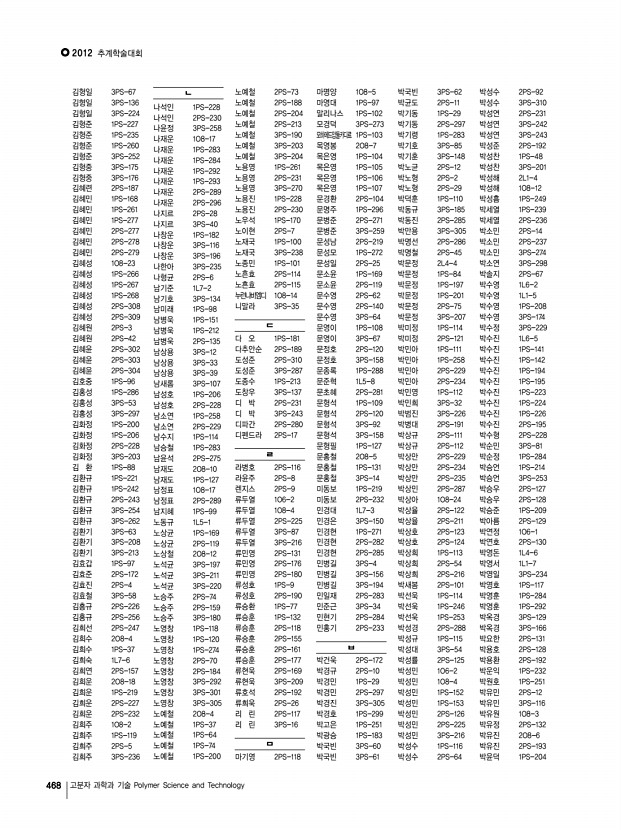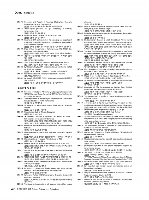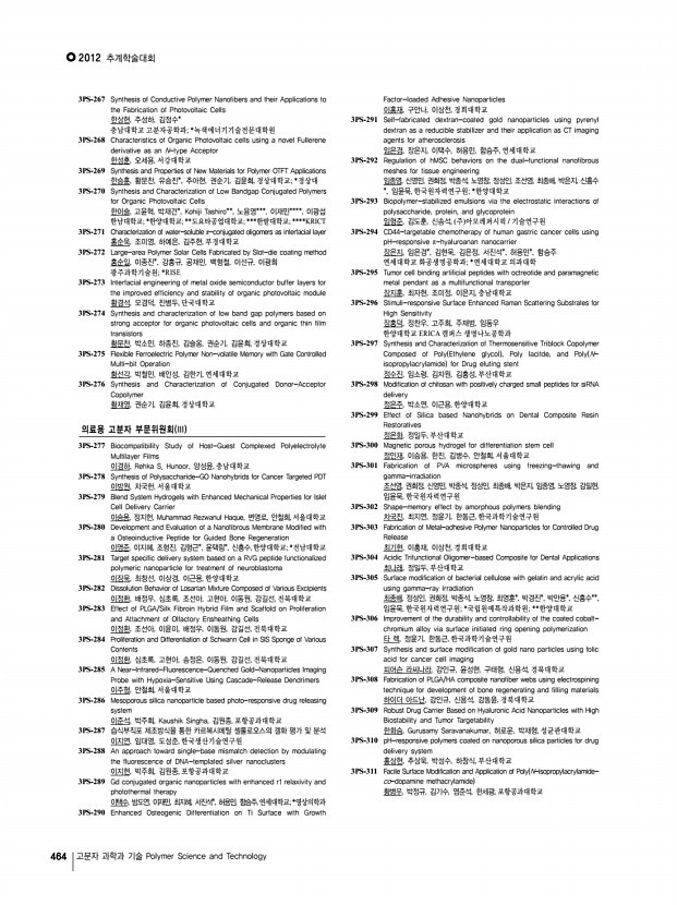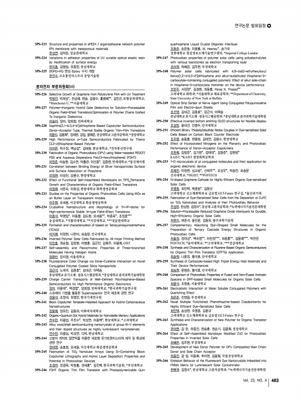 ... Inkjet Printing Method 이진호, 권순철, 김정환, 이병훈, 김근진, 김희주, 이광희, GIST 3PS-237 Self-assembly and Piezochromic Properties of Three-branched Molecules Having Halogen Atoms 임윤빈, 장지영, 서울대학교 3PS-238 Fluorescence Color Change via Imine-Cysteine Interaction on Novel Conjugated Polymer Coated Silica Nanoparticle 장근석, 노재국, 김종호*, 김대근, 이택승 충남대학교 유기소재 ․ 섬유시스템공학과; *충남대학교 분석과학기술대학원 3PS-239 Charge Carrier Transports of Well-Defined Polythiophene-Based Semiconductors for High Performance Organic Electronics 장미, 이윤재*, 백경열*, 양회창, 인하대학교; *한국과학기술연구원 3PS-240 스프레이 기법을 활용한 Supercapacitor 전극 제조에 관한 연구 장윤석, 조정대, 최영만, 한국기계연구원 3PS-241 Block Copolymer Template-Assisted Approach for Hybrid Carbonaceous Nanostructures 장윤희, 장유진, 김동하,...