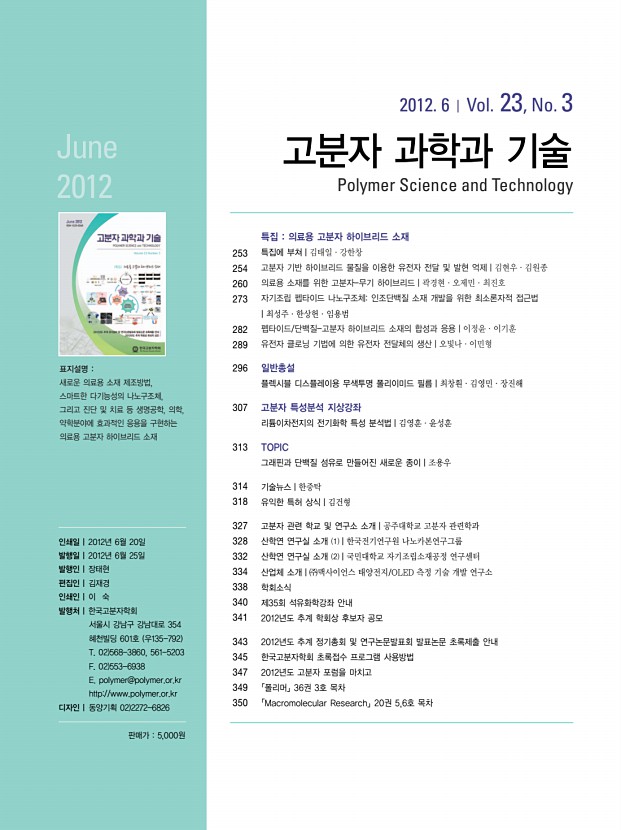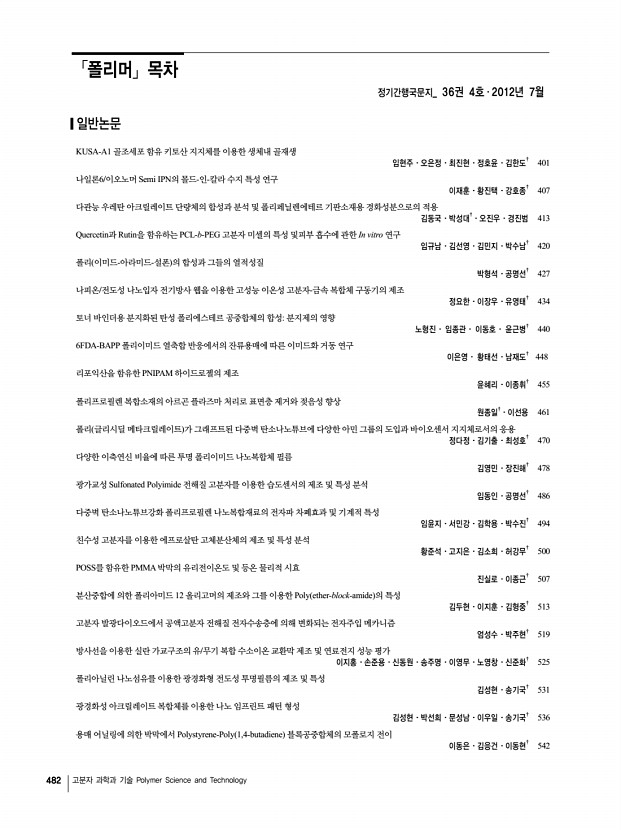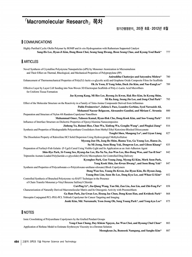 484 고분자 과학과 기술 Polymer Science and Technology 「Macromolecular Research」목차 정기간행영문지_ 20권 8호 ․ 2012년 8월 COMMUNICATIONS Highly Purified Cyclic Olefin Polymer by ROMP and In situ Hydrogenation with Ruthenium Supported Catalyst Sang-Ho Lee, Hyun-Ji Kim, Dong Hoon Choi, Seung Sang Hwang, Heon Seung Chae, and Kyung-Youl Baek* 777 ARTICLES Novel Synthesis of Crystalline Polystyrene Nanoparticles nPS by Monomer Atomization in Microemulsion and Their Effect on Thermal, Rheological, and Mechanical Properties of Polypropylene PP Aniruddha Chatterjee and Satyendra Mishra* 780 Enhancement of Thermomechanical Properties of Poly D,L-lactic-co-glycolic acid and Graphene Oxide Composite Films for Scaffolds Ok Ja Yoon, Il Yung Sohn, Duck Jin Kim, and Nae-EungLee* 789 Effective Layer by Layer Cell Seeding into Non-Woven 3D Electrospun Scaffolds of Poly-L-Lactic Acid Microfibers for Uniform Tissue Formation Jae Kyeong Kang, Mi Hee Lee, Byeong Ju Kwon, Hak Hee ...