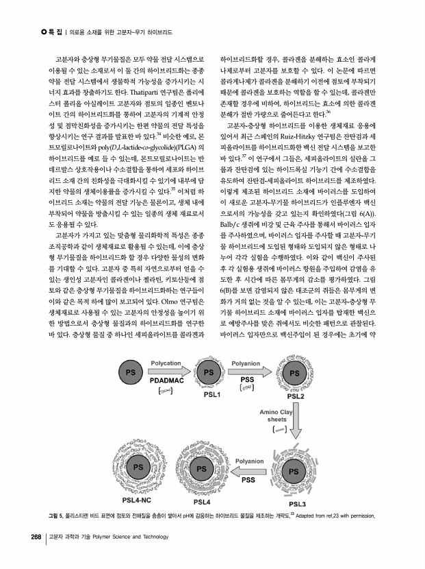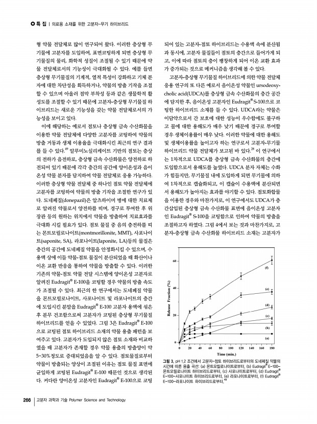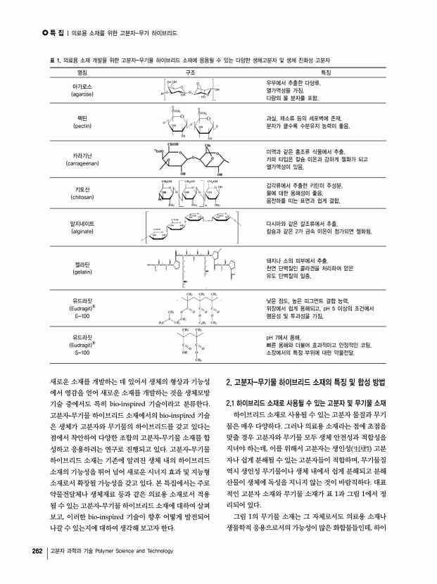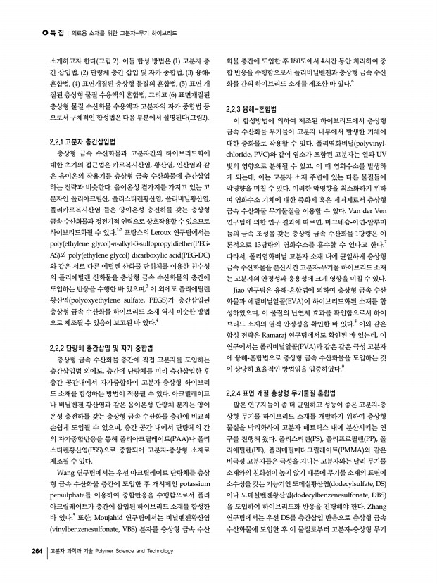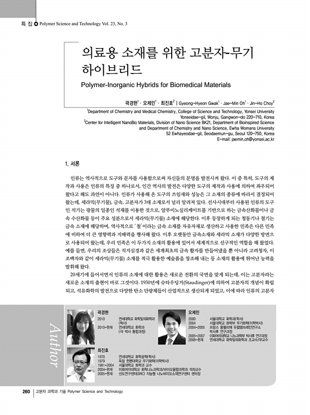 특 집 Polymer Science and Technology Vol. 23, No. 3 260 고분자 과학과 기술 Polymer Science and Technology 의료용 소재를 위한 고분자-무기 하이브리드 Polymer-Inorganic Hybrids for Biomedical Materials 곽경현1·오제민1·최진호2 | Gyeong-Hyeon Gwak1·Jae-Min Oh1·Jin-Ho Choy2 1 Department of Chemistry and Medical Chemistry, College of Science and Technology, Yonsei University Yonseidae-gil, Wonju, Gangwon-do 220-710, Korea 2 Center for Intelligent NanoBio Materials, Division of Nano Science BK21, Department of Bioinspired Science and Department of Chemistry and Nano Science, Ewha Womans University 52 Ewhayeodae-gil, Seodaemun-gu, Seoul 120-750, Korea E-mailjaemin.oh@yonsei.ac.kr 곽경현 2010 연세대학교 화학및의화학과 학사 2010-현재 연세대학교 화학과 석․ 박사 통합과정 오제민 2000 서울대학교 화학과 학사 2004 서울대학교 화학부 무기화학 이학박사 2004-2005 프랑스 몽펠리에 유럽멤브레...
