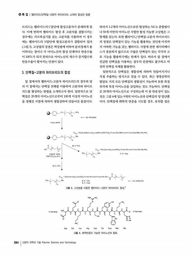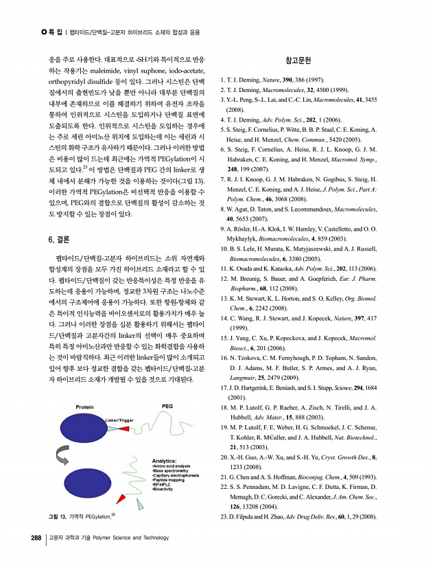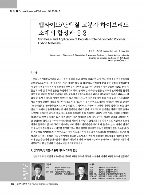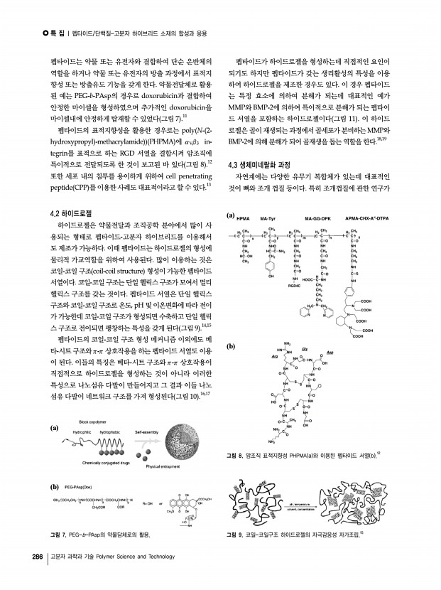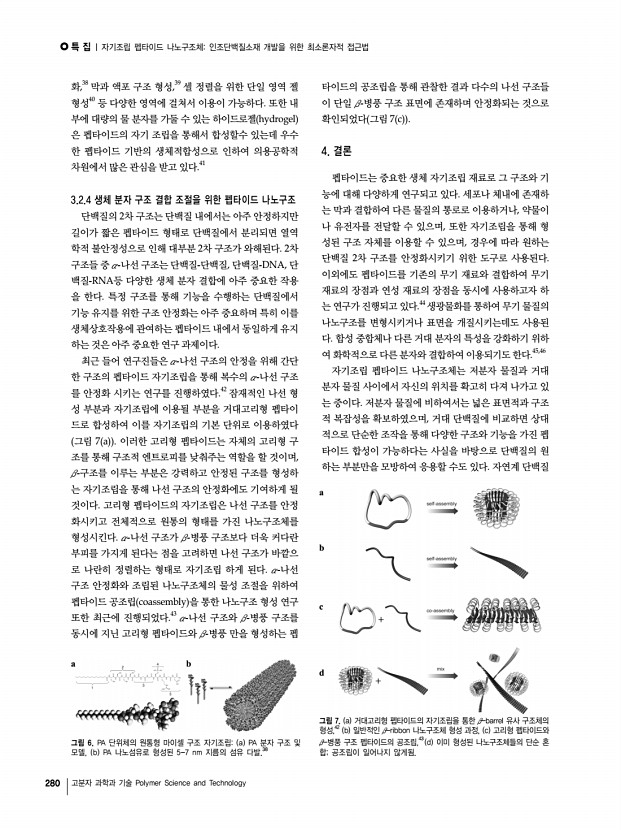 특 집 | 자기조립 펩타이드 나노구조체인조단백질소재 개발을 위한 최소론자적 접근법 280 고분자 과학과 기술 Polymer Science and Technology a b c d 그림 7. a 거대고리형 펩타이드의 자기조립을 통한 β-barrel 유사 구조체의 형성,42 b 일반적인 β-ribbon 나노구조체 형성 과정, c 고리형 펩타이드와 β-병풍 구조 펩타이드의 공조립,43 d 이미 형성된 나노구조체들의 단순 혼 합; 공조립이 일어나지 않게됨. a b 그림 6. PA 단위체의 원통형 마이셀 구조 자기조립a PA 분자 구조 및 모델, b PA 나노섬유로 형성된 5-7 nm 지름의 섬유 다발.38 화,38 막과 액포 구조 형성,39 셀 정렬을 위한 단일 영역 젤 형성40 등 다양한 영역에 걸쳐서 이용이 가능하다. 또한 내 부에 대량의 물 분자를 가둘 수 있는 하이드로젤 hydrogel 은 펩타이드의 자기 조립을 통해서 합성할수 있는데 우수 한 펩타...