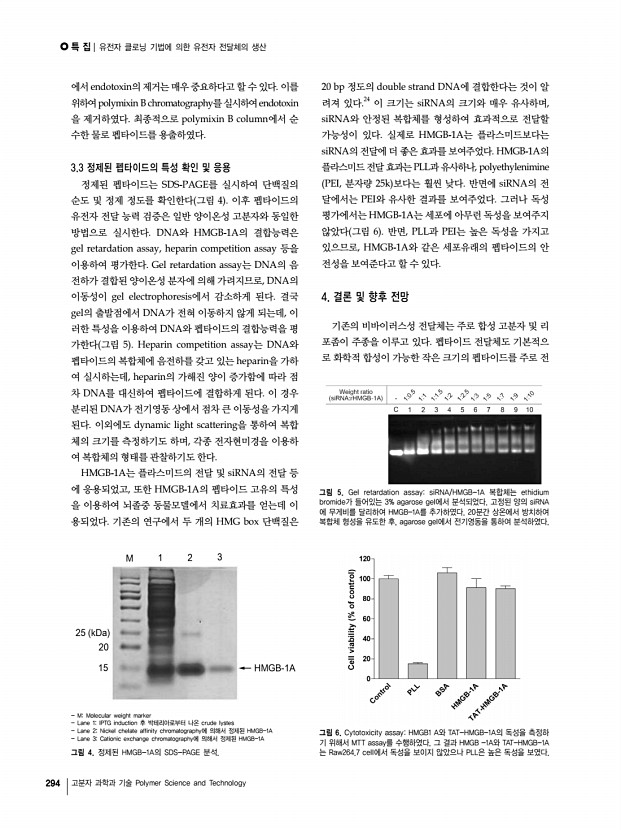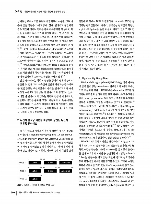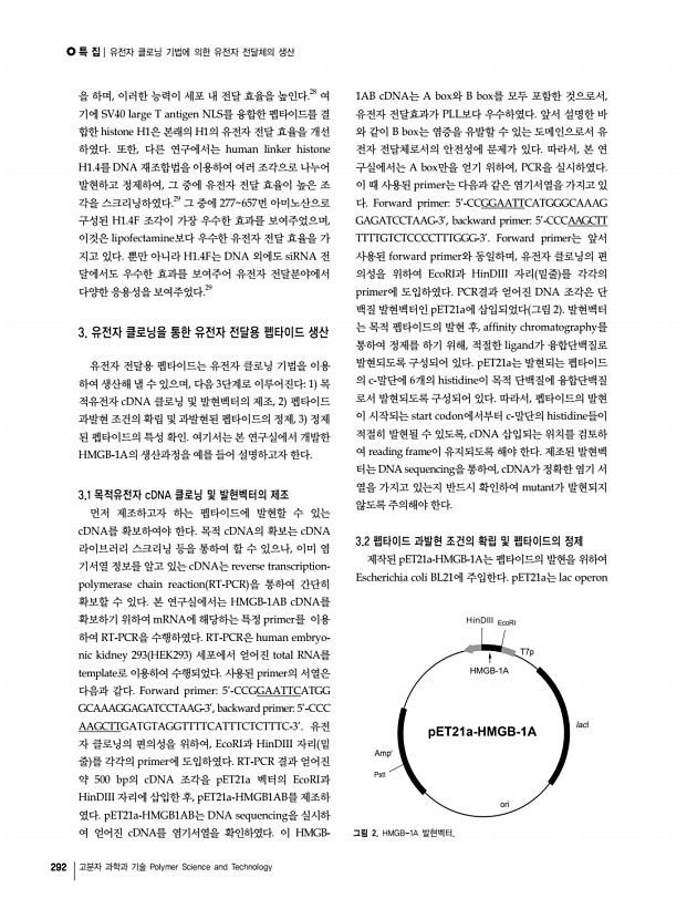 Polymer Science and Technology Vol. 23, No, 3 특 집 Vol. 23, No. 3 289 유전자 클로닝 기법에 의한 유전자 전달체의 생산 Production of Gene Carriers Using Gene Cloning Technology 오빛나⋅이민형 | Binna Oh⋅Minhyung Lee Department of Bioengineering, College of Engineering, Hanyang University 17 Haengdang-dong, Seongdong-gu, Seoul 133-791, Korea E-mailminhyung@hanyang.ac.kr 오빛나 2011 건국대학교 생명과학과 학사 2011-현재 한양대학교 생명공학과 석사과정 이민형 1992 서울대학교 화학과 학사 1994 서울대학교 화학과 석사 1999 서울대학교 화학과 박사 1999-2002 유타대학교 약대 박사후 연구원 2002-2003 유타대학교 약대 연구조교수 2003-2005 인하대학교 의대 전임강사 2005-현재 한양대학교 생명공학과 조교수/부교수 1. 서론 유전자 치료는 치료유전자를 세포 안으로 전달하여 질병을 치료하는 방법을 말한다. 현재 혈우병 등의 유...