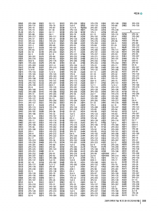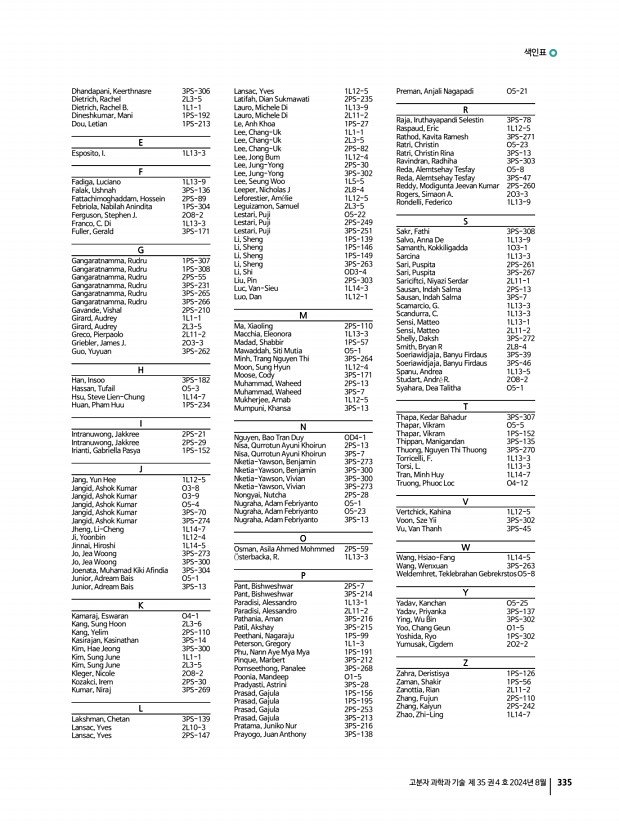 색인표 고분자 과학과 기술 제 35 권 4 호 2024년 8월 335 Dhandapani, Keerthnasre 3PS-306 Dietrich, Rachel 2L3-5 Dietrich, Rachel B. 1L1-1 Dineshkumar, Mani 1PS-192 Dou, Letian 1PS-213 E Esposito, I. 1L13-3 F Fadiga, Luciano 1L13-9 Falak, Ushnah 3PS-136 Fattachimoghaddam, Hossein 2PS-89 Febriola, Nabilah Anindita 1PS-304 Ferguson, Stephen J. 2O8-2 Franco, C. Di 1L13-3 Fuller, Gerald 3PS-171 G Gangaratnamma, Rudru 1PS-307 Gangaratnamma, Rudru 1PS-308 Gangaratnamma, Rudru 2PS-55 Gangaratnamma, Rudru 3PS-231 Gangaratnamma, Rudru 3PS-265 Gangaratnamma, Rudru 3PS-266 Gavande, Vishal 2PS-210 Girard, Audrey 1L1-1 Girard, Audrey 2L3-5 Greco, Pierpaolo 2L11-2 Griebler, James J. 2O3-3 Guo, Yuyuan 3PS-262 H Han, Insoo 3PS-182 Hassan, Tufail O5-3 Hsu, Steve Lien-Chung 1L14-7 Huan, Pham Huu 1PS-234 I Intranuwong, Jakkree 2PS-21 Intranuwong, Jakkree 2PS-29 Irianti, Gabriella Pasya 1PS-152 J Jang, Yun Hee 1L12-5 Jangid, Ashok Kumar O3-8 Jangid, Ashok Kumar O3-9 Jangid, Ashok Kumar O5-4 J...